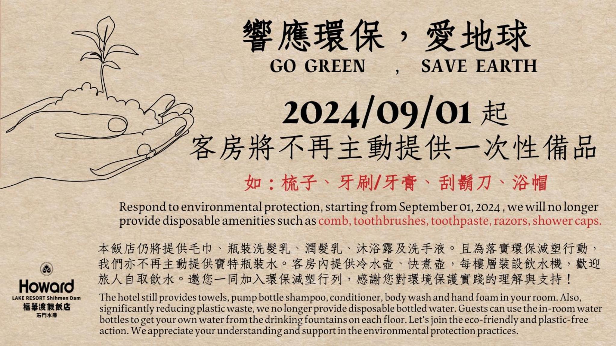 In accordance with local regulations in Taiwan, starting from September 1st, 2024, the property will no longer provide disposable or single-use amenities.