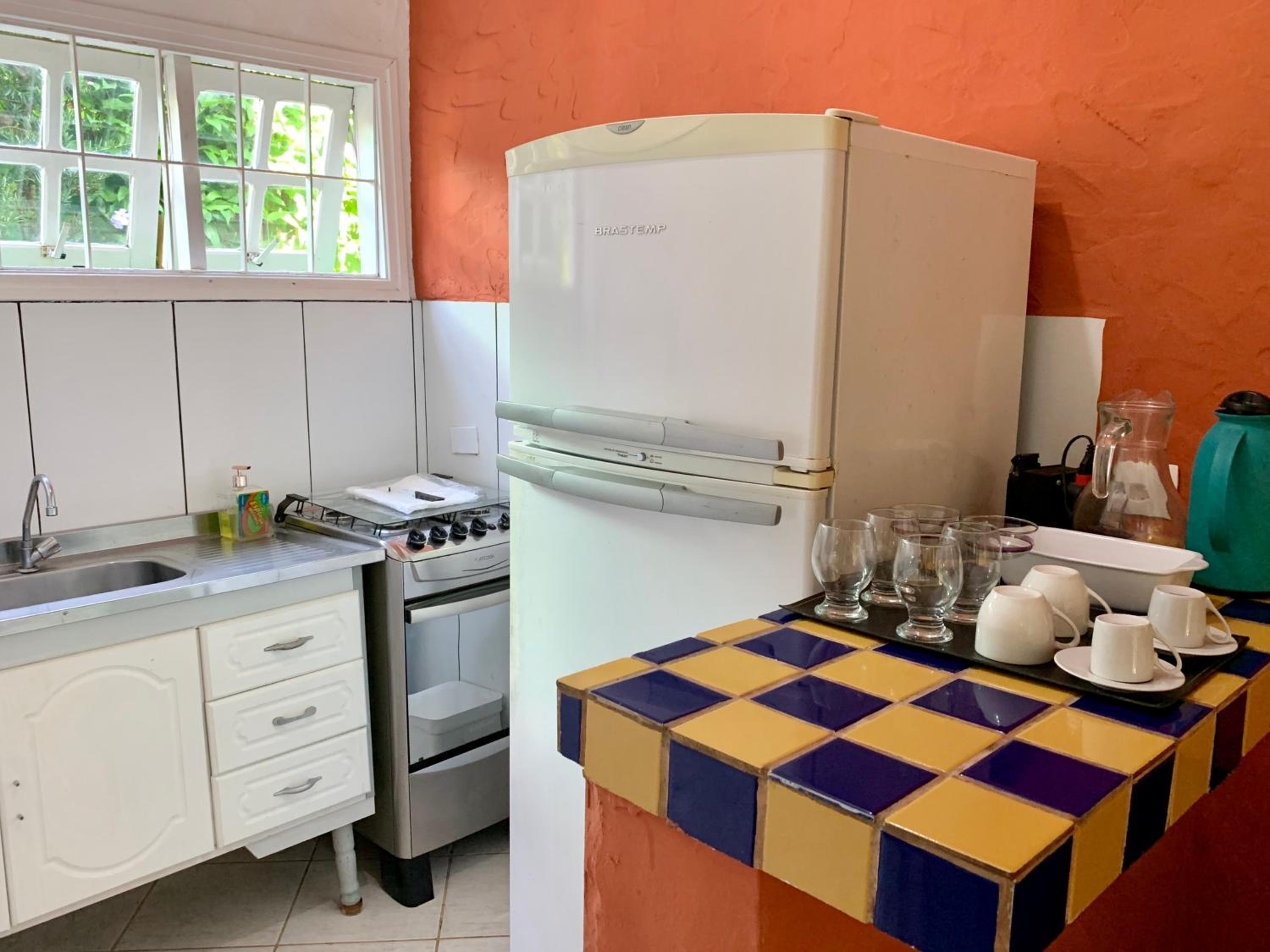 The apartments at Waimea Flats Maresias are equipped with essential amenities for a comfortable stay, including a fan, TV, and a well-equipped kitchen for your convenience.