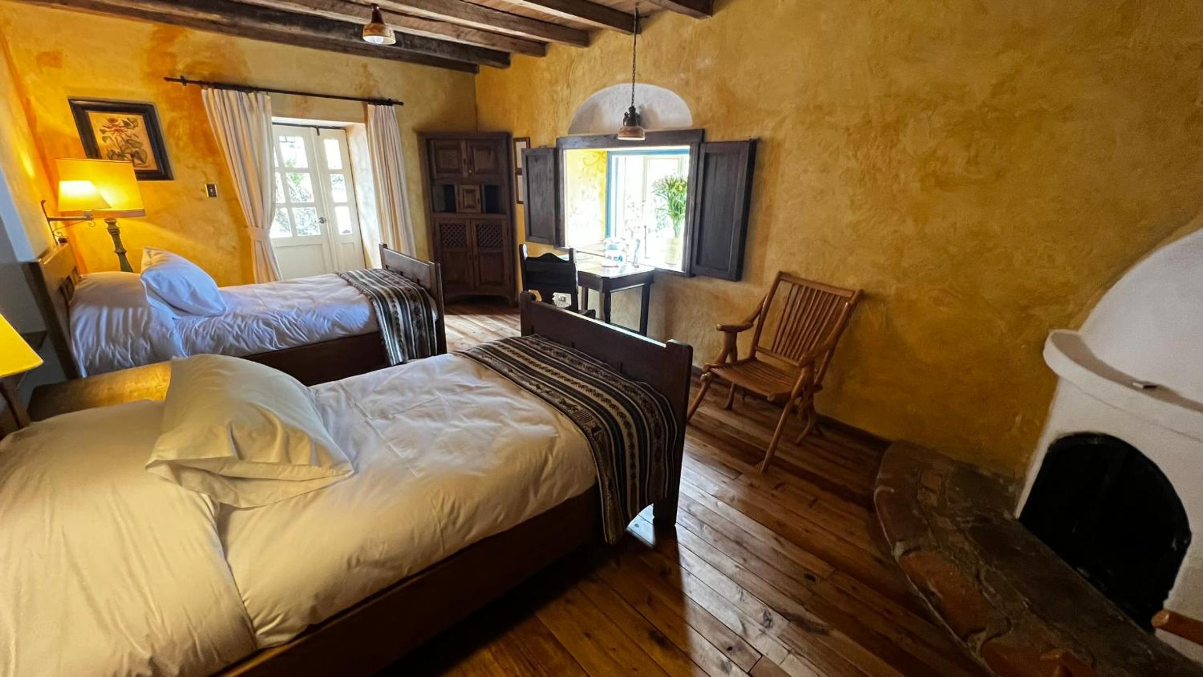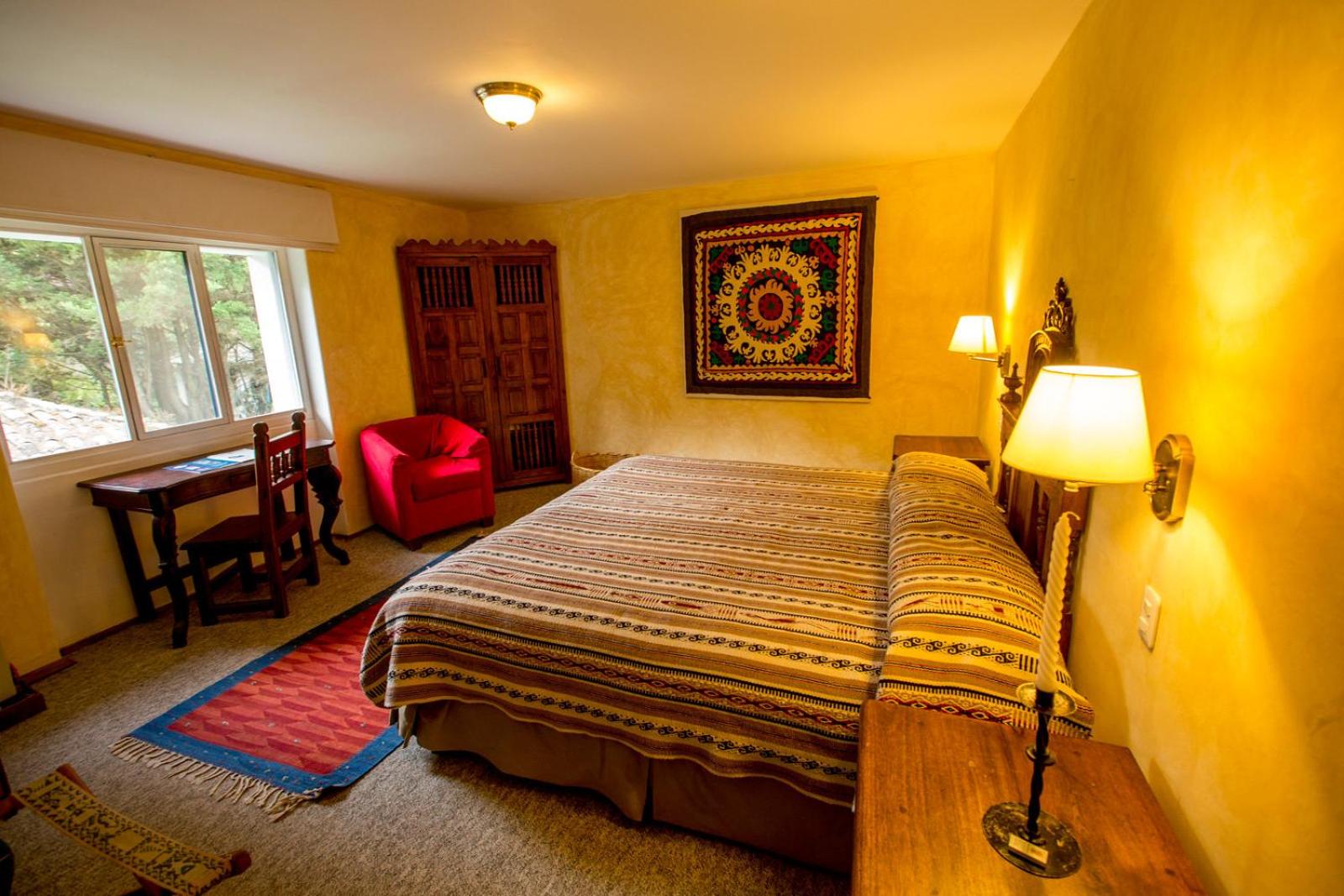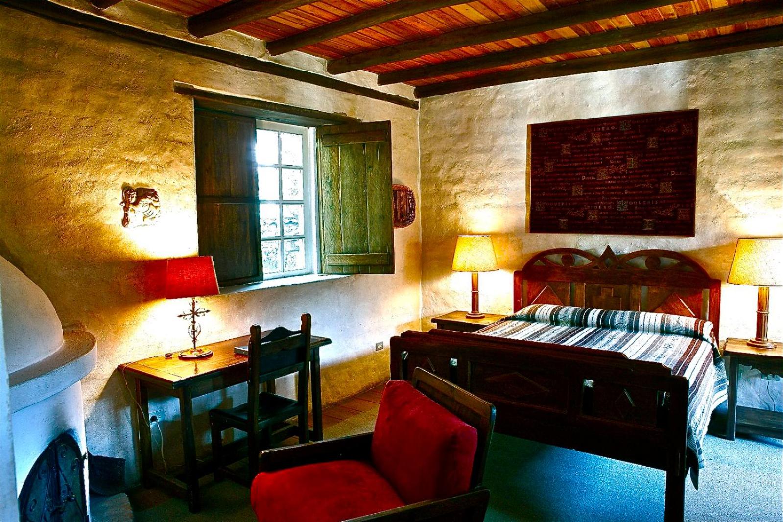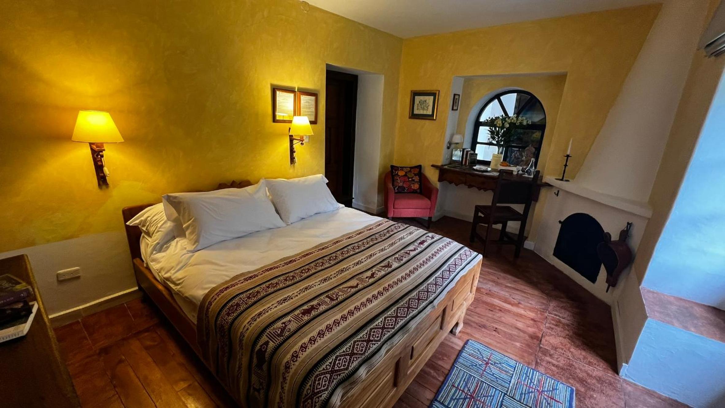 Cozy Andean-Themed Rooms: Each room at Cusin is adorned with beamed ceilings, Andean-themed decor, heating, and private balconies offering garden views. The antique wooden desks and handwoven bedspreads add a touch of authenticity and warmth.
