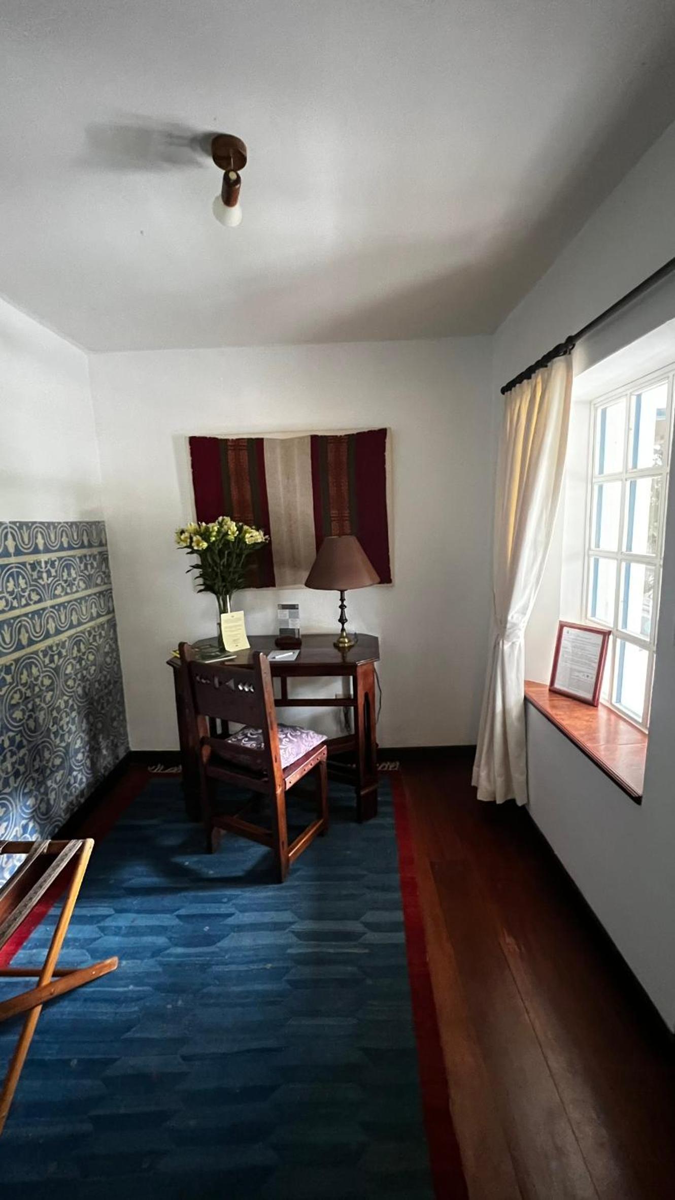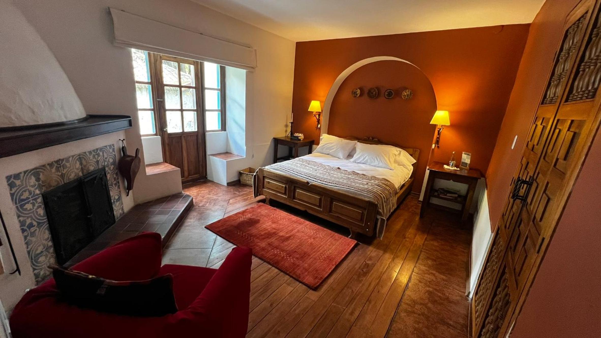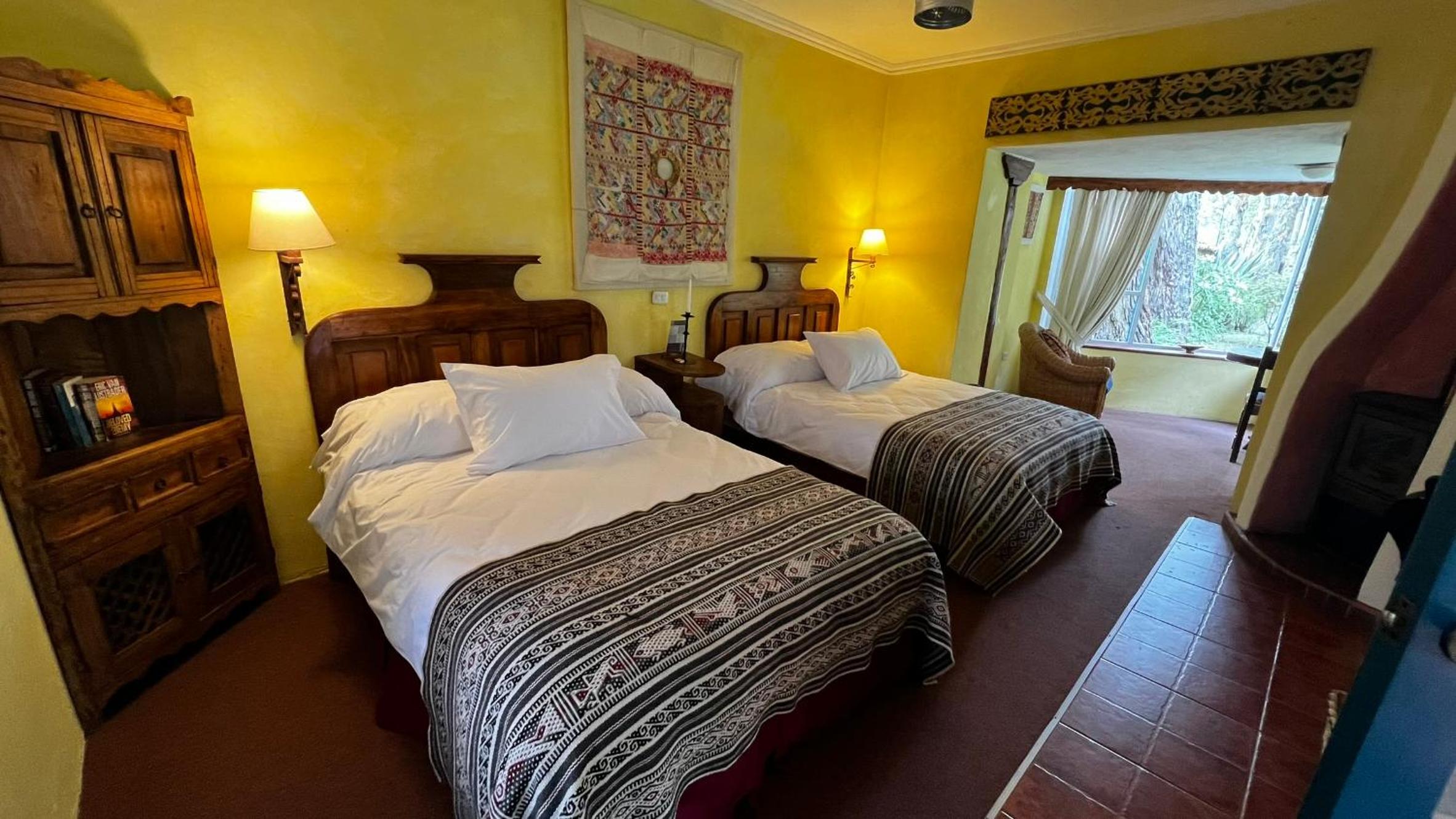 Cozy Andean-Themed Rooms: Each room at Cusin is adorned with beamed ceilings, Andean-themed decor, heating, and private balconies offering garden views. The antique wooden desks and handwoven bedspreads add a touch of authenticity and warmth.
