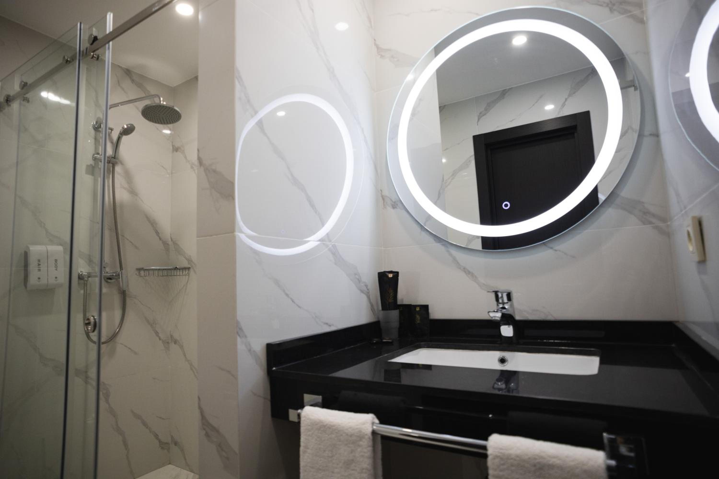 The rooms are equipped with everything you need for a comfortable stay, including air conditioning, a fridge, and a flat-screen TV. The bathrooms are stocked with luxurious amenities like bathrobes and slippers.