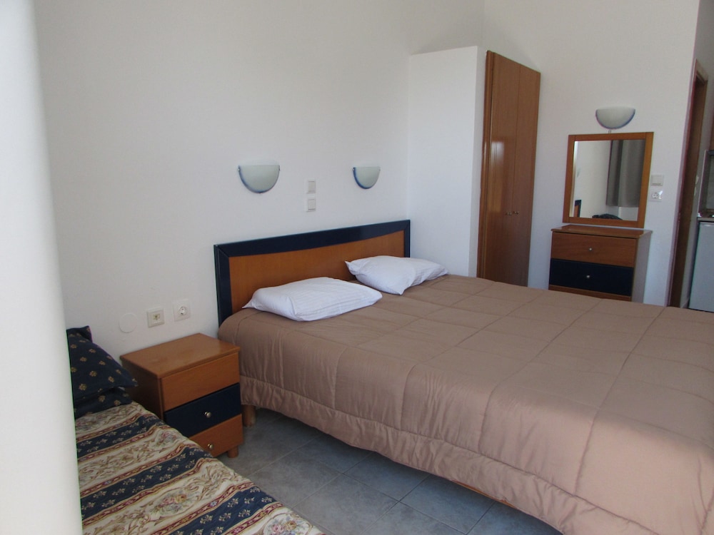 De kamer is zeer simpel doch zeer proper met elke dag onderhoud en (overdreven) verversen van de handdoeken en lakens om de 2-3 dagen. Het personeel doet er wel alles aan om zijn klanten tevreden te stellen. Er was geen afwasgerief voorzien doch na aandringen werd dit dezelfde dag nog voorzien. Ook onze koelkast werkte nog doch was langs binnen afgebroken op een aantal plaatsen. Deze werd de volgende dag vervangen door een nieuwe koelkast die in Rhodos afgehaald werd! De keukenvoorzieningen blijven wel zeer beperkt en zijn niet geschikt als je zelf regelmatig wil koken.