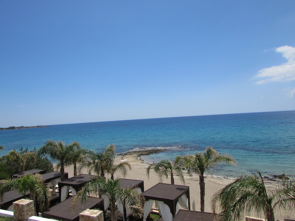 A lovely hotel, beautifully landscaped in an excellent location. With direct access onto a practically private beach. It had several grassed terraces, the first one with big lovely cabana's (posh sunbeds like four poster beds), which you could rent for 8.50 euros, then a second terrace with free sunbeds, parasols and palm trees. The beach is great, quite sandy, and mainly sand in the sea. The pool was good, and the food in the restaurant was lovely, however as we were on a tight budget we couldn't afford to eat there every day, evening main meals were 10 euros and over and we needed to eat for 7 and under to stay in budget