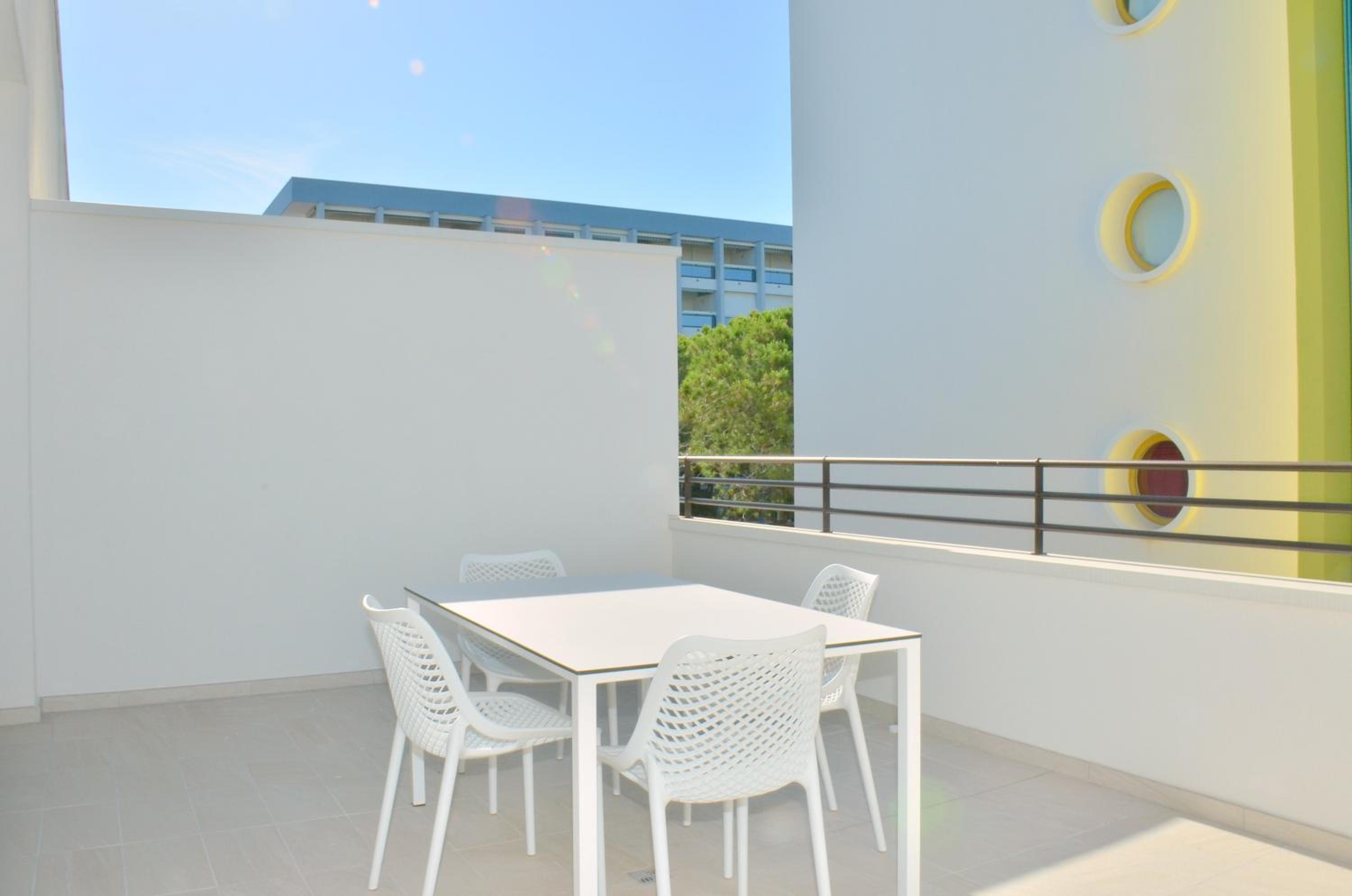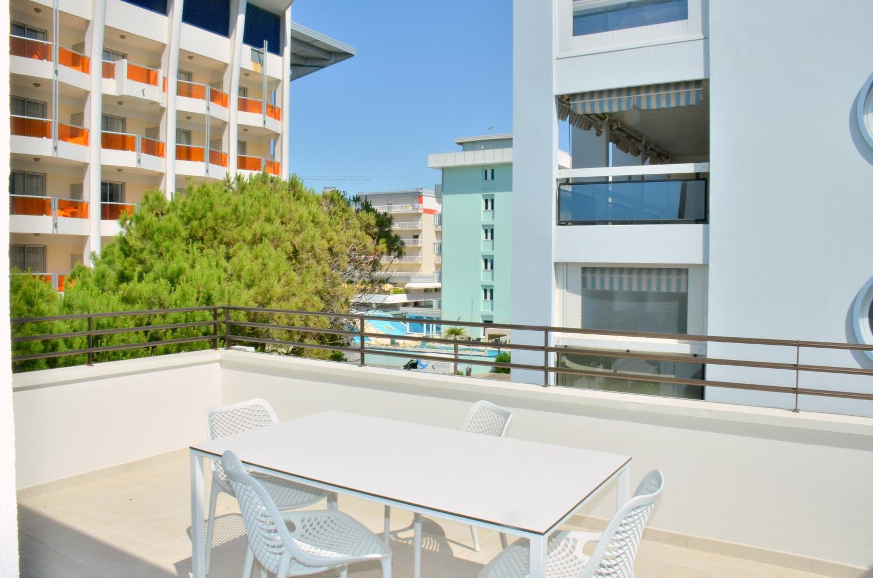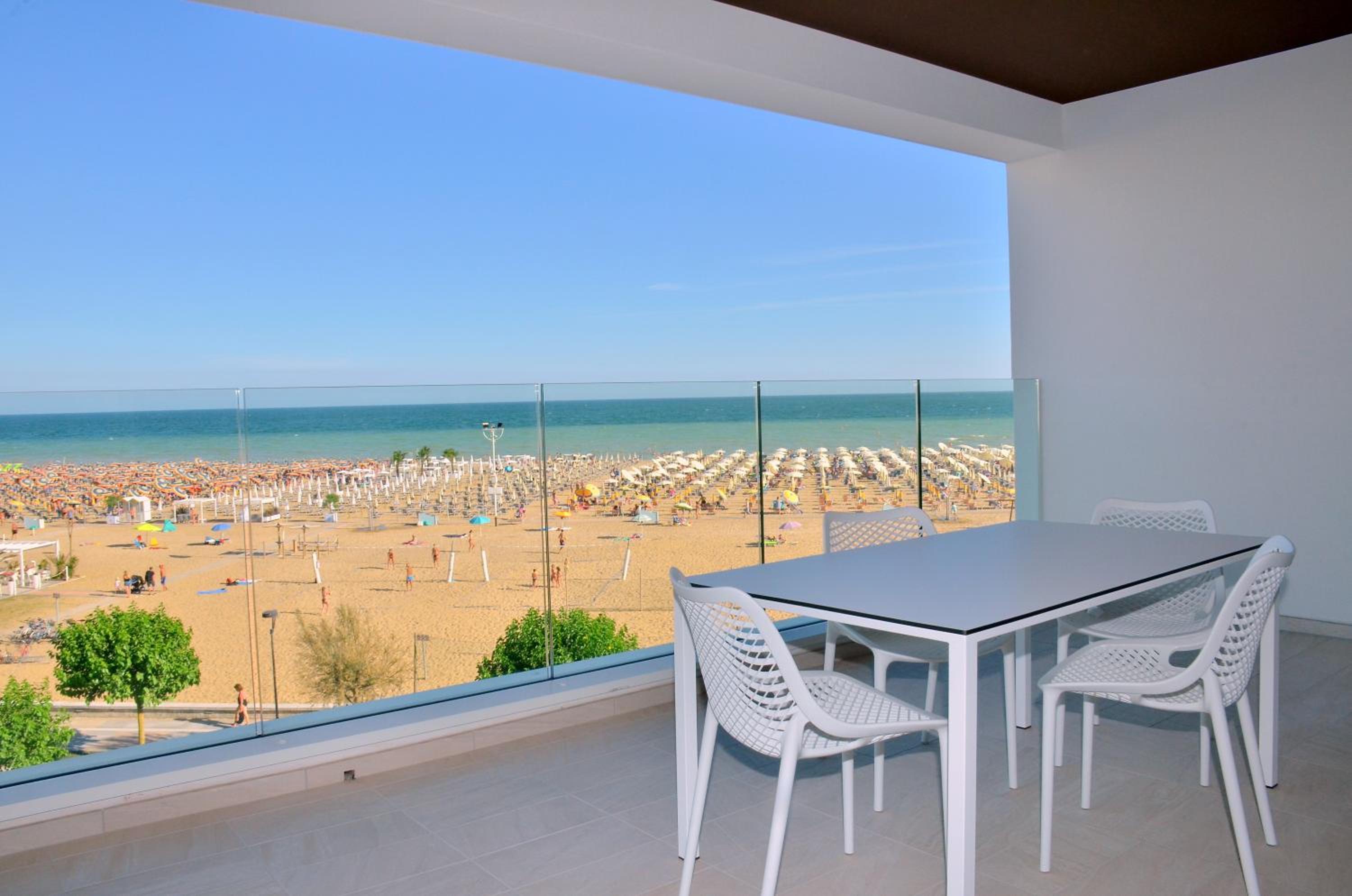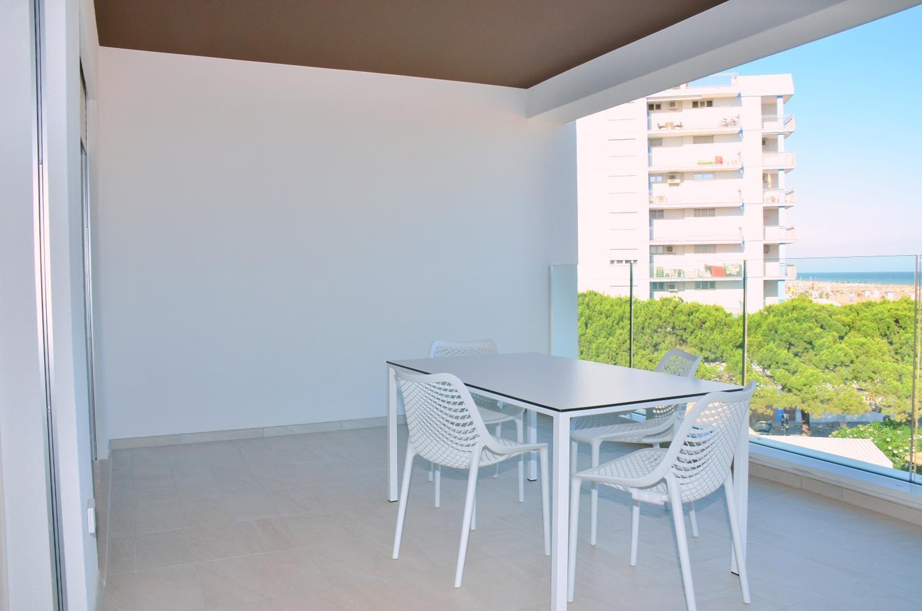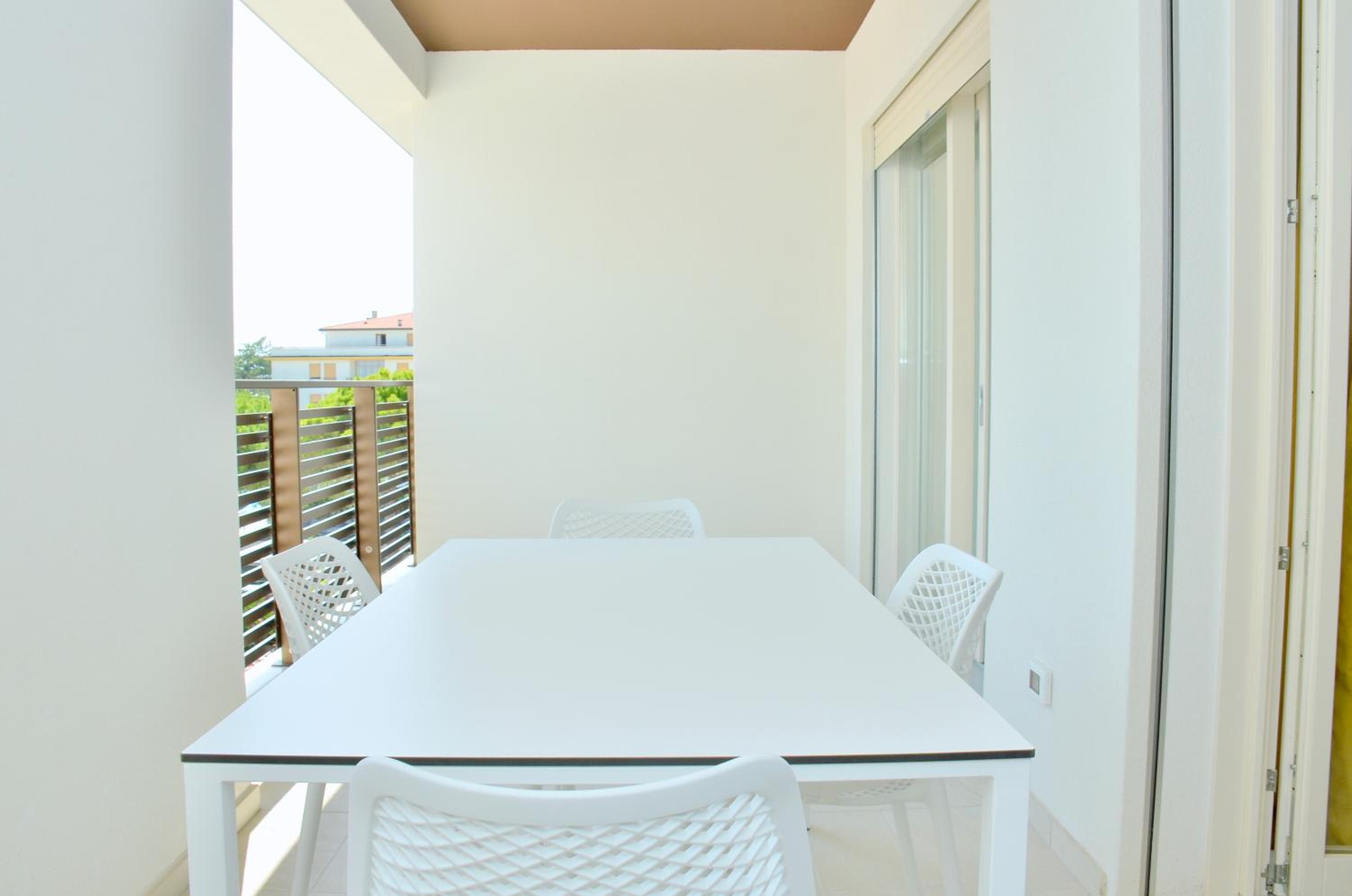 Il terrazzo dell'appartamento, il fatto che la struttura fosse fronte spiaggia e a pochi passi dalla strada principale di Bibione. Il design della