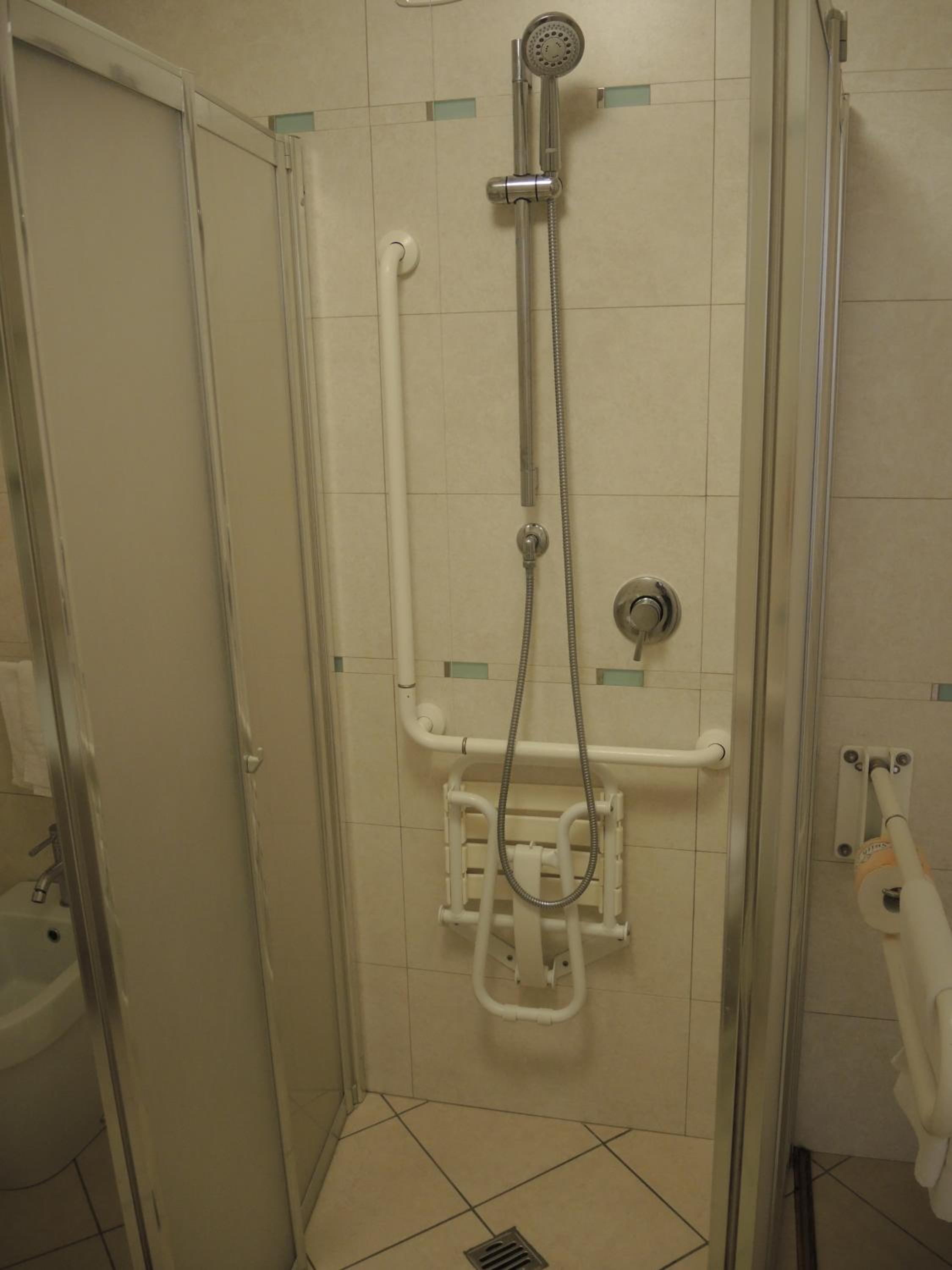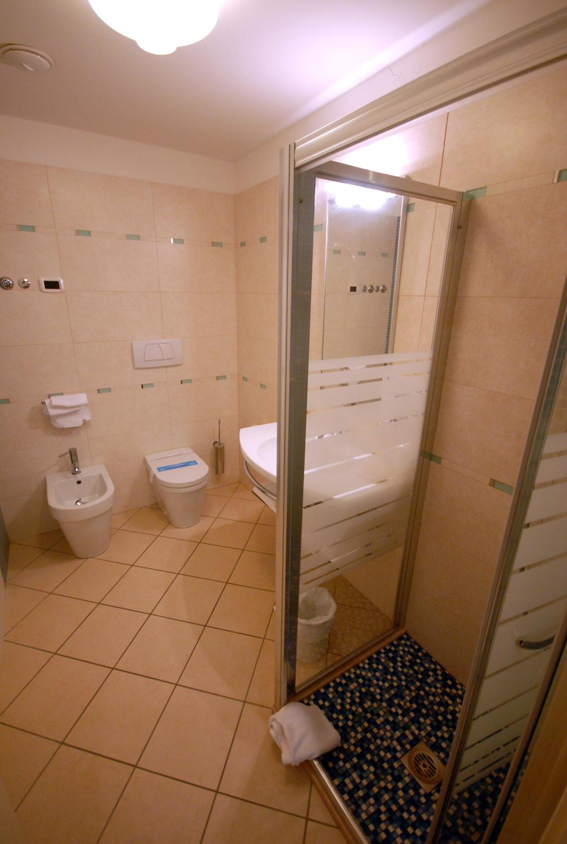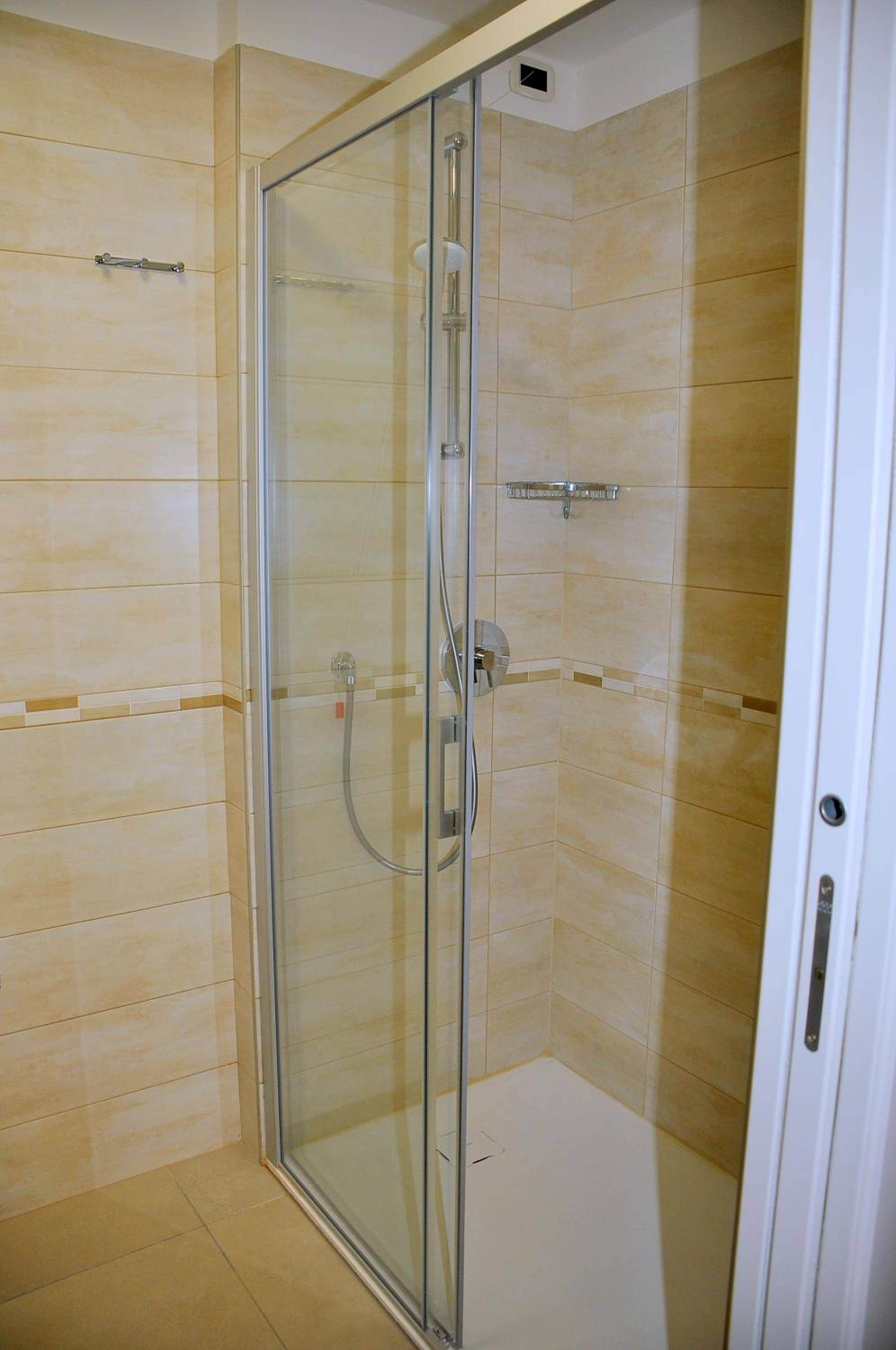 Rozkládací gauč ve velmi špatném stavu, obložení sprchy se dost loupe.