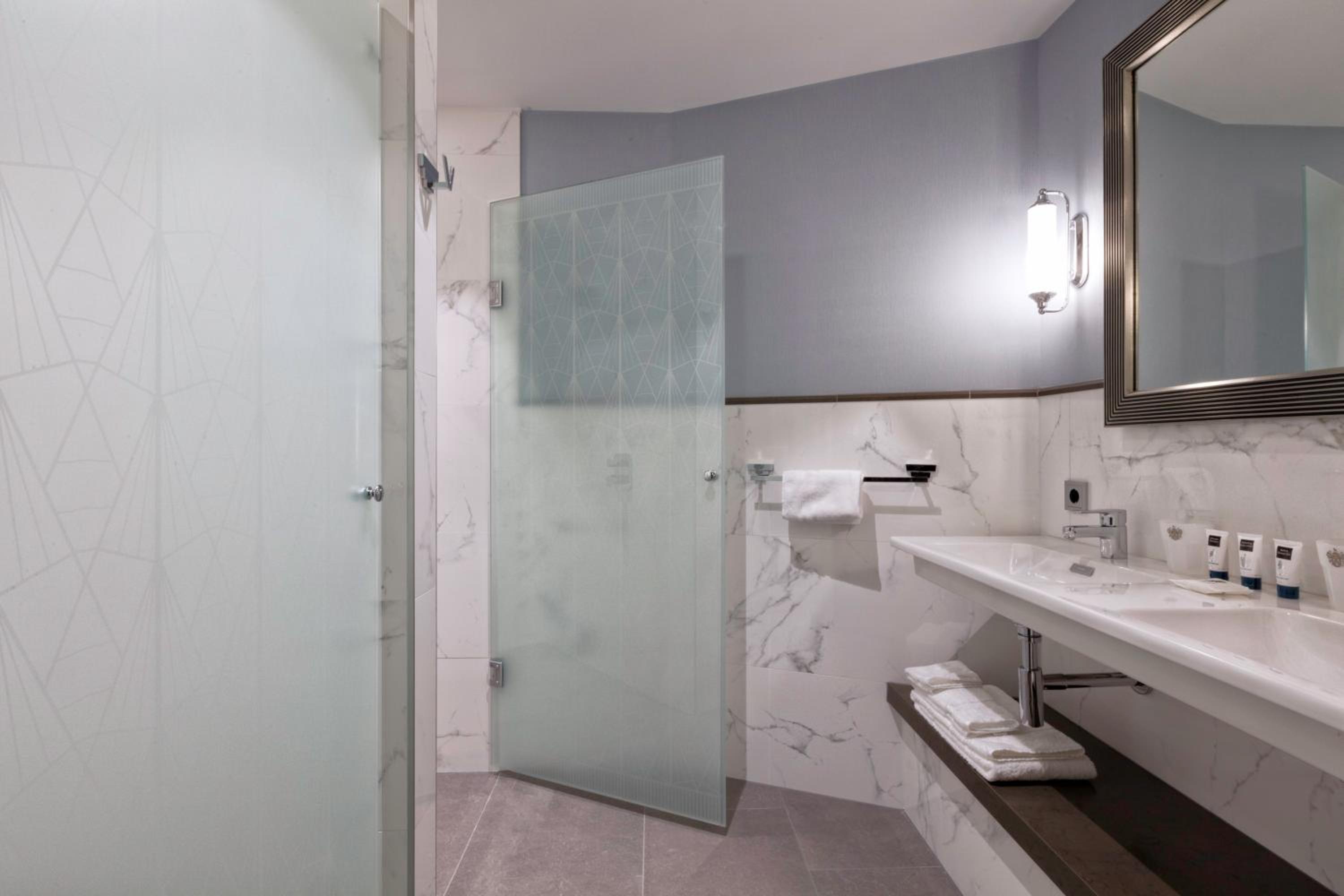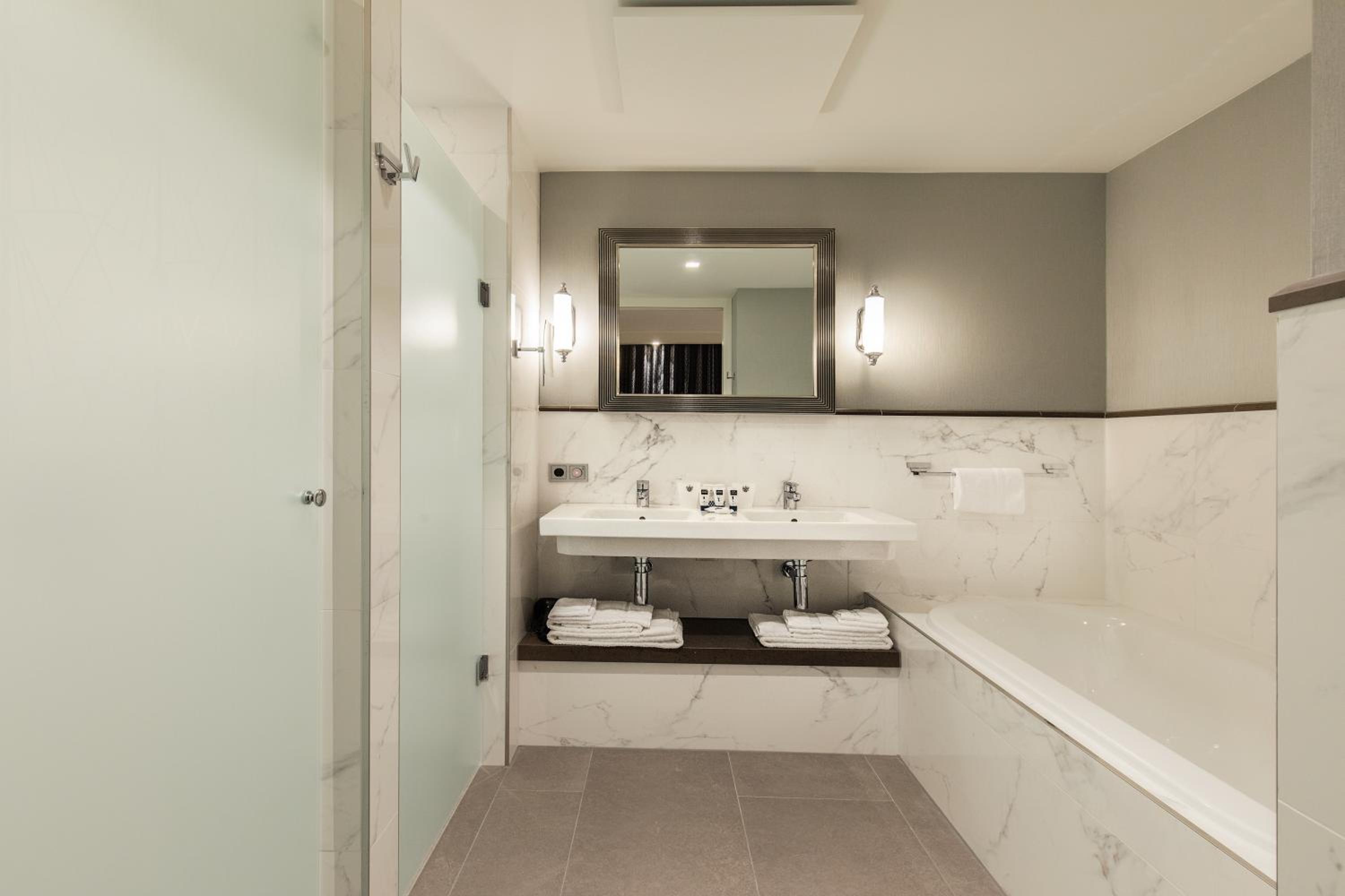Mooi, stijlvol gedecoreerd hotel. Goede geluidsisolatie dus heel stil op de kamer. Vrij goede prijzen in bar en restaurant voor zo'n chique hotel. Ideale ligging. Grote, luxe badkamer met een aparte WC en douche.