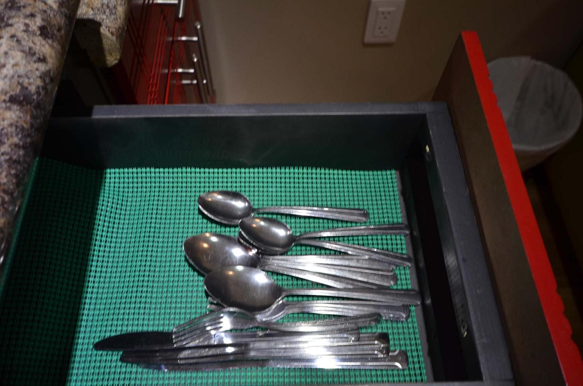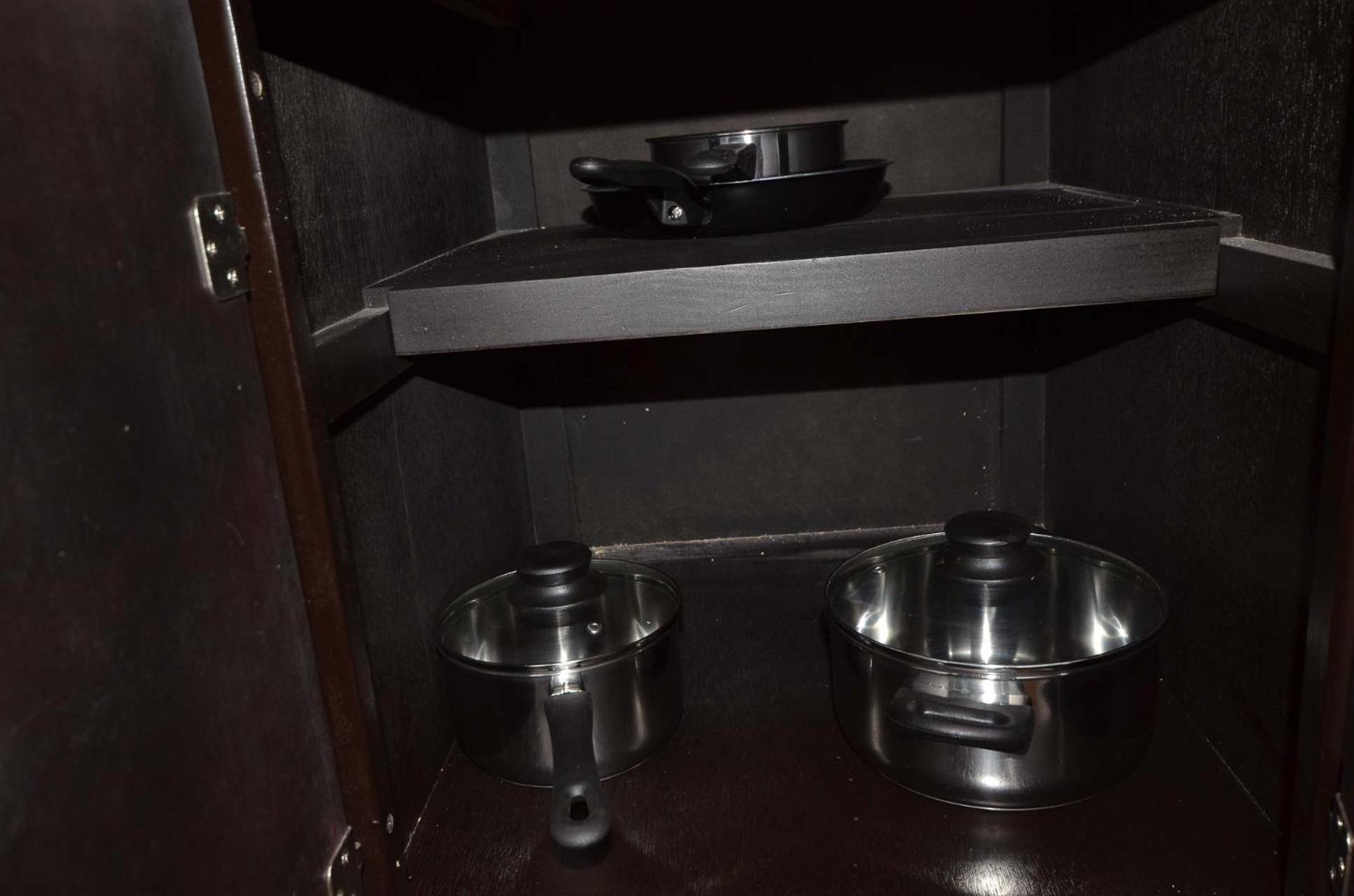 Stove, fridge, dishes, microwave, iron and even a desk.