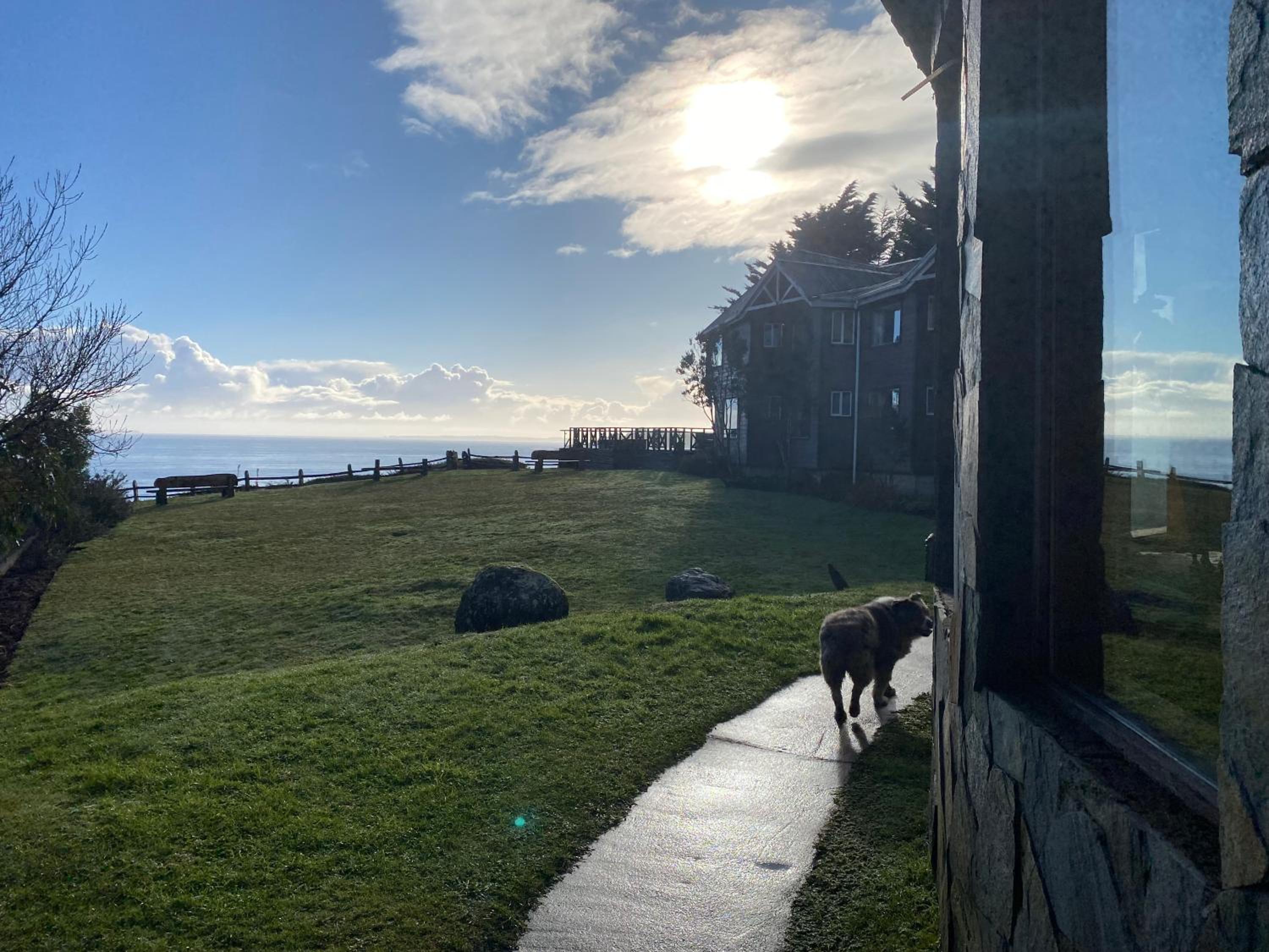 Sits on bluff ocean front. All rooms view ocean. Quiet with only ocean wave sounds. Secluded but not far from restaurants , etc. Great lodge sitting room with wood fire stove. Excellent hosts and breakfasts.