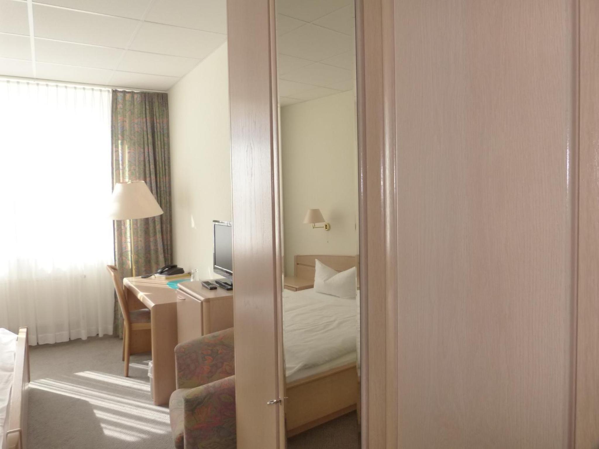 Otrzymałem bardzo przestronny pokój i dla mnie posiadał on bardzo wiele zalet. Łóżko bardzo mi odpowiadało jeśli chodzi o twardość materaca. Okno wychodziło na wewnętrzny parking, co powodowało, że w nocy było cicho i mogłem się wyspać. Parking był dostępny bez dodatkowych kosztów. W pokoju czekał na mnie czajnik i zestaw kawy i herbat oraz butelka wody, co było bardzo miłe, a jeszcze wiele hoteli, w których zdażało mi się zatrzymywać nie oferują swoim gościom takich udogodnień w pokoju. Dostępna też była mała lodówka. Bardzo dobrze działało hotelowe WiFi.