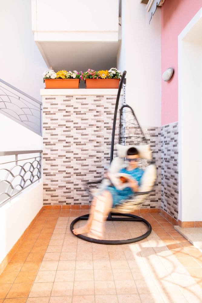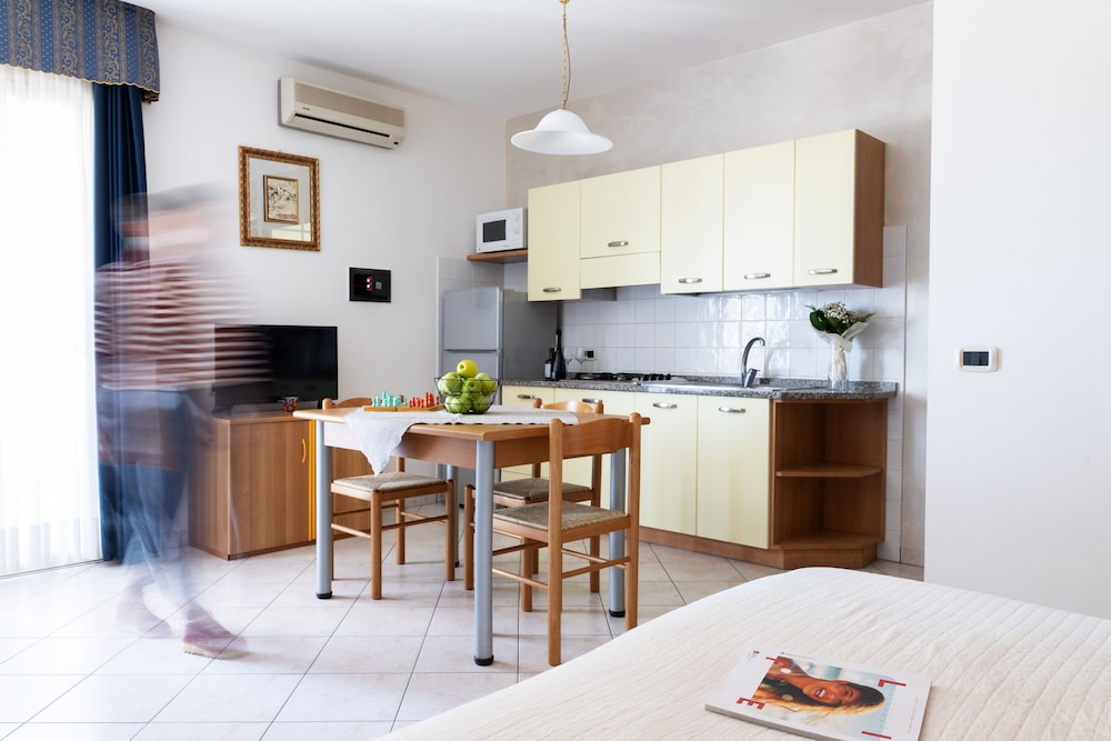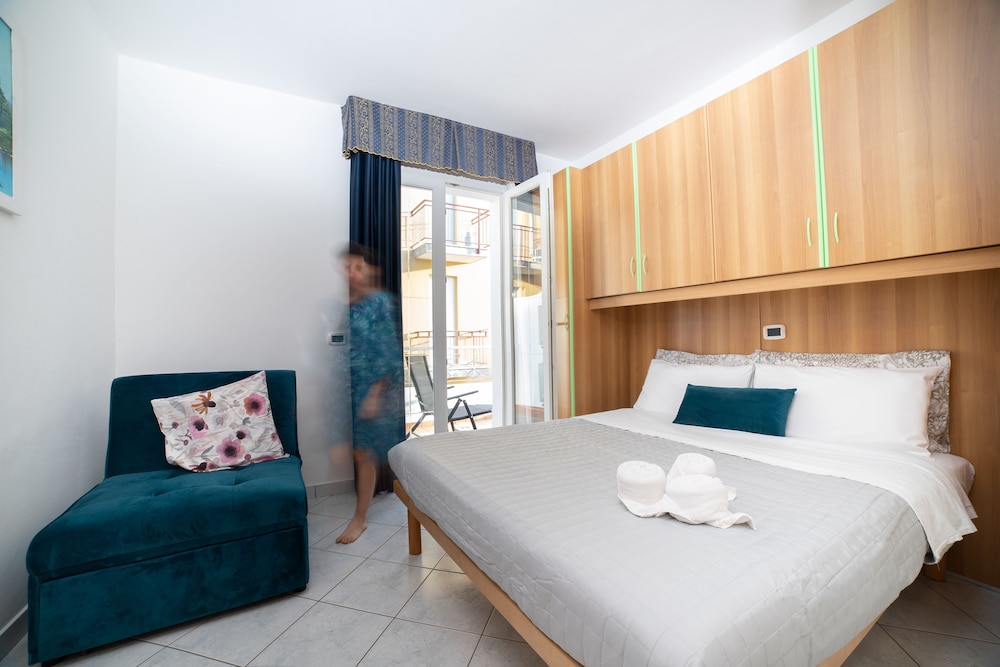Boede i en hotellejlighed, med stor altan ud mod gaden. Receptionisten tog sig tid til at vise værelset og hjælpe med parkering, som var under halvtag. God service. Billet til privat badestrand med solvogne og parasol var med i prisen. God beliggenhed i forhold til strand og byliv. Lækker morgenbuffet.