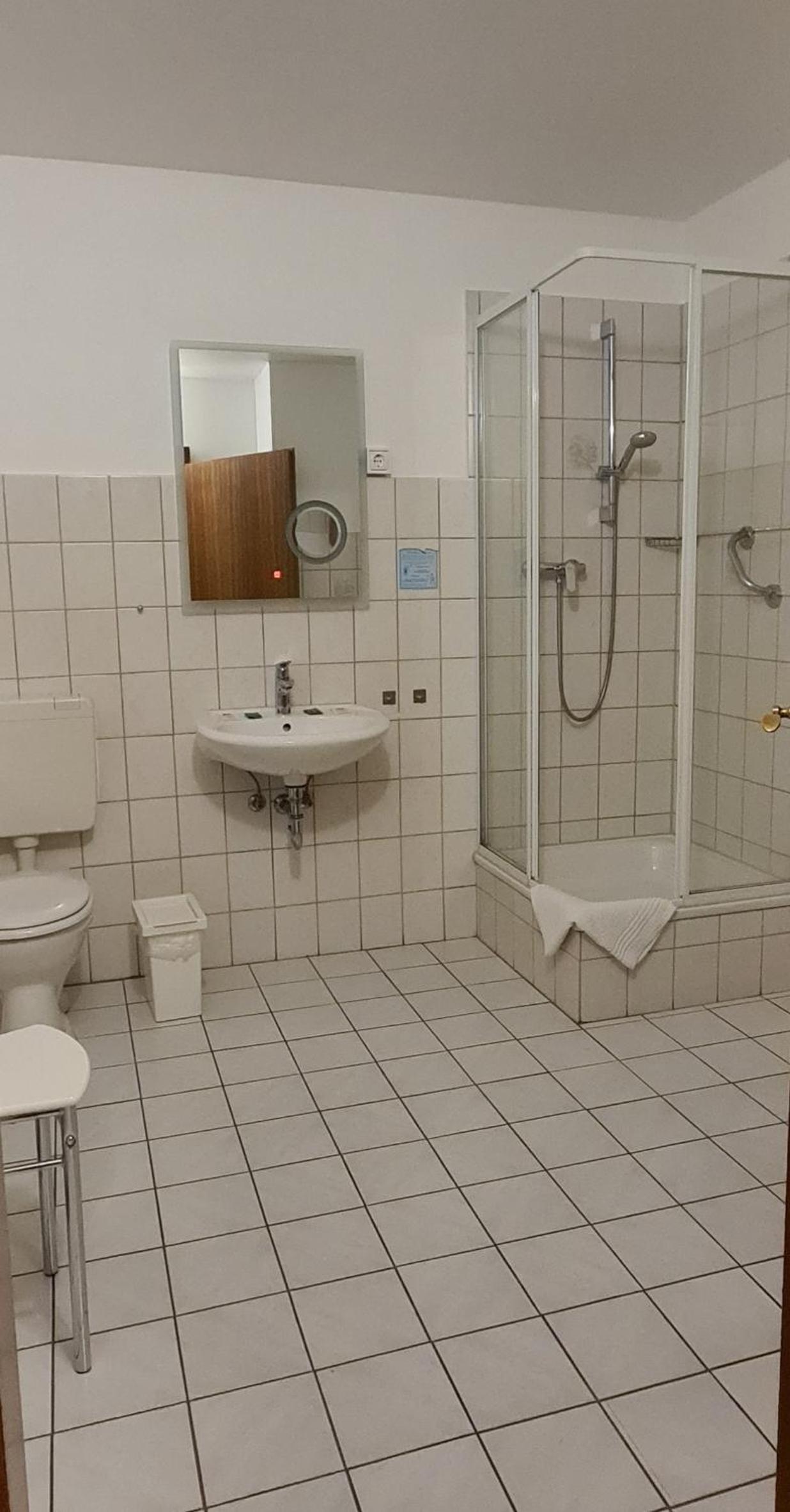 Große Sanitärzelle für 2 Zimmer außerhalb des Zimmers.