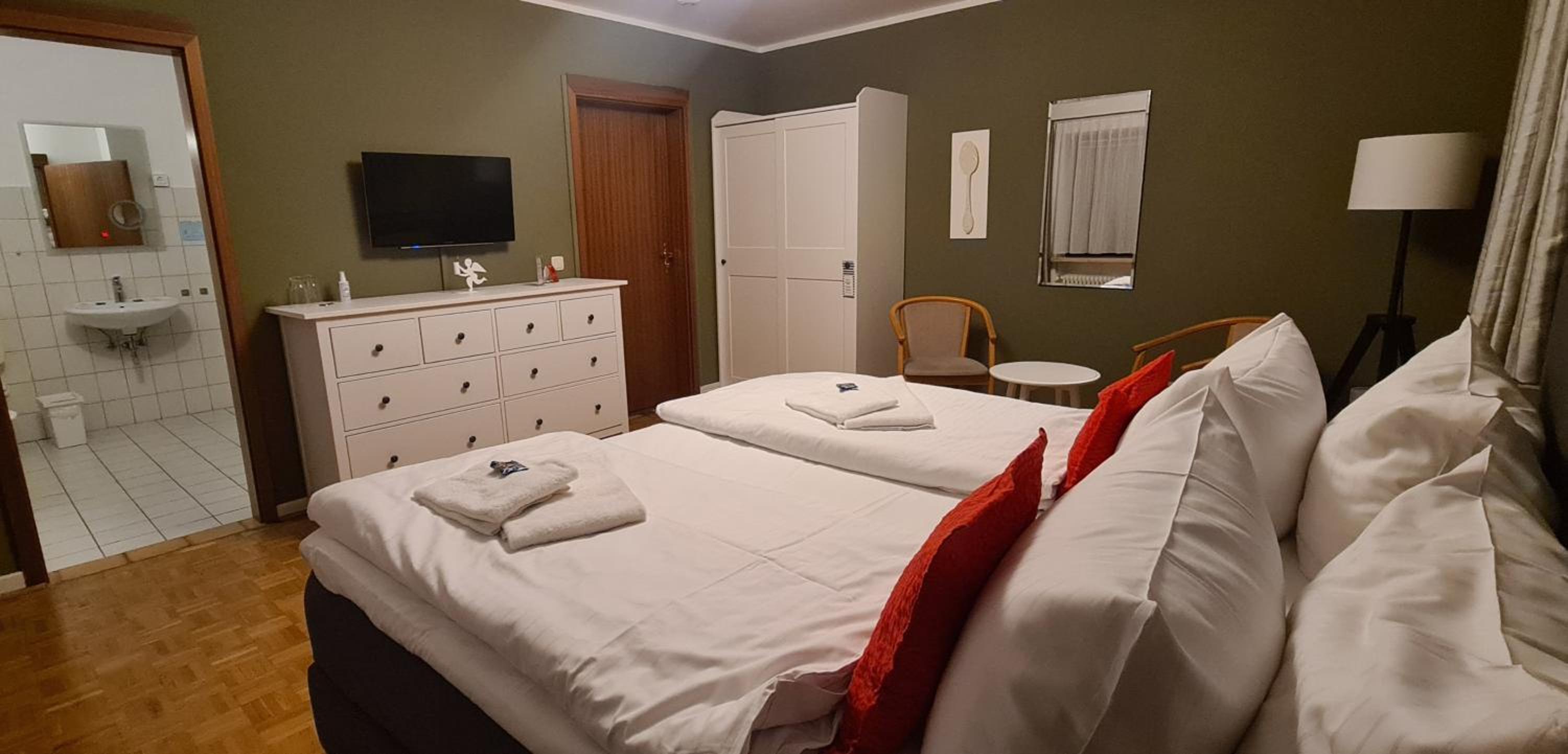 Stora bra rum. Trevlig och hjälpsam personal. God mat i restaurangen och trevlig grillkväll i deras Biergarten.