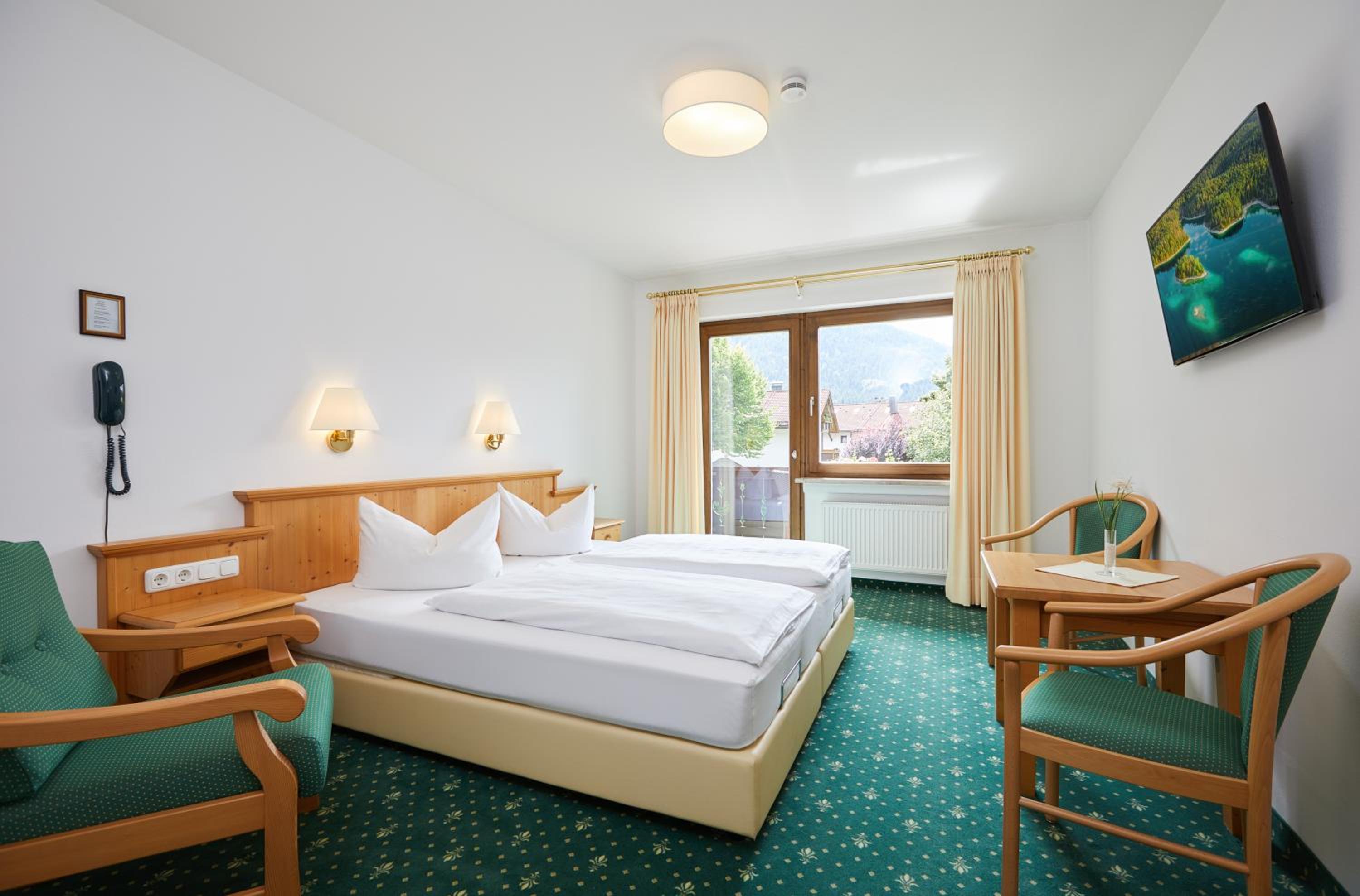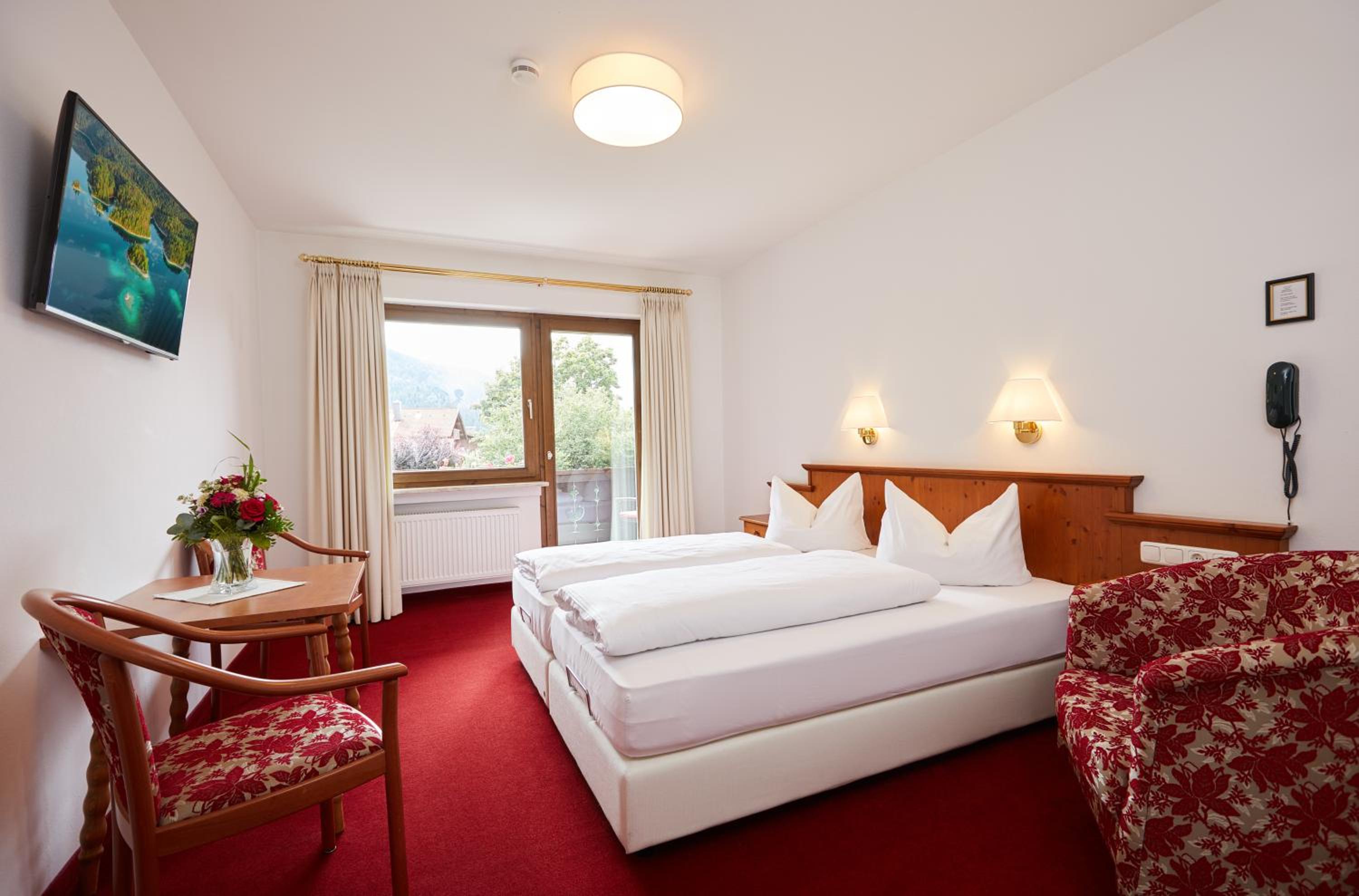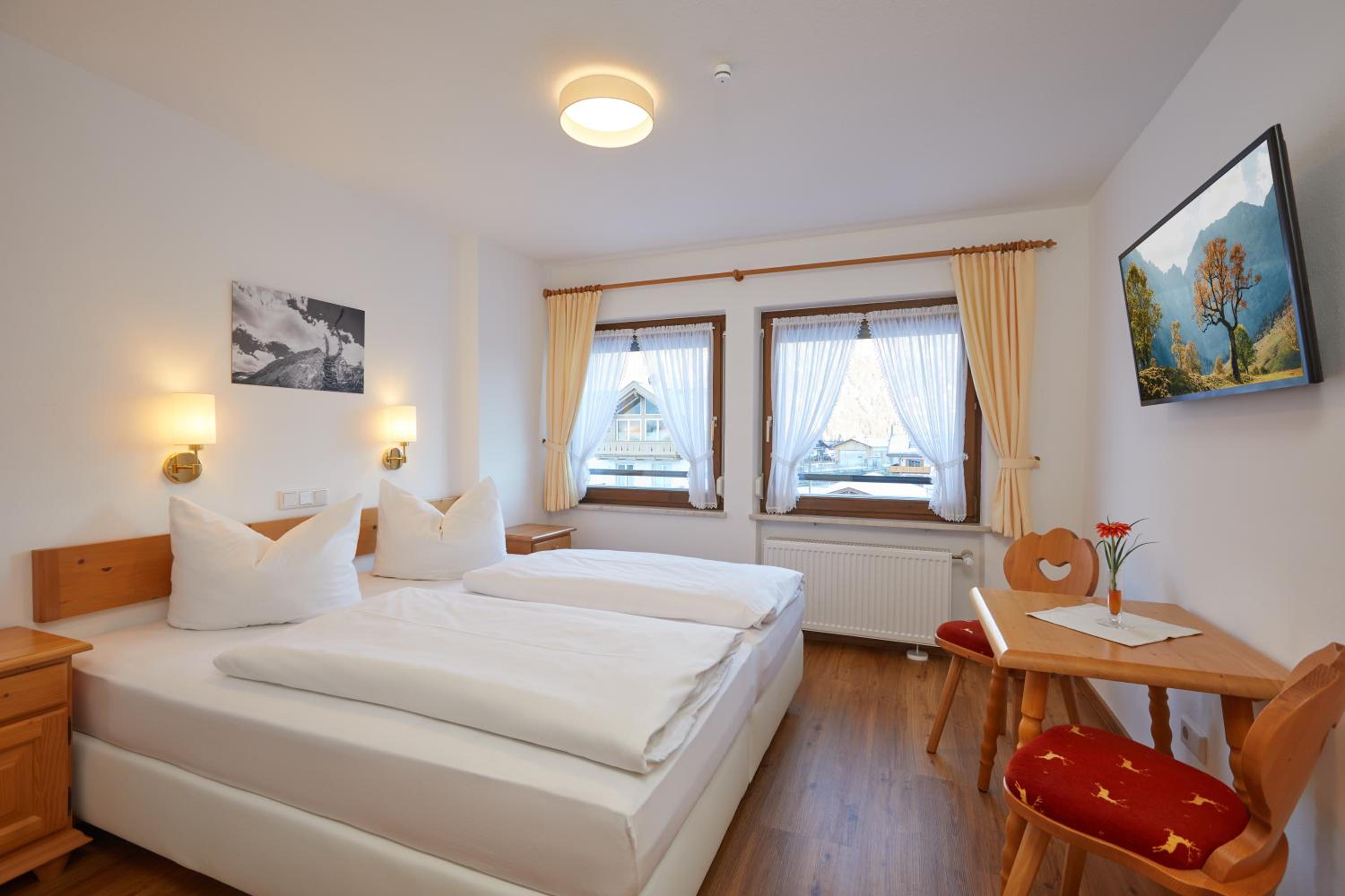Hotel Garni Zugspitz offers a cozy alpine atmosphere with individually furnished rooms, high-speed WiFi, and smart TVs. Some rooms even feature balconies with stunning views of the Bavarian Alps.