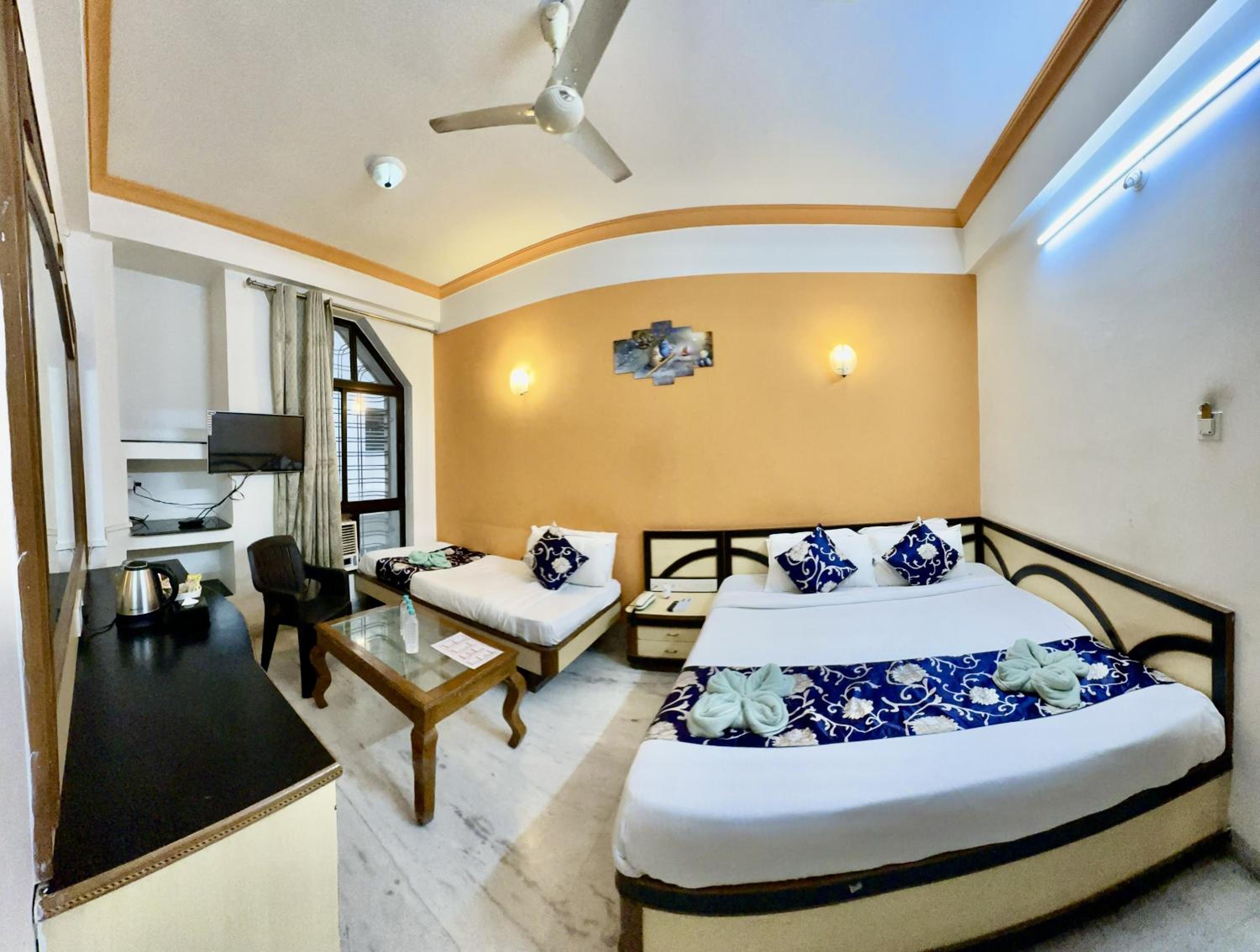 I had asked for 2 rooms and was told I would get 2 rooms. When we reached the property they said only one room is available. They instead gave a 4 bed room. The towels and pillow covers were all dirty. The bathroom fittings were quite loose and rusted. Food options was less as compared to what was mentioned in the menu. It was mentioned the location is opposite gate 3 of the temple which was misguiding.
