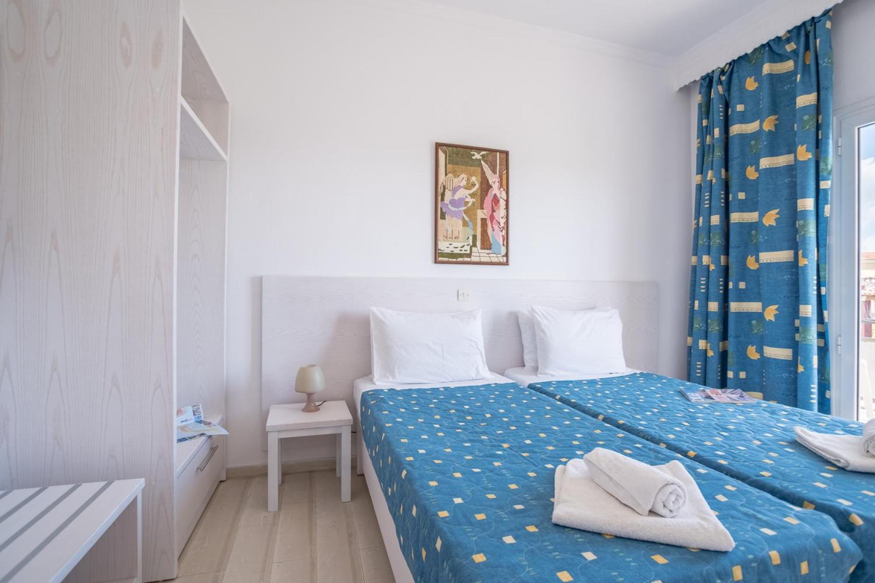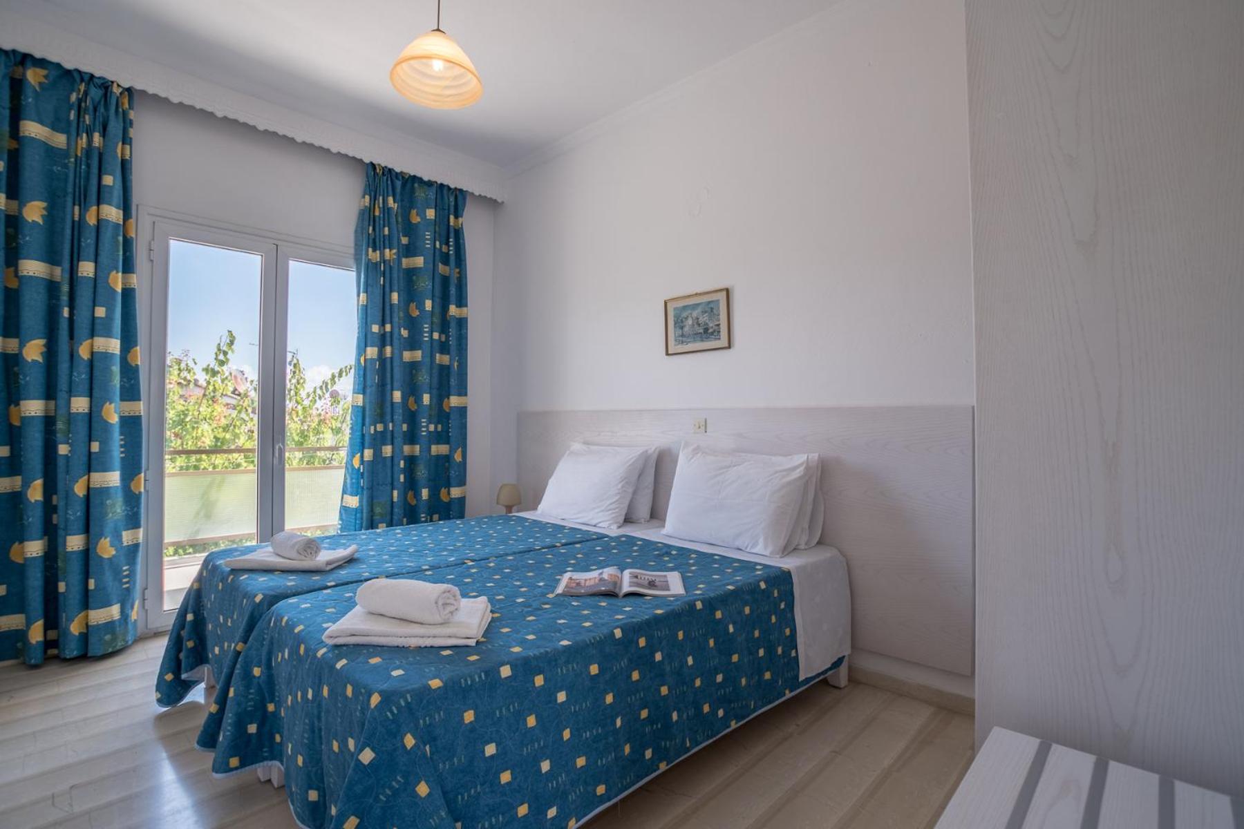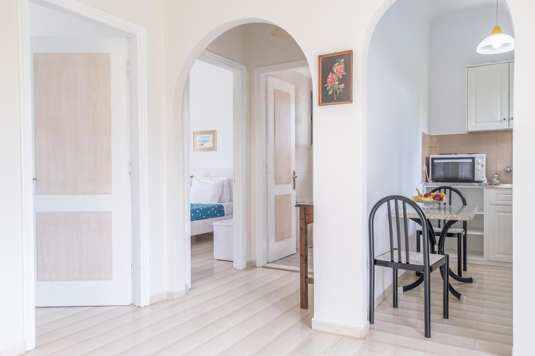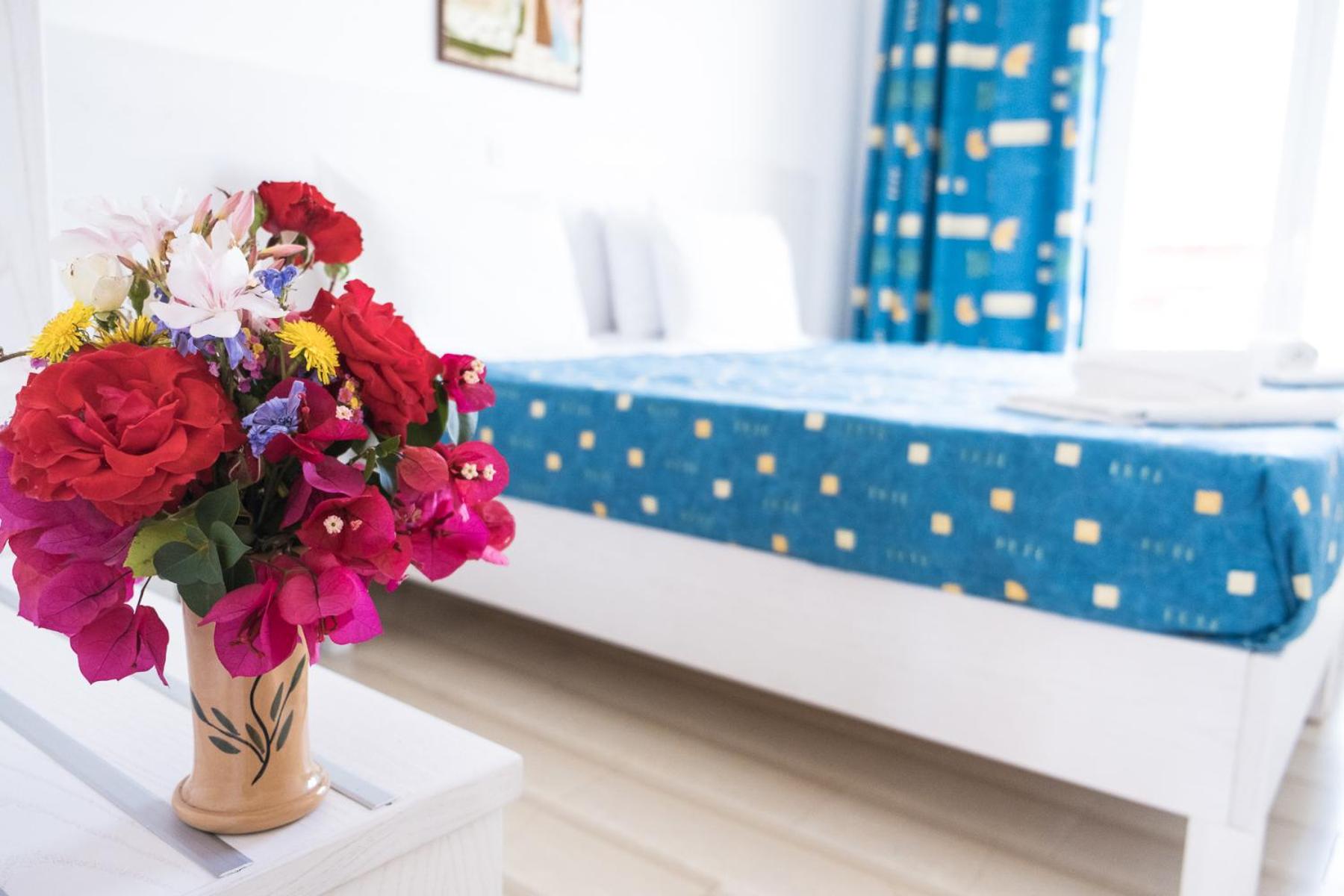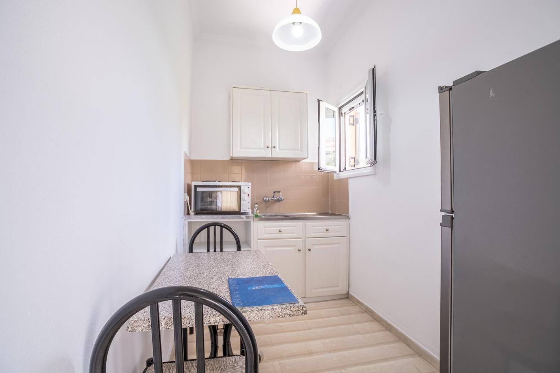 The bright and airy units at Dimitra boast kitchenettes, dining areas, and private balconies with picturesque views of the pool and garden. With amenities like a fridge, kitchenware, and an electric oven, guests can easily prepare their own meals and savor them in the serenity of their balcony.