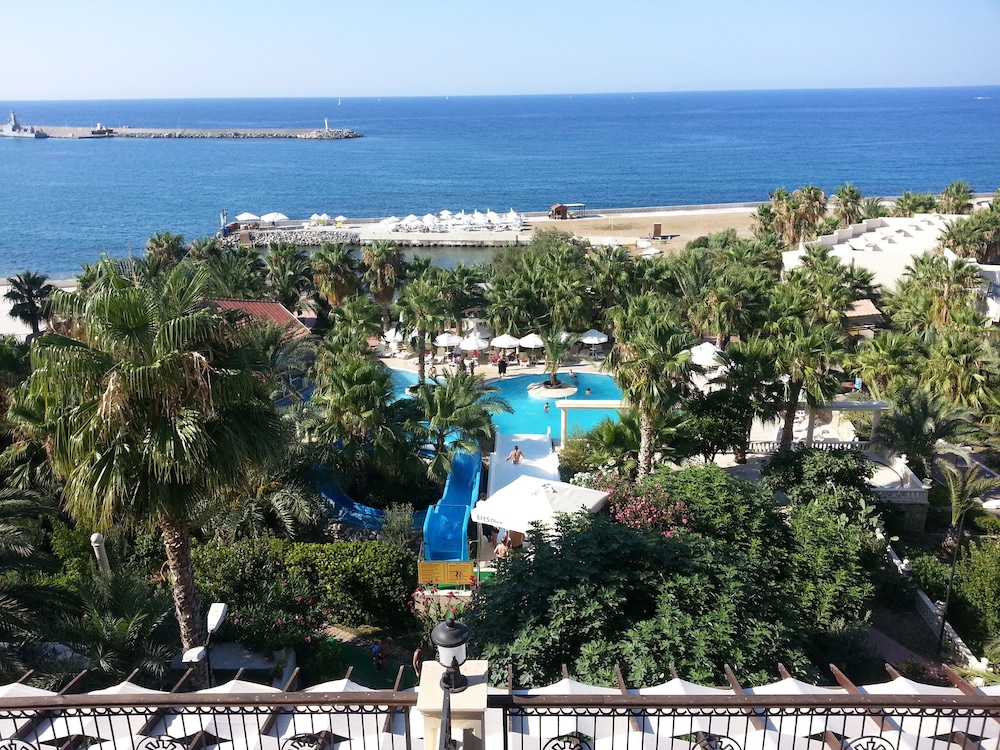 Stayed here for 4 nights as part of a tour of Northern Cyprus. The resort is beautiful a little way out of the centre of Kyrenia. We had a poolside suite with double balcony, one side with sea view, the other over the main pool. The accommodation comprised a bedroom a large shower room with a very fancy shower and a large sitting room. There were two TV's and we were able to find English speaking channels. A fridge was also provided though no kettle. The shower water was sometimes cold and the aircon a bit feeble. The breakfasts and dinners were quite good although the machine served instant coffee and the egg station did not provide poached eggs. There was a widw choice of dishes at dinner with vegetarians well catered for and delicious desserts including my favourite chocolate pudding. We were very happy with our stay here and would visit again if we revisit Kyrenia