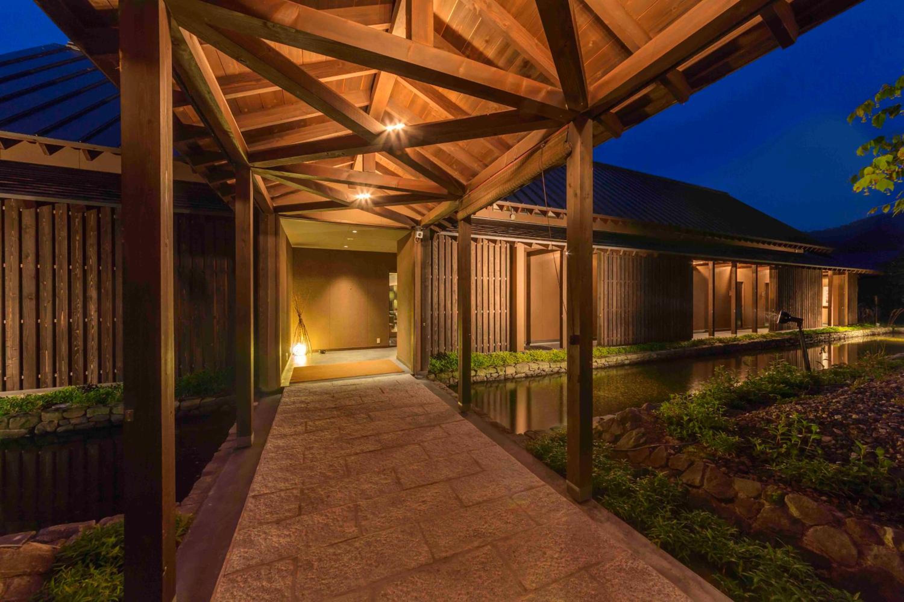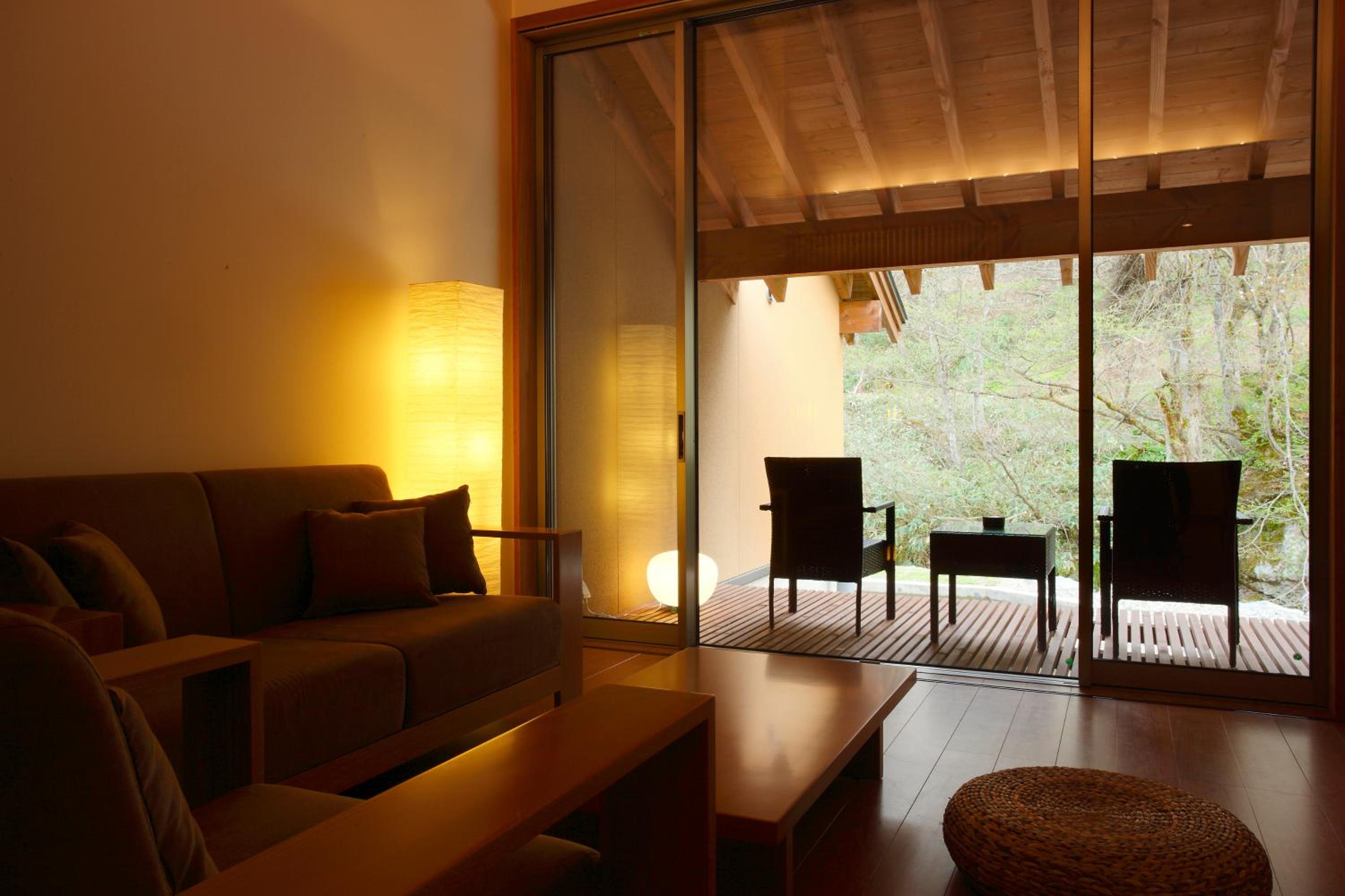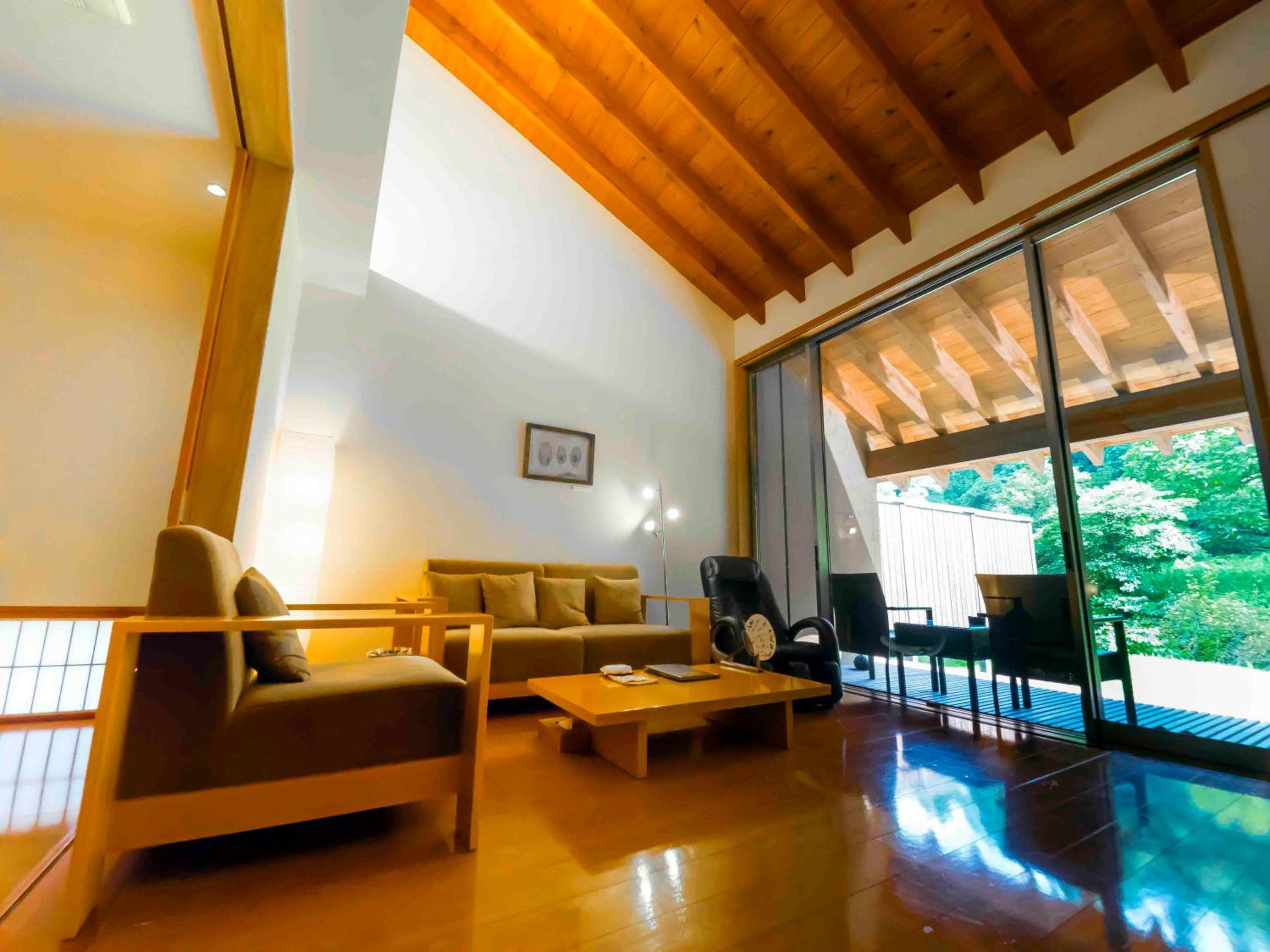 Immerse yourself in the serene atmosphere of Yamado, offering chic guest rooms with private hot spring baths and a living room for relaxation. The wooden furnishings and Japanese sensibility create a peaceful escape.