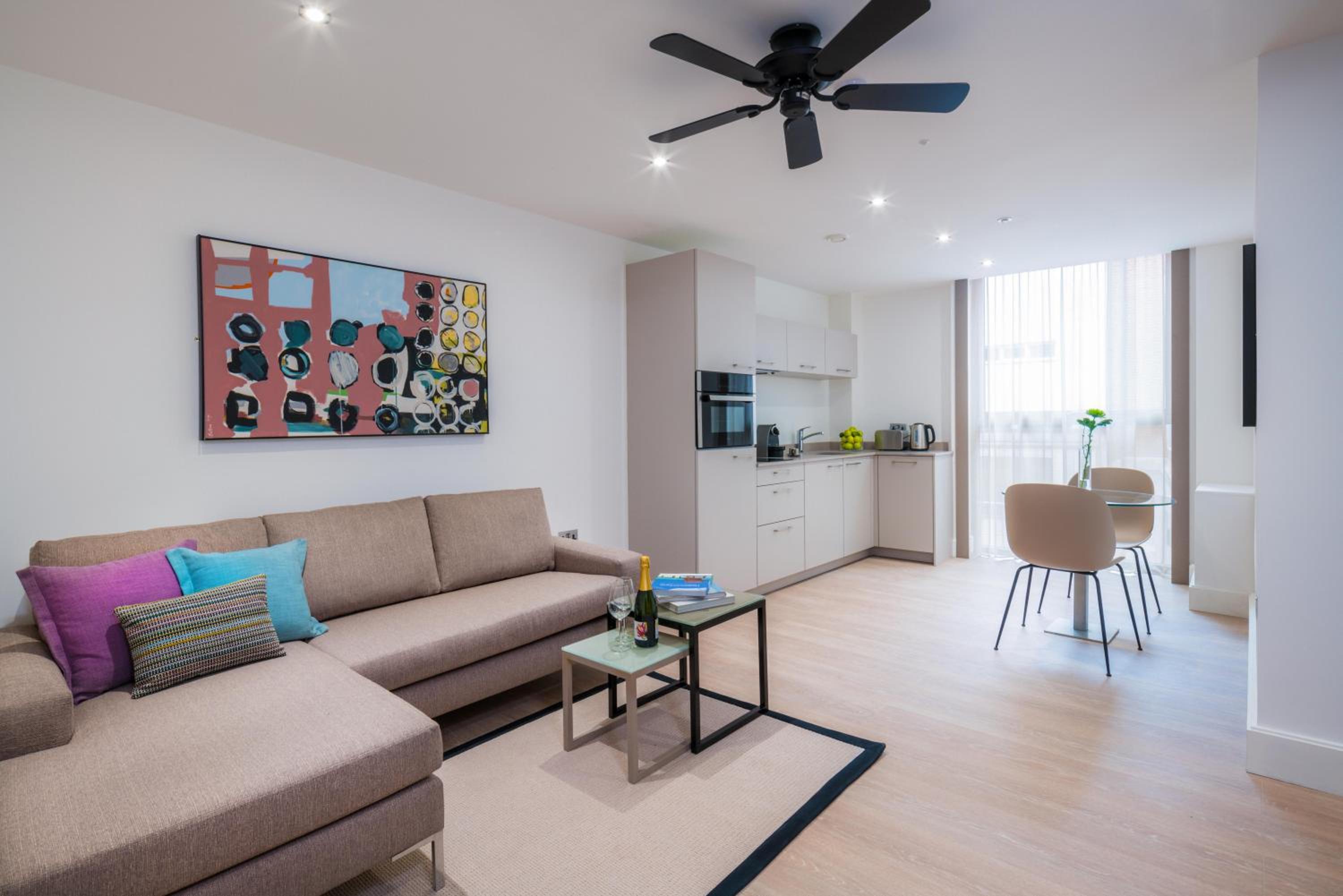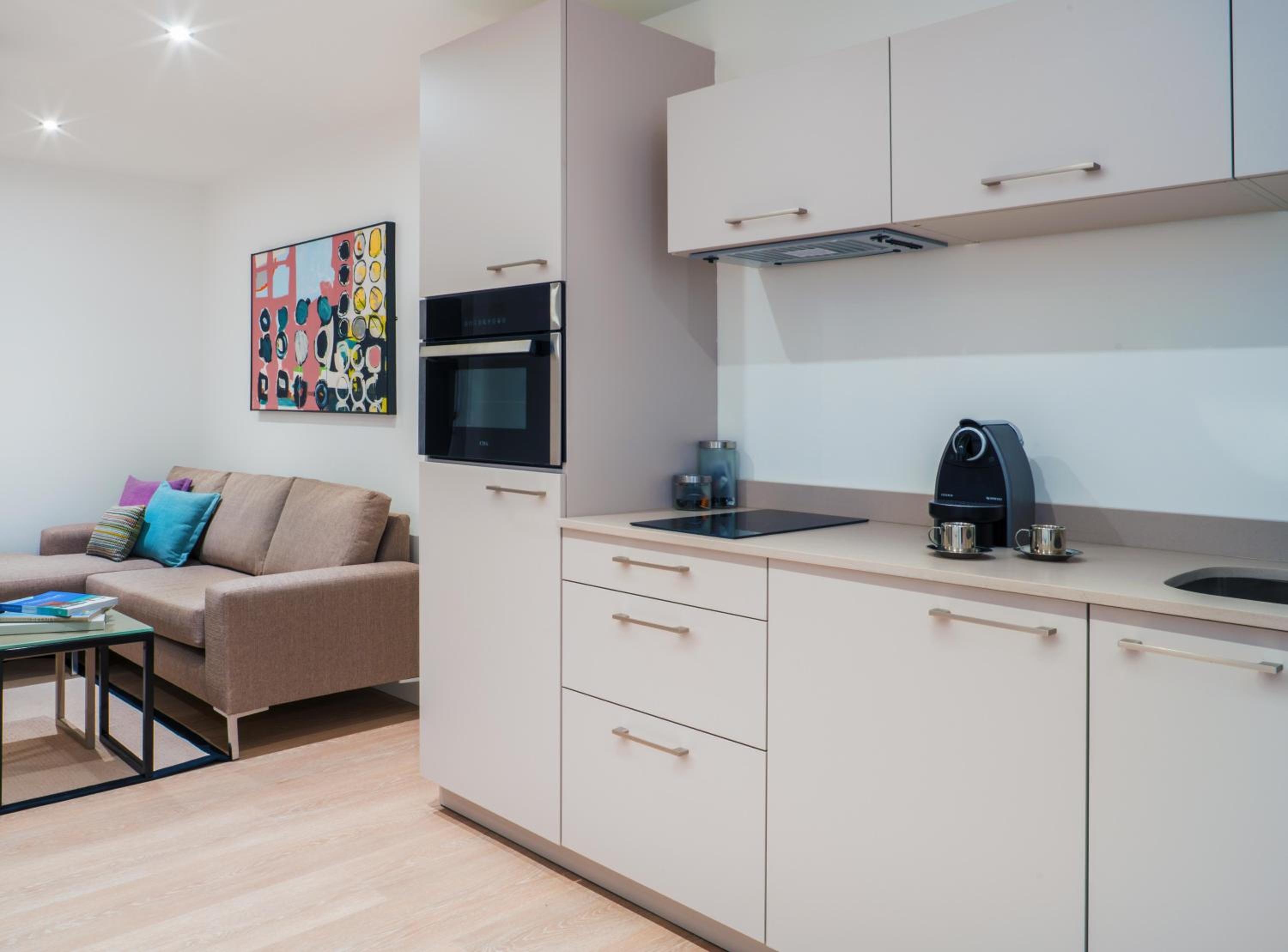 Het mooi, ruim en schoon appartement met een uitstekende ligging ten opzichte van de metro. Je komt binnen in de hal,. Daarna een aparte slaapkamer, daarnaast de badkamer en dan loop je de keuken annex woonkamer in. Prima opgezet. Alles wat je nodig hebt in de keuken is aanwezig (behalve keukenrol ;-)). De bezienswaardigheden zijn ook redelijk op loopafstand. Dicht bij Sint Paul's. Een rustige buurt, maar de reuring van de stad is binnen handbereik. De dame bij de receptie was super vriendelijk. We hebben een fijn verblijf gehad.