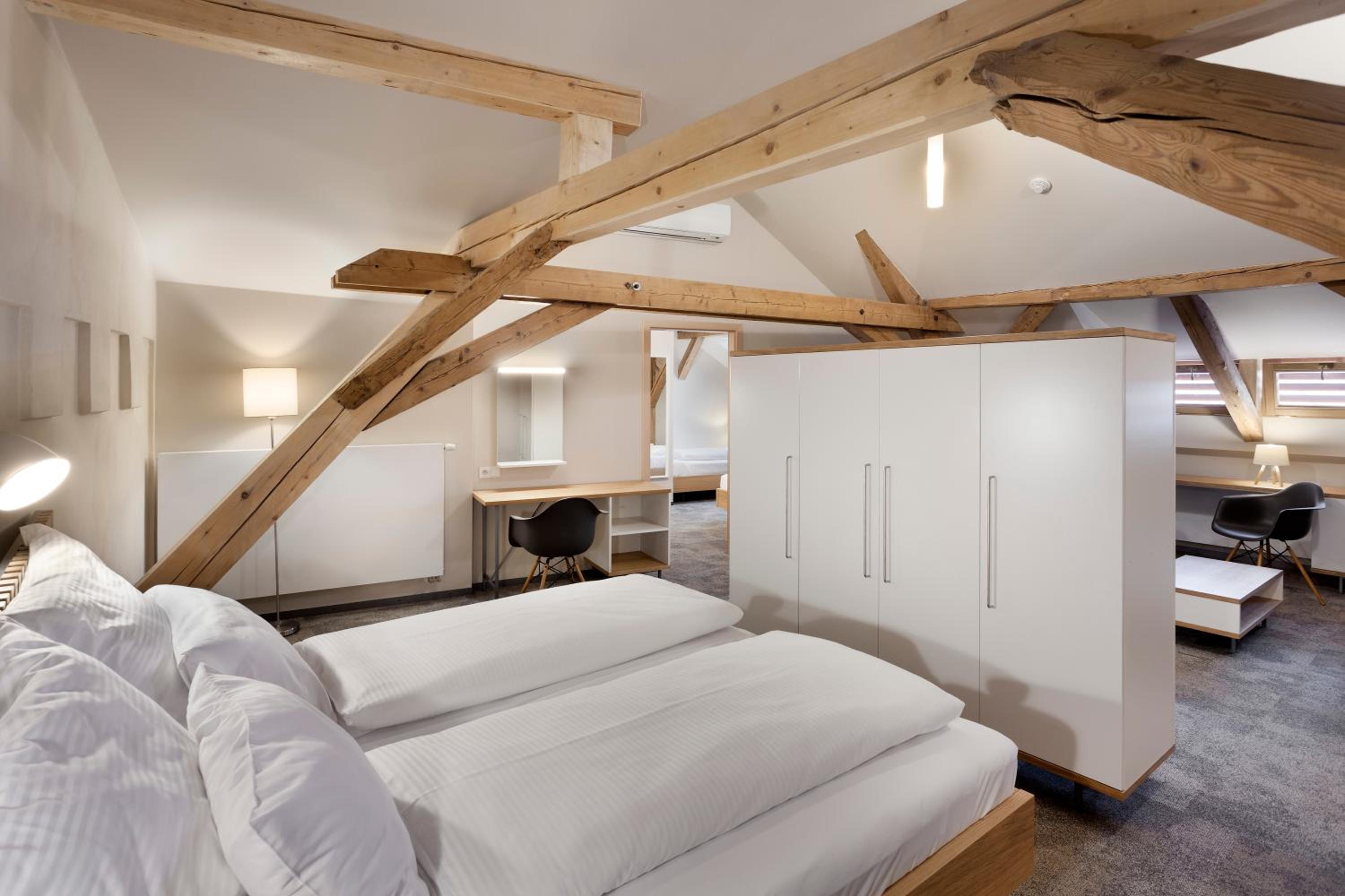 Rychlý check-in s možností vyplnění dopředu. Dostatek místa pro parkování auta. Ochotný a milý personál, rychlá wifi. Dostatečná a dobře po celou dobu doplňovaná snídaně. Pokud chcete večer o víkendu posedět v restauraci, doporučujeme místo dopředu zarezervovat. Postele velké, pohodlné. Pokoj zrenovovaný, čistý, vybavení dobré. V zimním období nevadilo ani menší okno (což vzhledem k typu stavby chápeme). Na pokoji hotelový bar, trezor, TV. 100m od objektu je autobusová zastávka. V areálu je i pekárna, cukrárna.