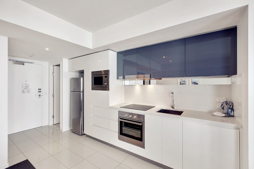 The location and the view were luxury. But despite the names the apartment certainly was NOT luxery. Common areas stains all over the carpet, old mismatched lounge, mismatched and incomplete crockery/cutlery. Missing basic things like toilet paper, bin bags, dishwashing liquid, conditioner. Check in/out office dirty dingy space that has only stairs to reach it. Disabled people can't check in. Cramped bedrooms, could hardly walk between the two beds, only really space for one bed per room. Location and view were great though. Team stop about 100m away. Woolies and Coles both only half a block away.