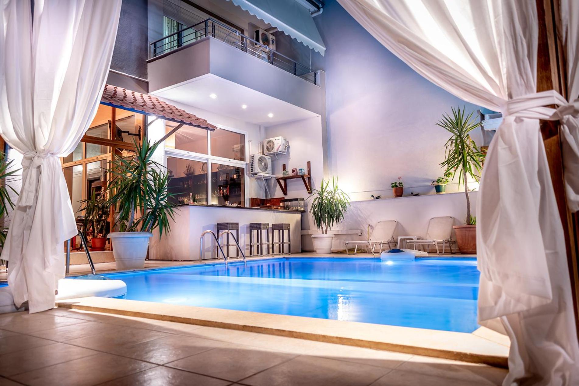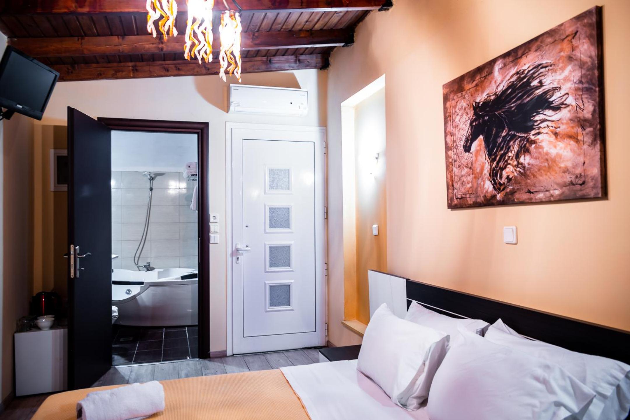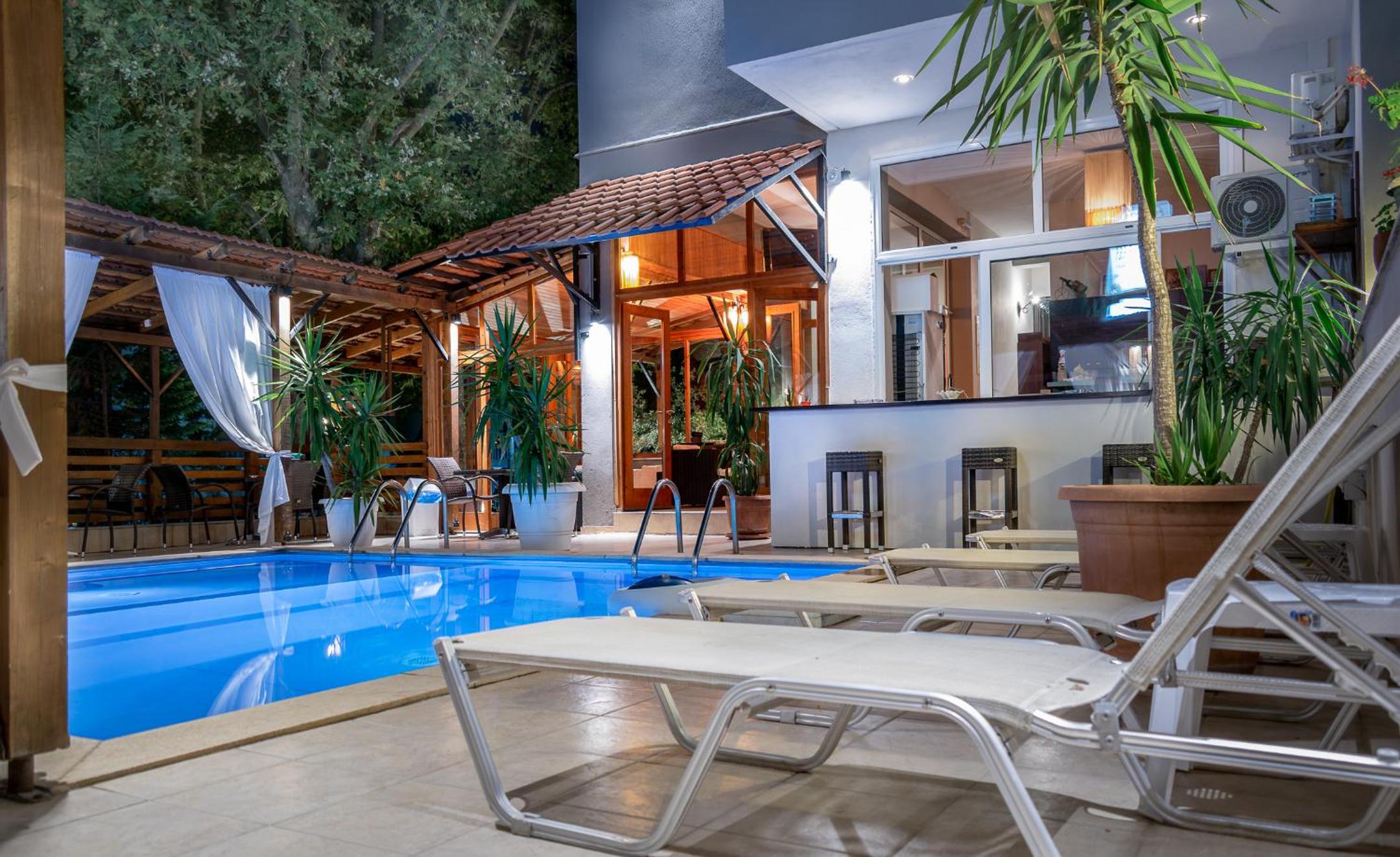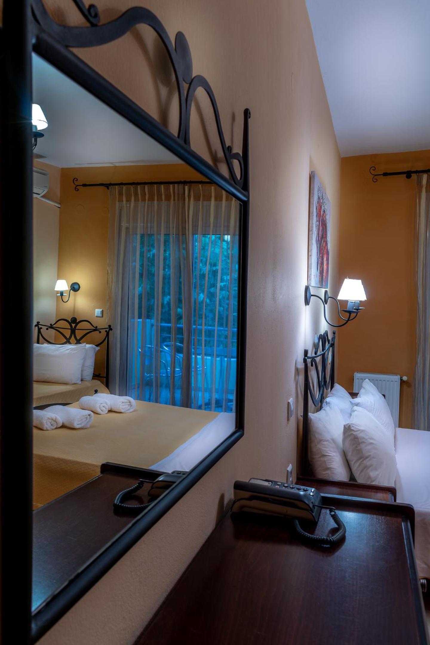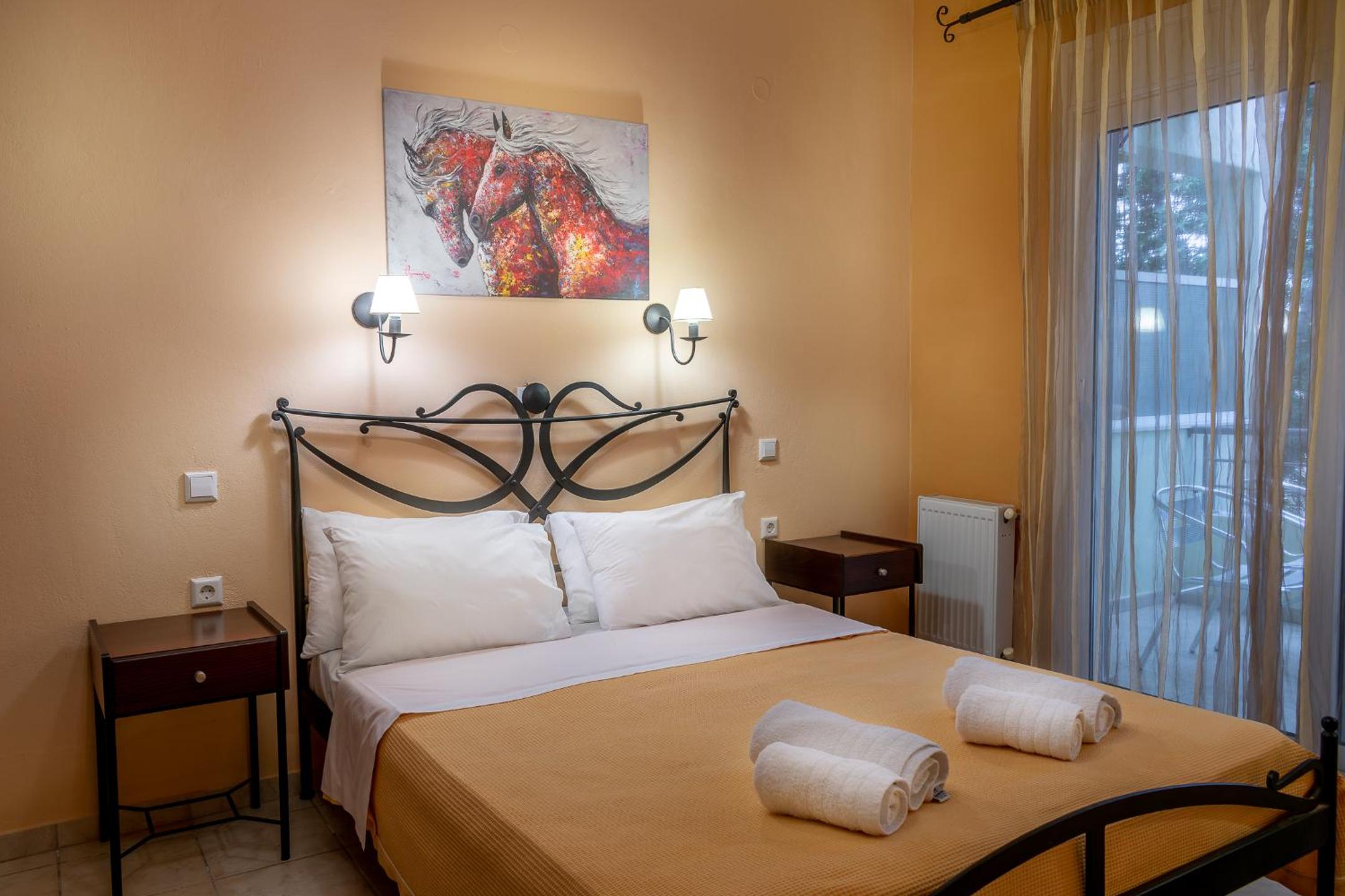 Nestled in Nea Peramos, Kipos Resort offers a tranquil escape surrounded by nature. The spacious rooms, adorned with handmade iron beds, boast private balconies for a serene retreat.