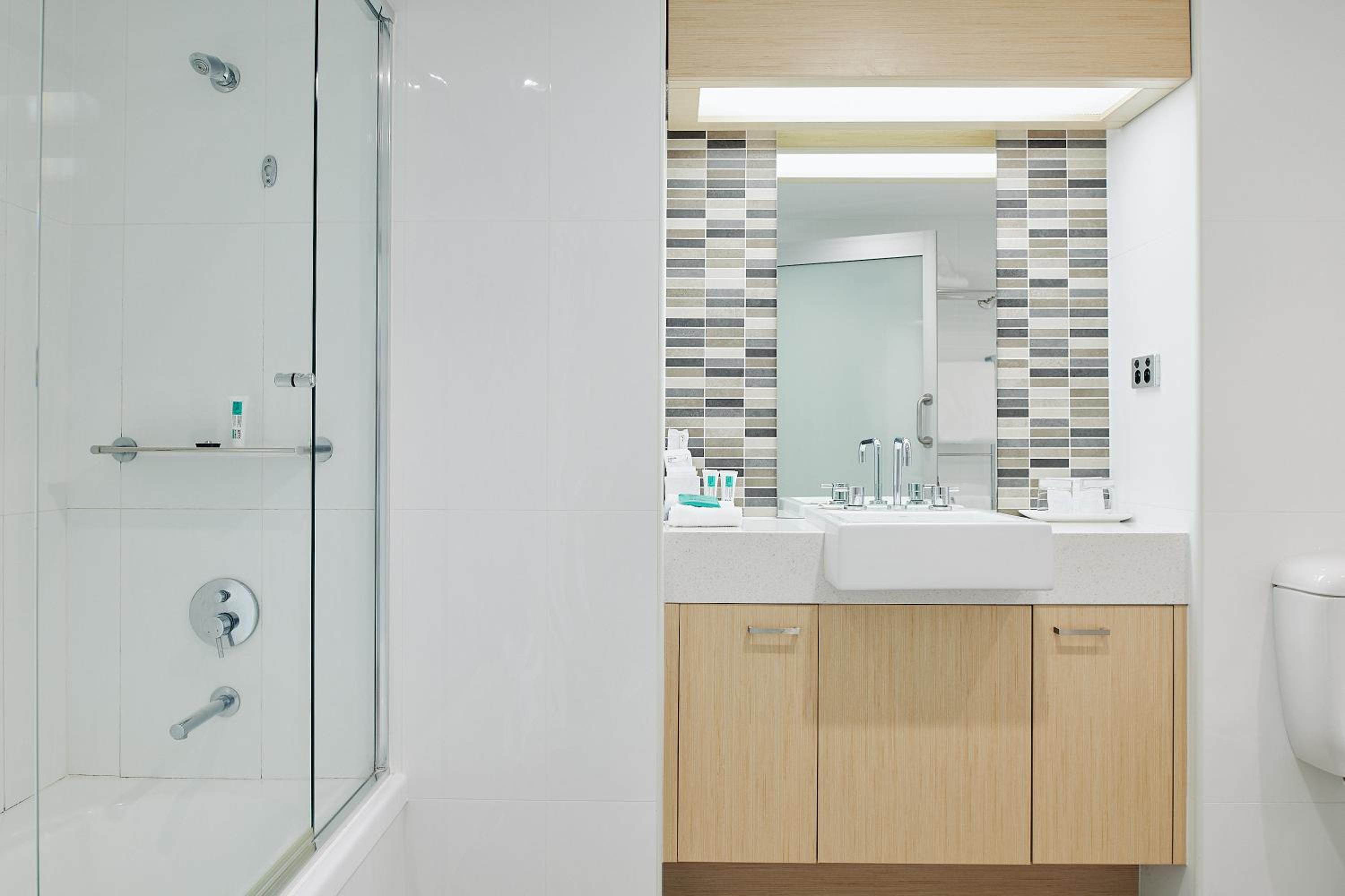 It would be a good idea if the bathroom had a shower recess for easier access instead of the bathtub and that way you could do away with the shower door.