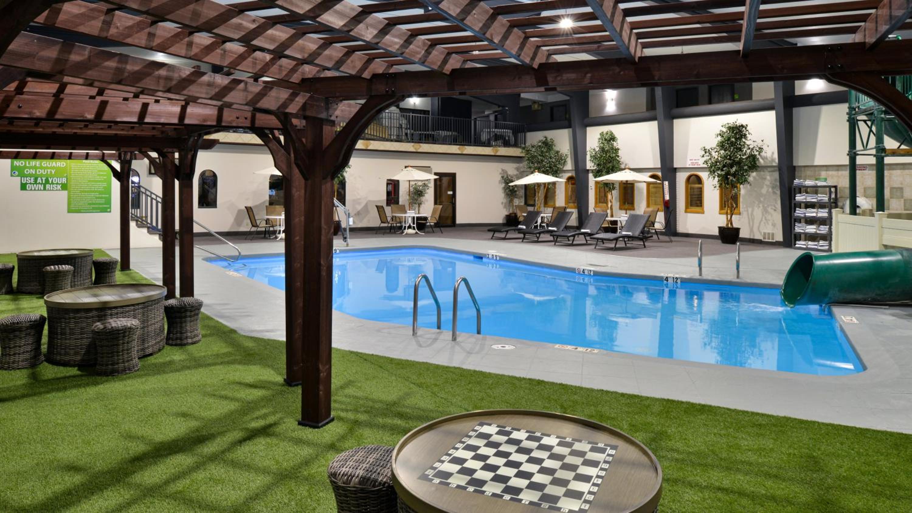 Indulge in the two-story atrium with a hand-crafted waterfall, gym, hot tub, and indoor pool with a 48-foot water-slide. The children's play zone ensures fun for the whole family.