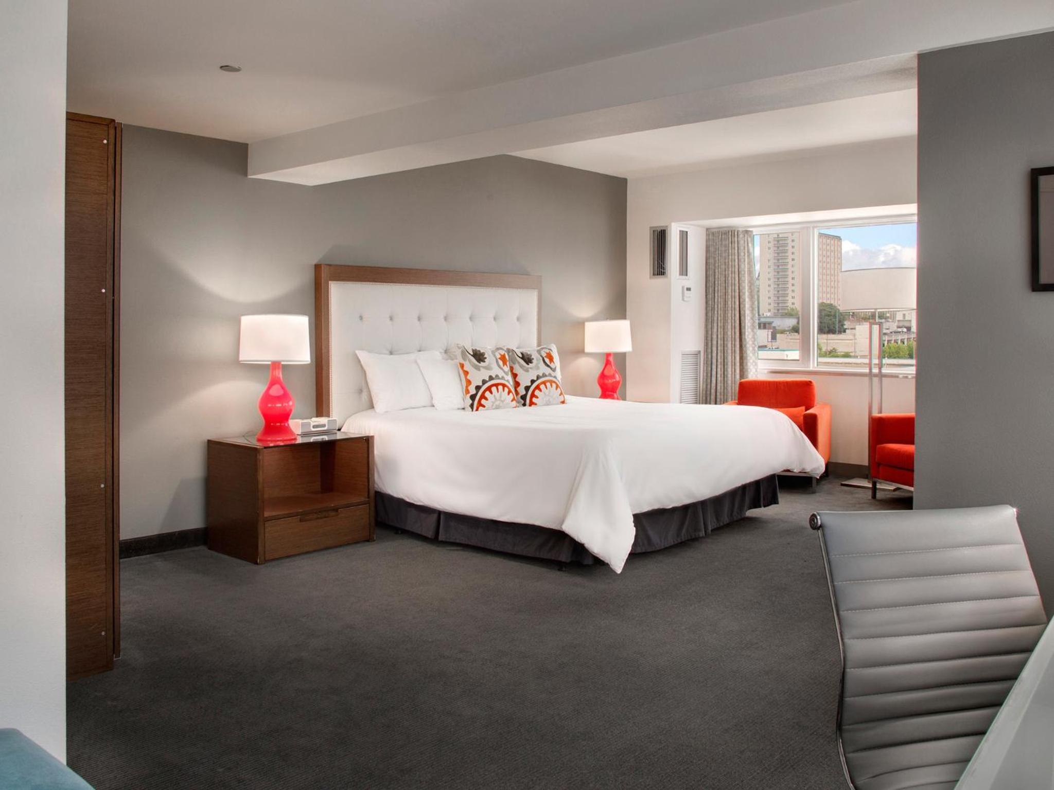 The hotel is right next to the Convention Ctr. It's a little dated, and the glass art on the walls in the lobby need refreshing. There is no artwork in the room. The carpet from the parking lot to the lobby is wrinkled (I'm surprised no one tripped). The food is average - the sirloin was sold out (on Valentines Day!). I ordered tiramisu for dessert an got white layer cake with coffee flavored icing and white chocolate, NOT tiramisu. Wine list is short. The bedside lamps have red glass bases, and when turned down the whole room has a red bordello vibe... weird. I was on the north side and the traffic was a little noisy but calmed down after 10pm. One barista behind the counter on Sunday morning, and the grab-go pastry was sold out by 8:30am. The hotel describes itself as a "boutique stay" but I def didn't get that feeling at all.