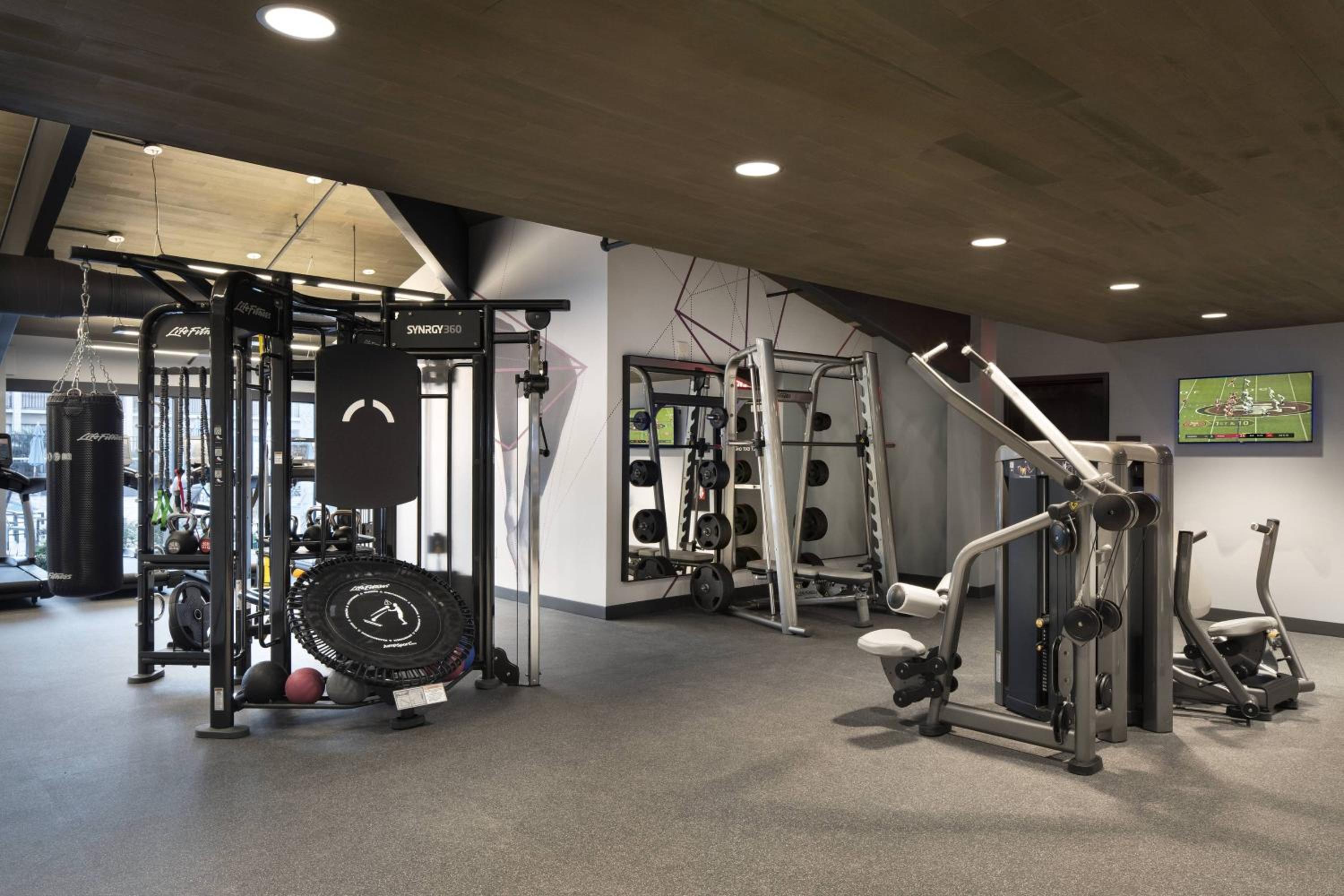 LifeFitness Synergy 360 with boxing bag, multi-position, “Jump Sport” trampoline for medicine ball bounce back.