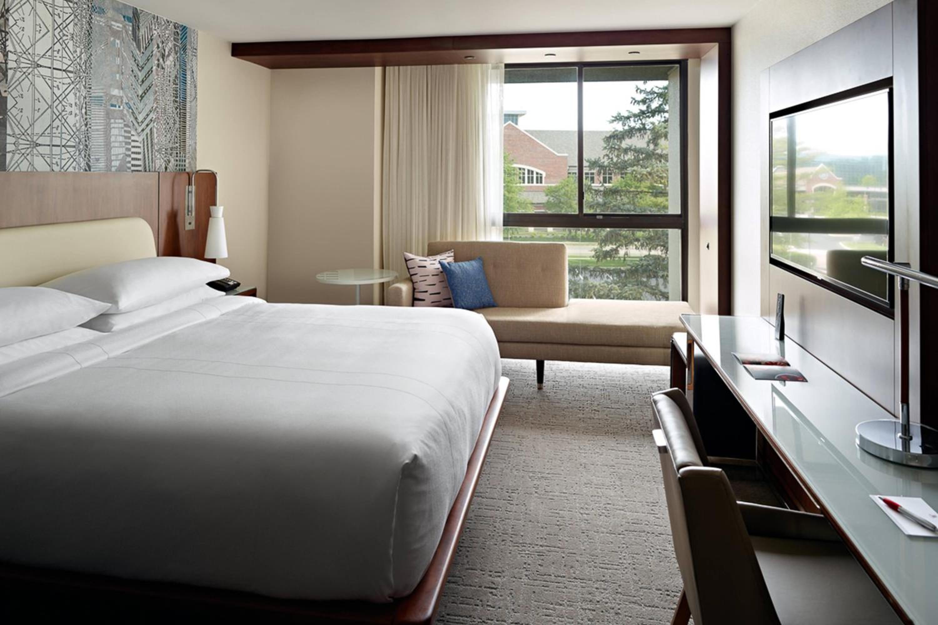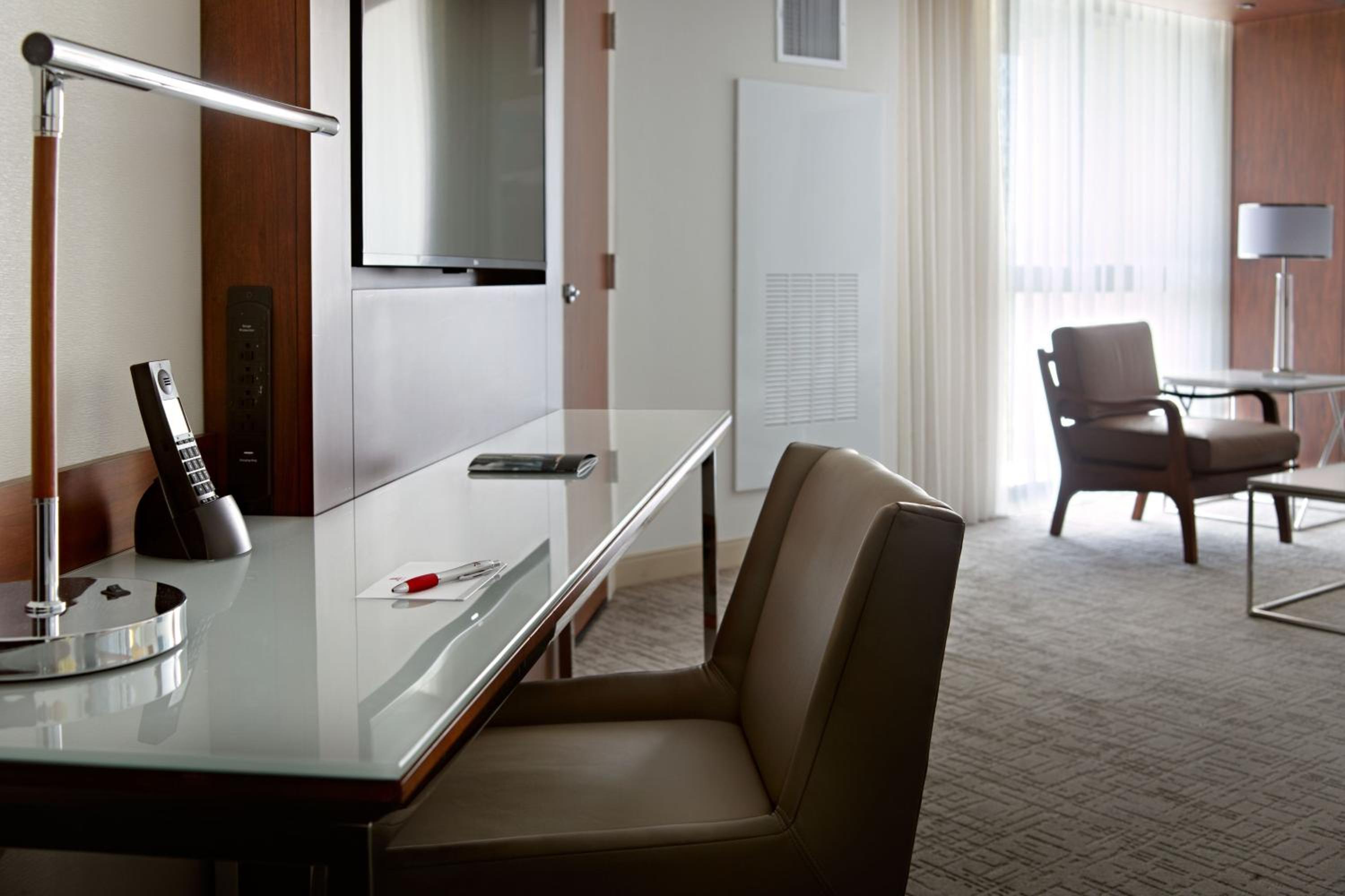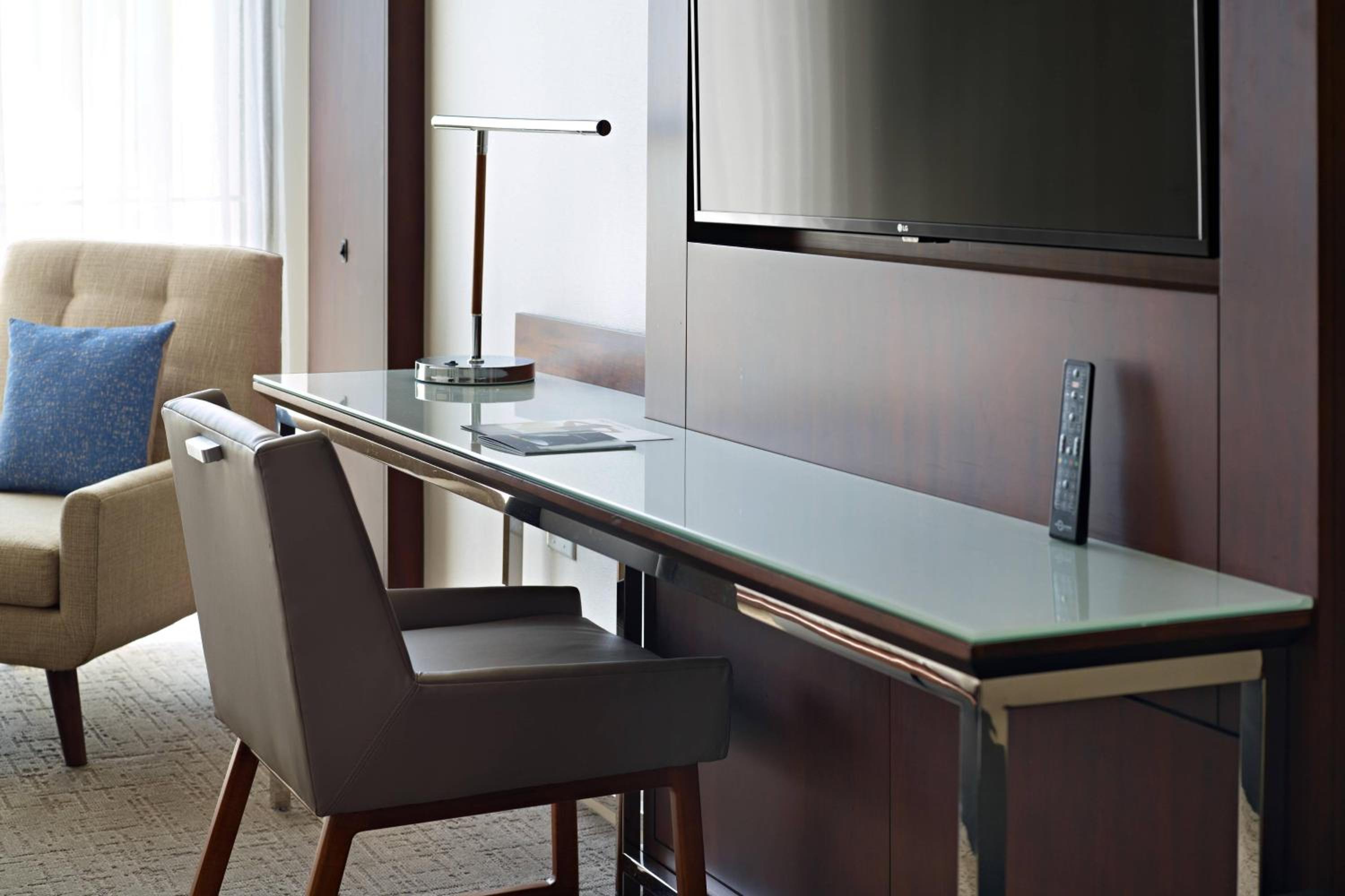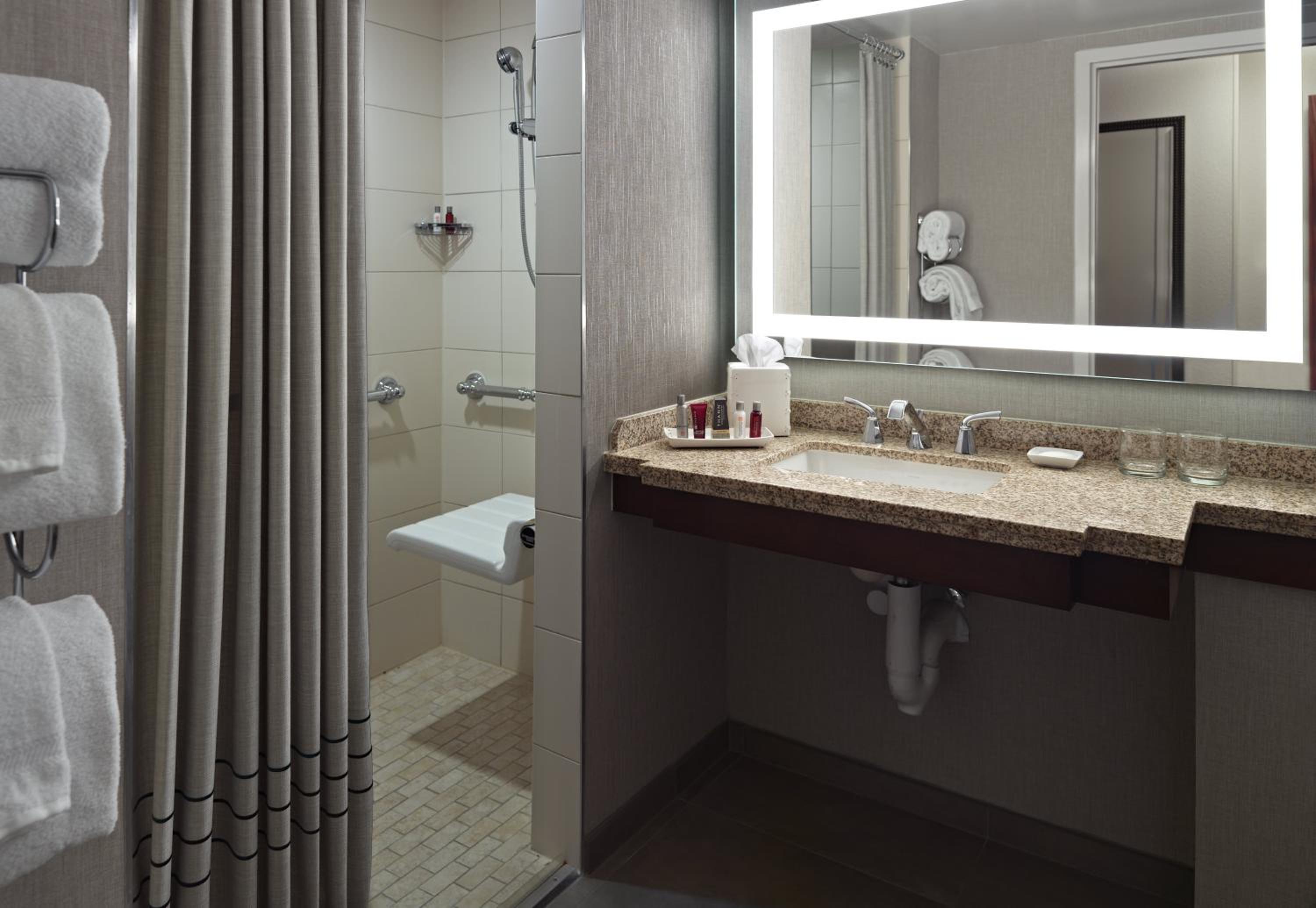 Experience spacious rooms at the Marriott at the University of Dayton, featuring large windows and marble bathrooms with luxury amenities. Each room is equipped with a writing desk, ergonomic chair, and a coffee maker for your comfort and convenience.