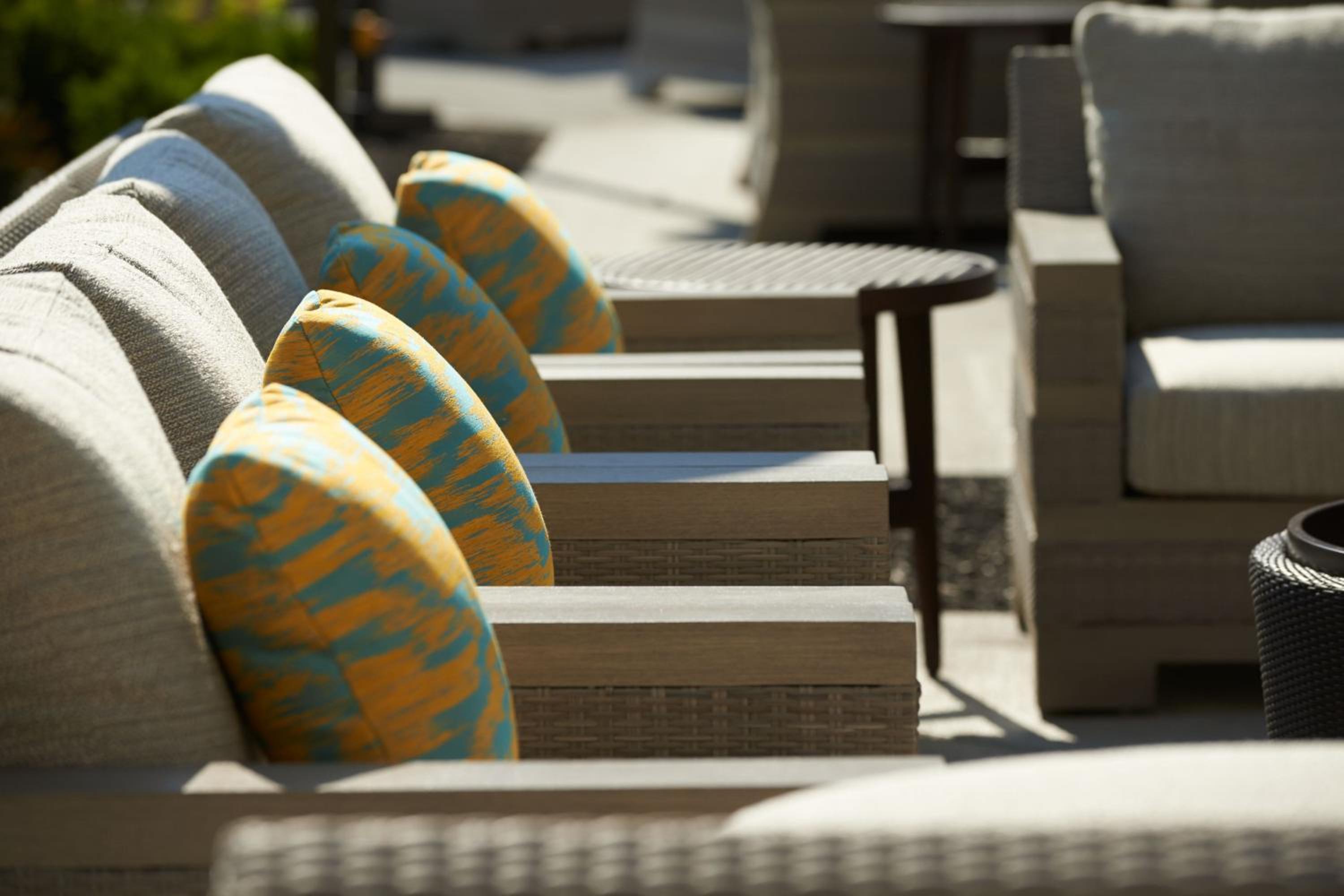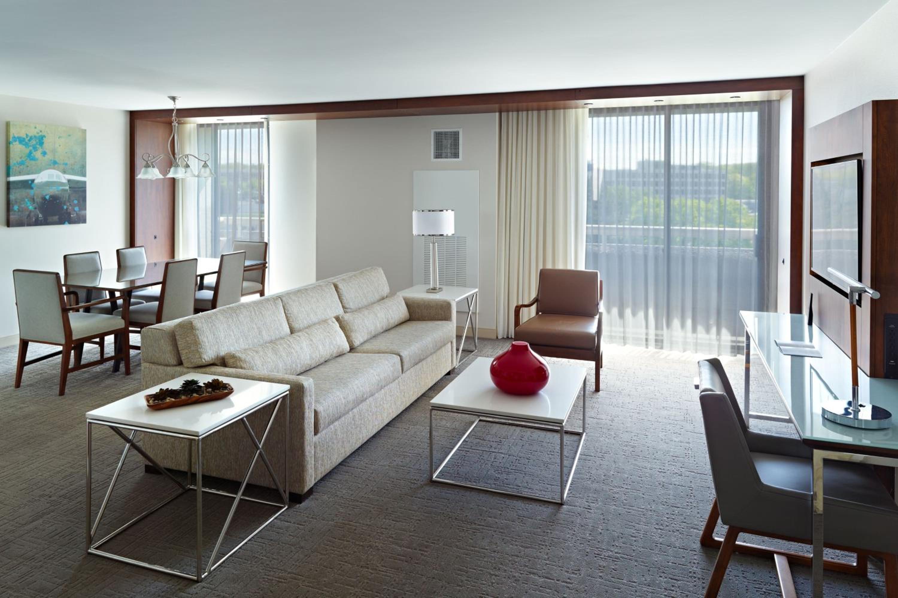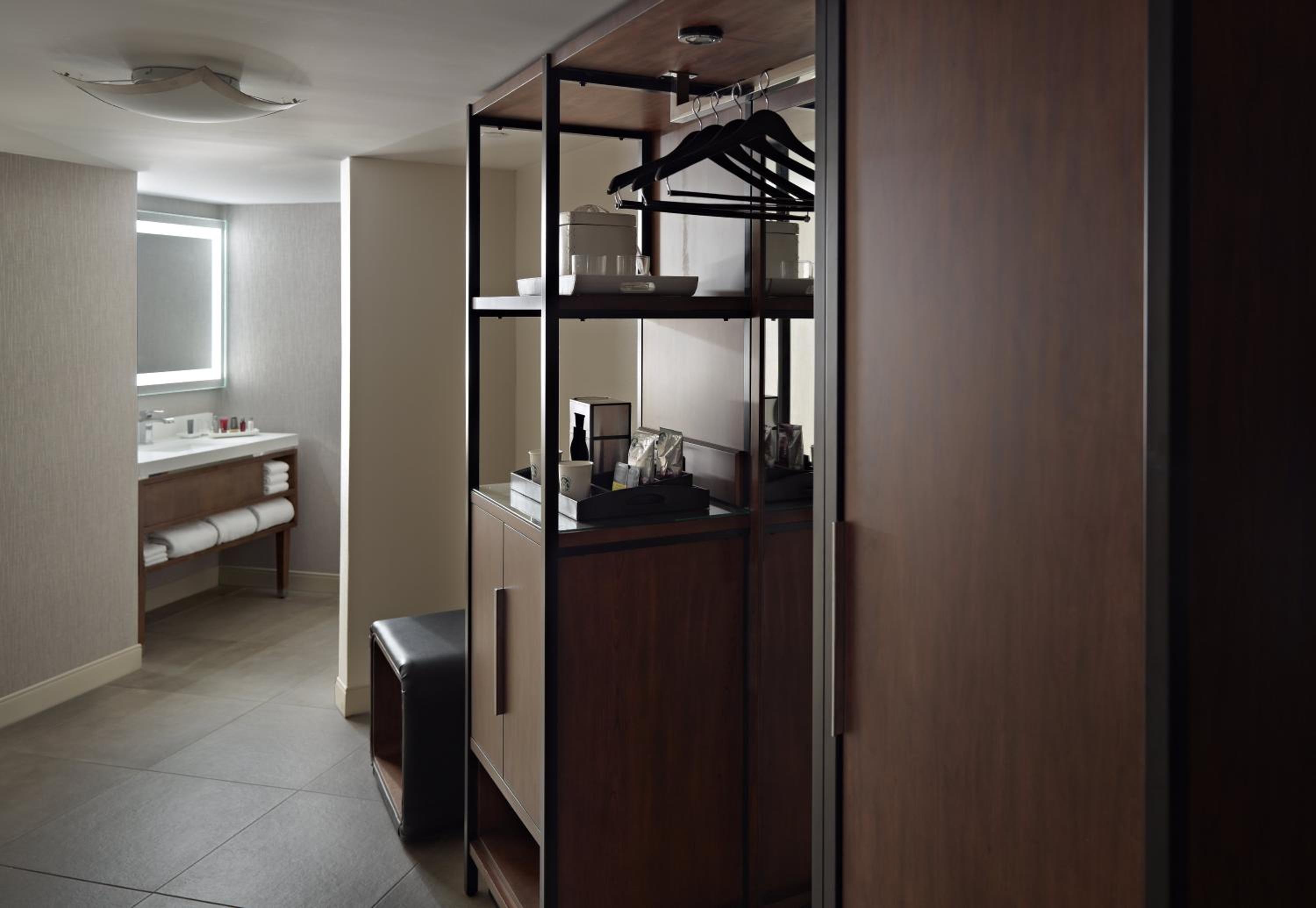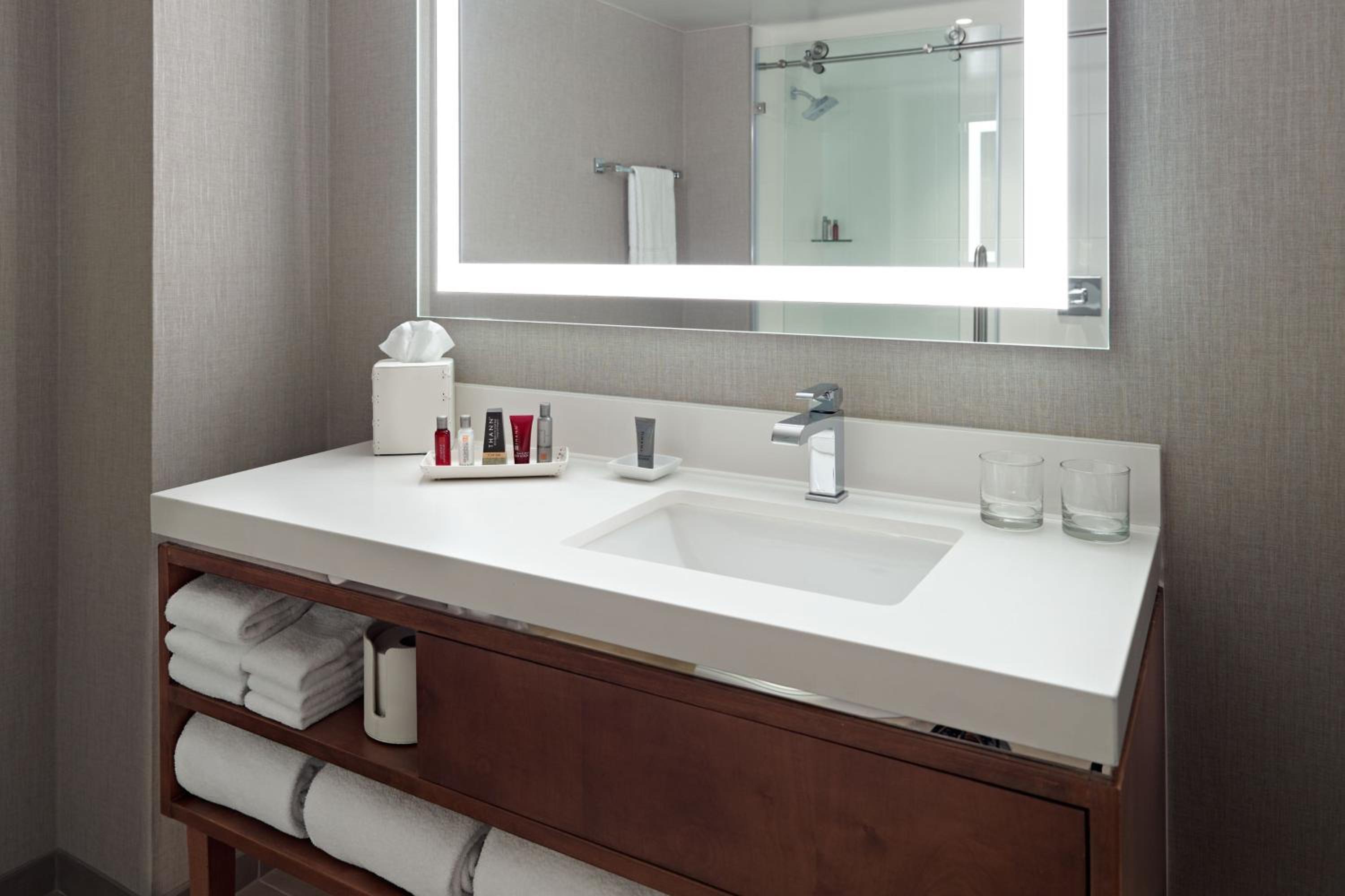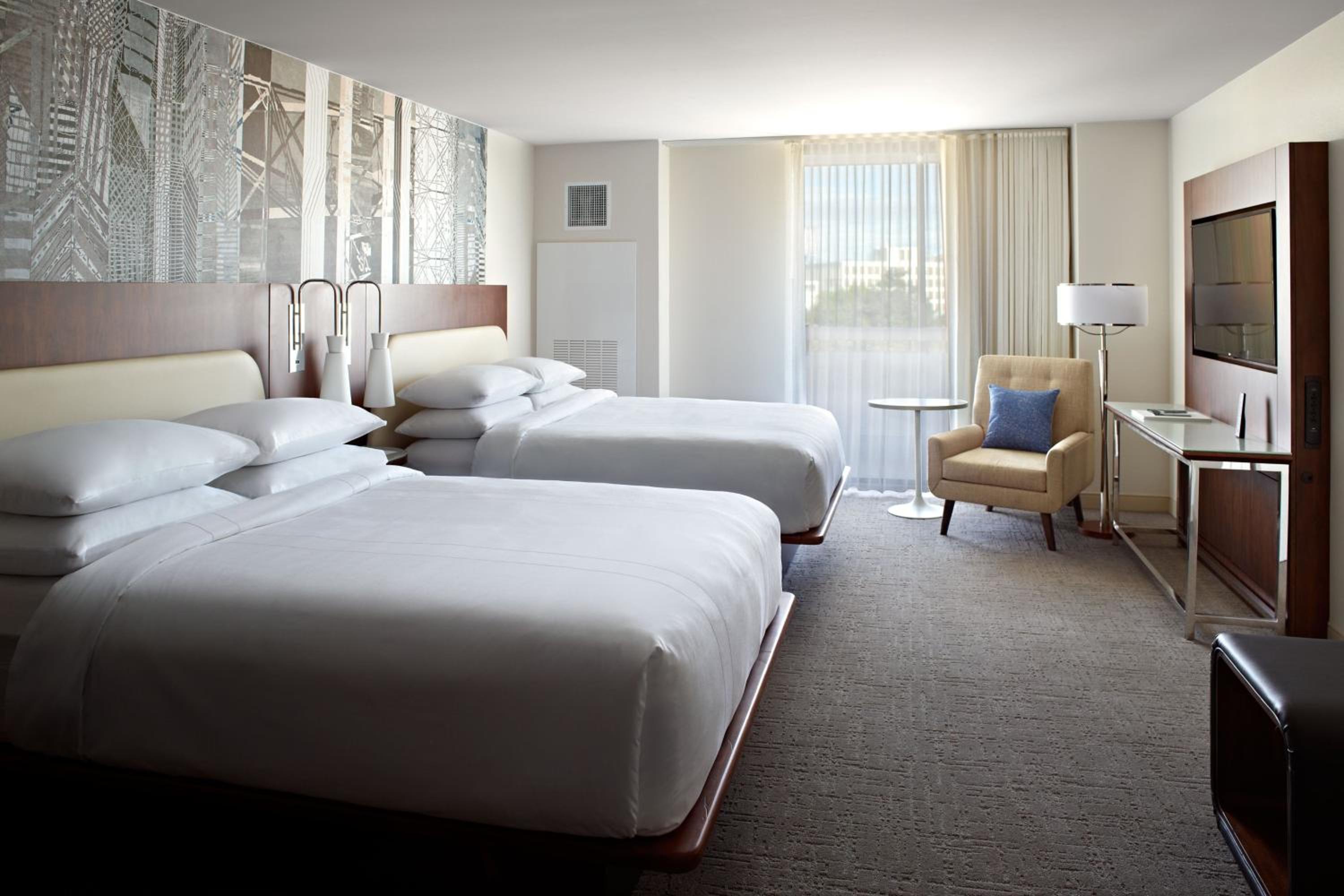 Experience spacious rooms at the Marriott at the University of Dayton, featuring large windows and marble bathrooms with luxury amenities. Each room is equipped with a writing desk, ergonomic chair, and a coffee maker for your comfort and convenience.