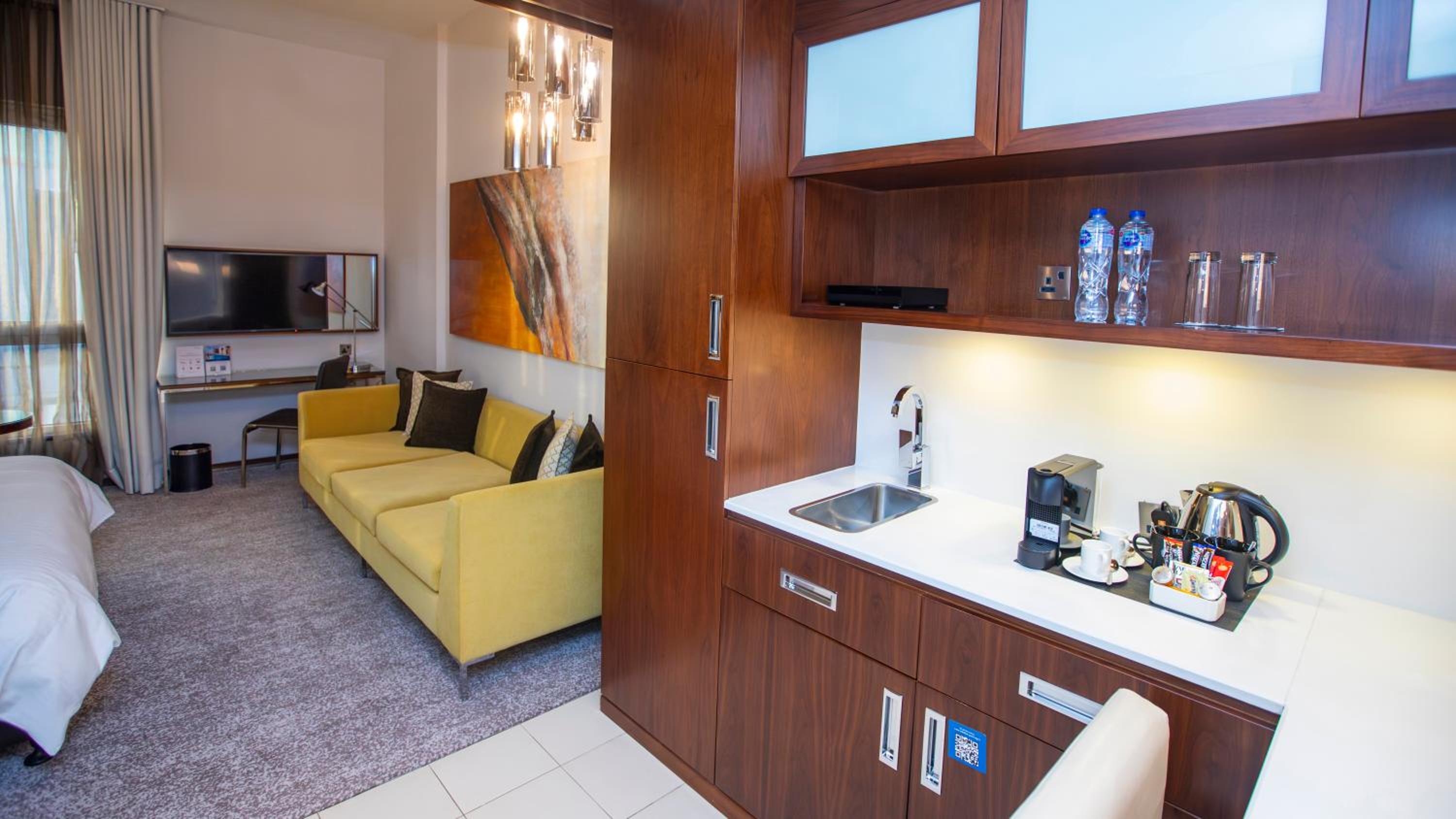 Luxurious Accommodations: Enjoy comfortable guest rooms with modern amenities, including a kettle and a seating area.