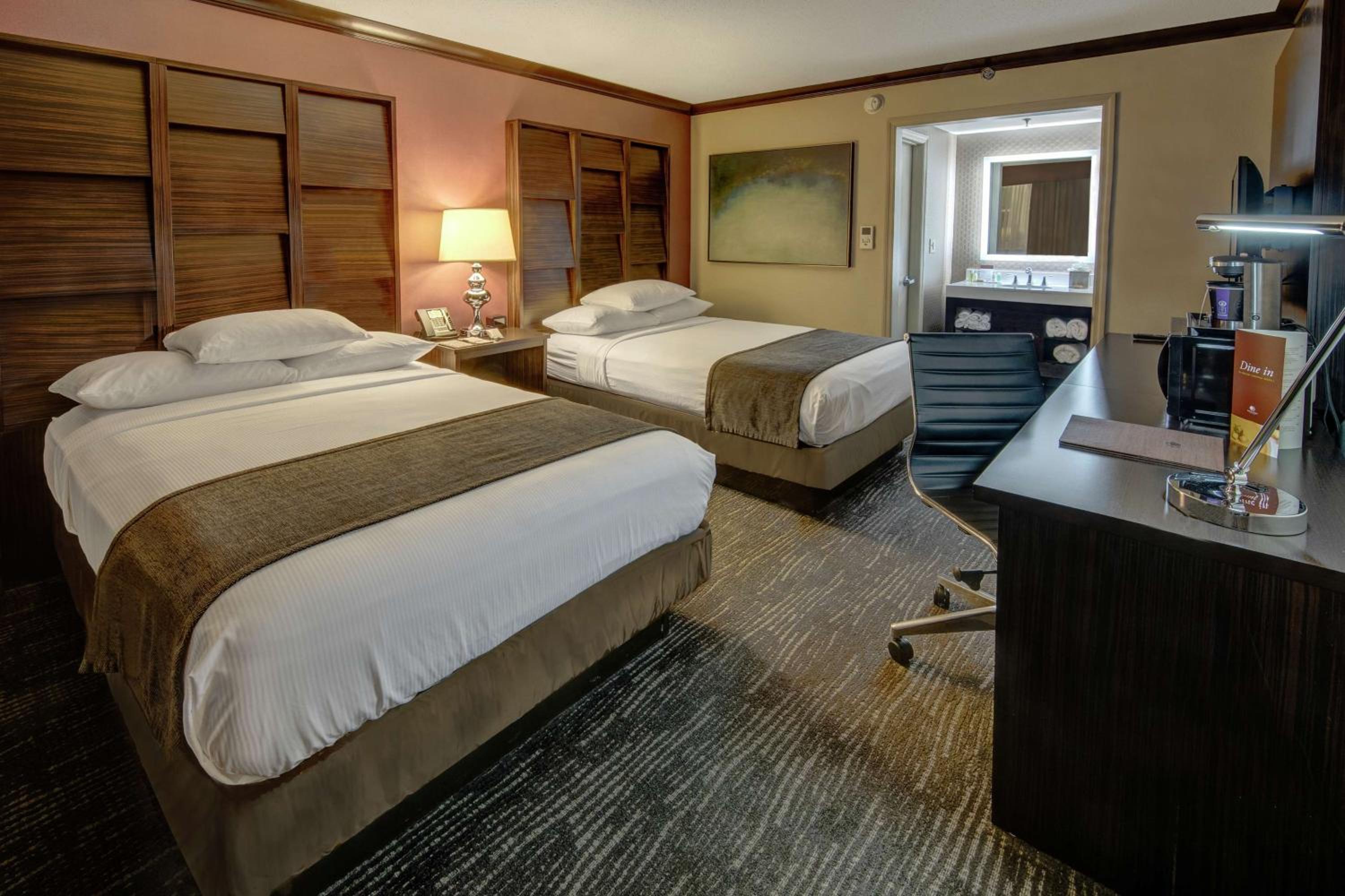The surrounding area did not look or feel as safe as I had assumed it would have been to be a Hilton hotel. The bed was worn and had a springy feel. Pillows were very soft and cheap. Building was located right beside a business that requires transfer trucks going and coming all night to the extent of blowing their horns. My two queen room without a view was $180 and my friends two queen room with a view (joke) was $160. Both rooms was very overpriced. I would not recommend this hotel.