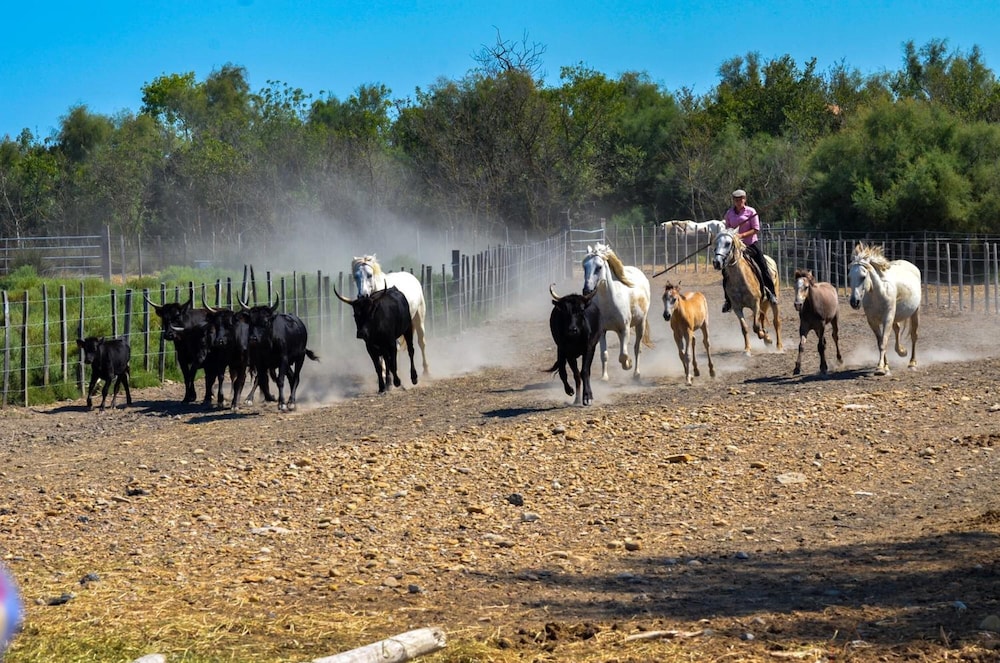 Explore the picturesque surroundings with available bicycles for rent or unwind on the terrace while taking in the stunning views of the Camargue Regional Nature Park.