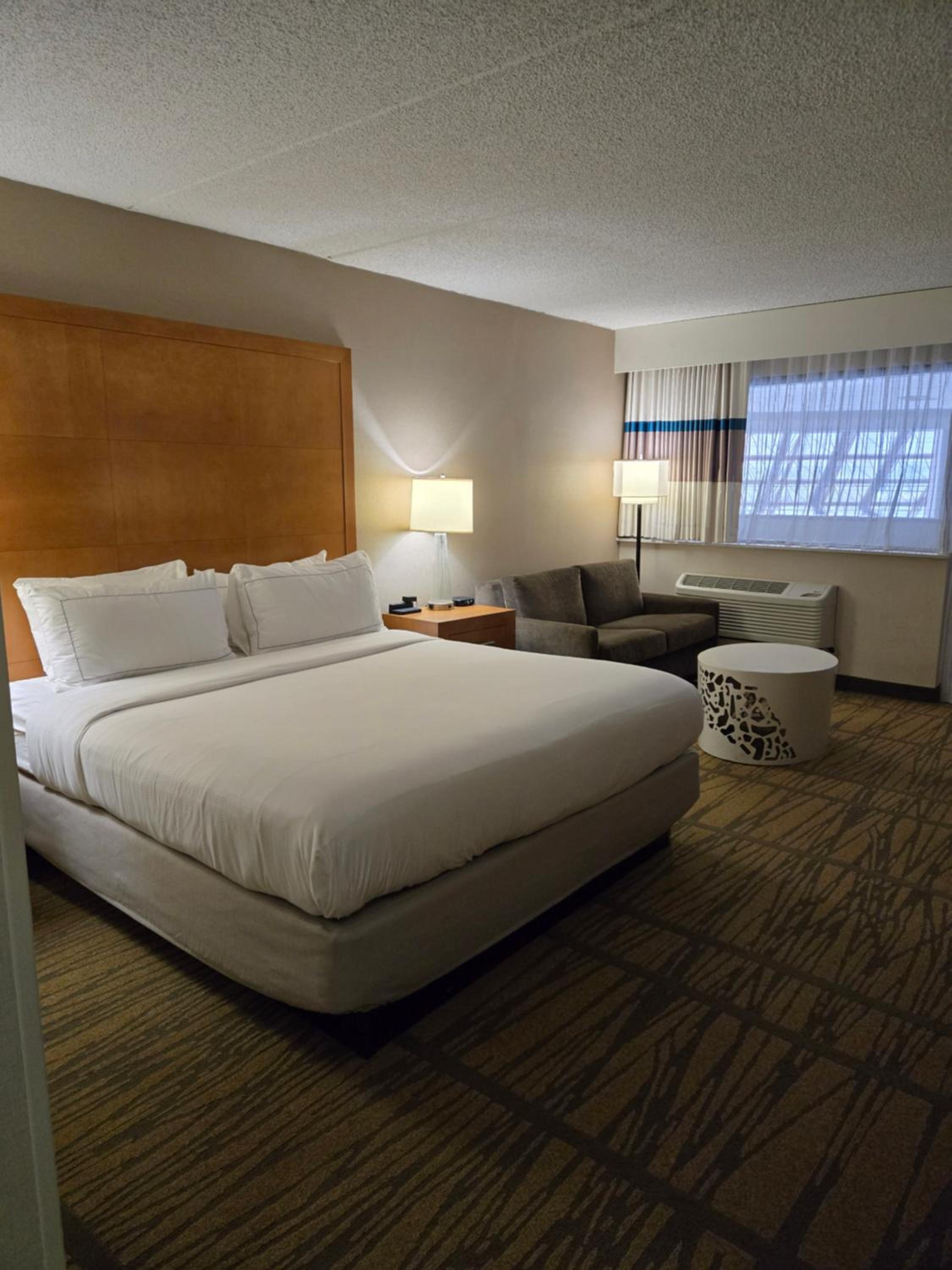Very rude staff upon arrival. I requested an early check-in for 12:30 when I had booked the room. I arrived at 1:30. Lori, the front desk associate, immediately cut me off when I asked to be checked in. She stated that the check-in was at 4 pm. I stated that I requested early check-in upon booking, which was plenty in advance. She then rudely said, " It's not guaranteed we have a full motel today." She then took my info, recited the room that I booked to confirm, threw 2 waters at me, no cookie, and directed me to the 4th floor. We arrived at the room and realized that it was not the room that we had booked. We had booked a king with a tub. We were given a small 2 bed queen with a shower. I was annoyed but decided to keep the room. We settled in and quickly realized that there was no coffee, no tea, and no food available. The Bistro was closed, and no snacks were in sight. The ice machine was broken, and the only drink provided was room temperature water in the atrium. The elevator had something like dried snot on the buttons. The treadmills in the gym area were filthy. We realized that the fridge had to keep being turned back on to stay cold. The food that we bought did not stay cold because of this. People were screaming, running, and slamming doors until 2:30 AM. We did not sleep because of this. Please be aware that the rooms are not at all soundproof. The TV, and remote barely worked. The TV kept shutting off mid show repeatedly. The staff the rest of our stay were very sweet. The hot water was great, and the beds were comfortable. The pool, and atrium are beautiful at night, and there is a cute little cocktail lounge that is open at night.