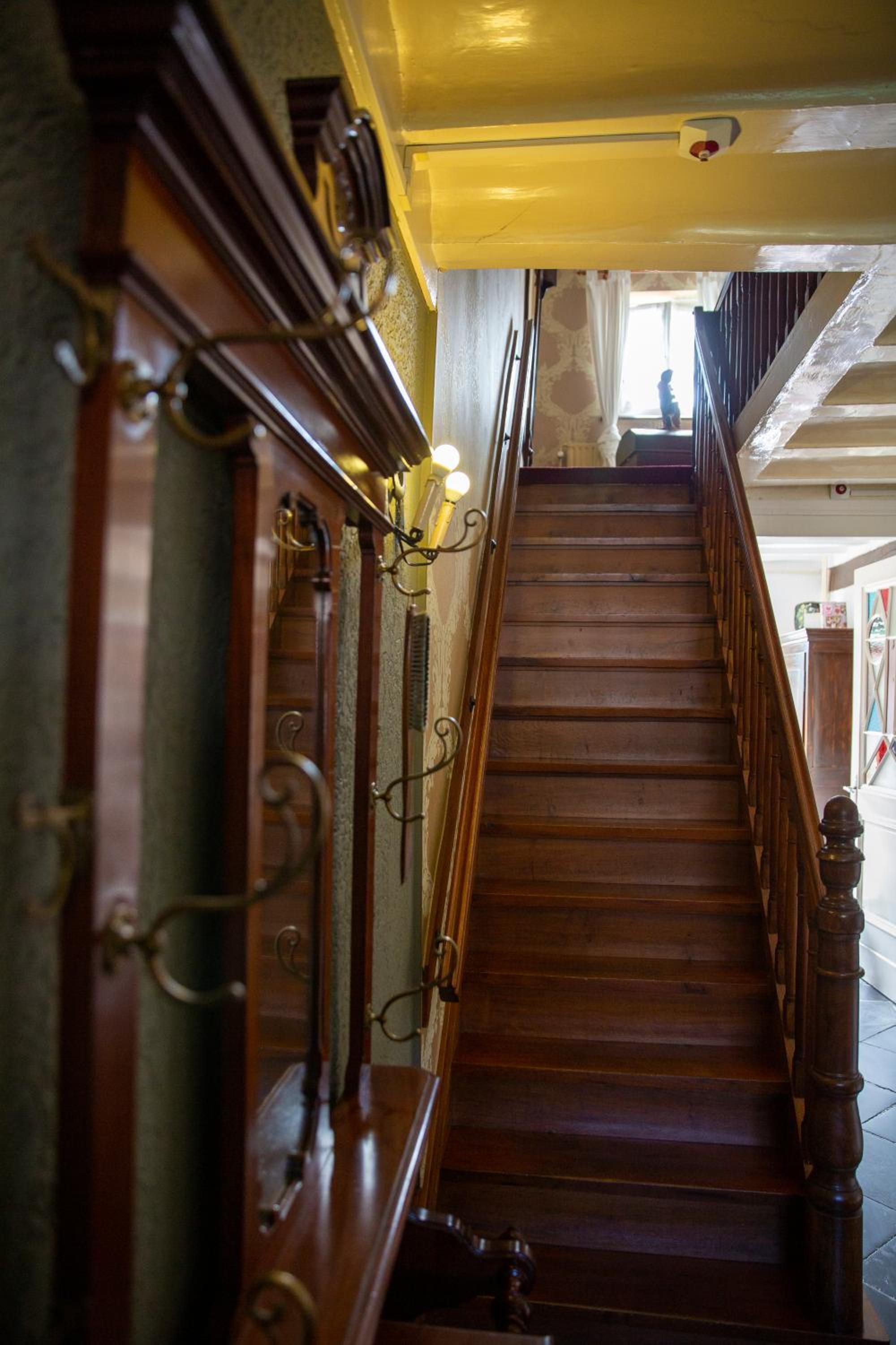 Ach ja, man muss schmale Treppen hinauf/herabsteigen. Ist bei diesen historischen Häusern üblich.
