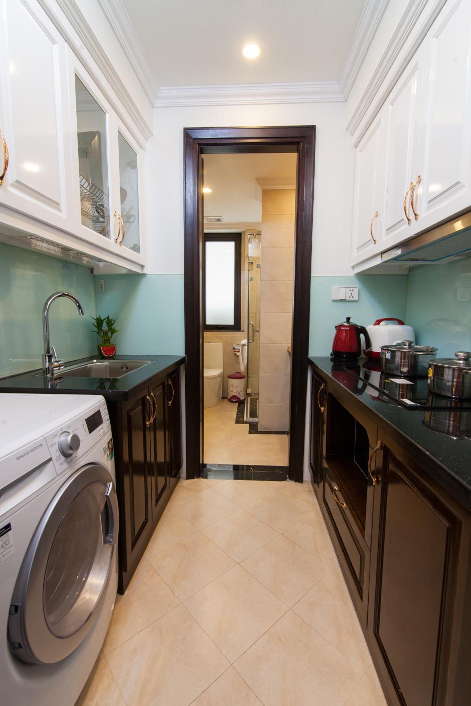 We rented a two bedroom/two bathroom apartment here with a washing machine. The rooms, although dated, are quite spacious and clean.