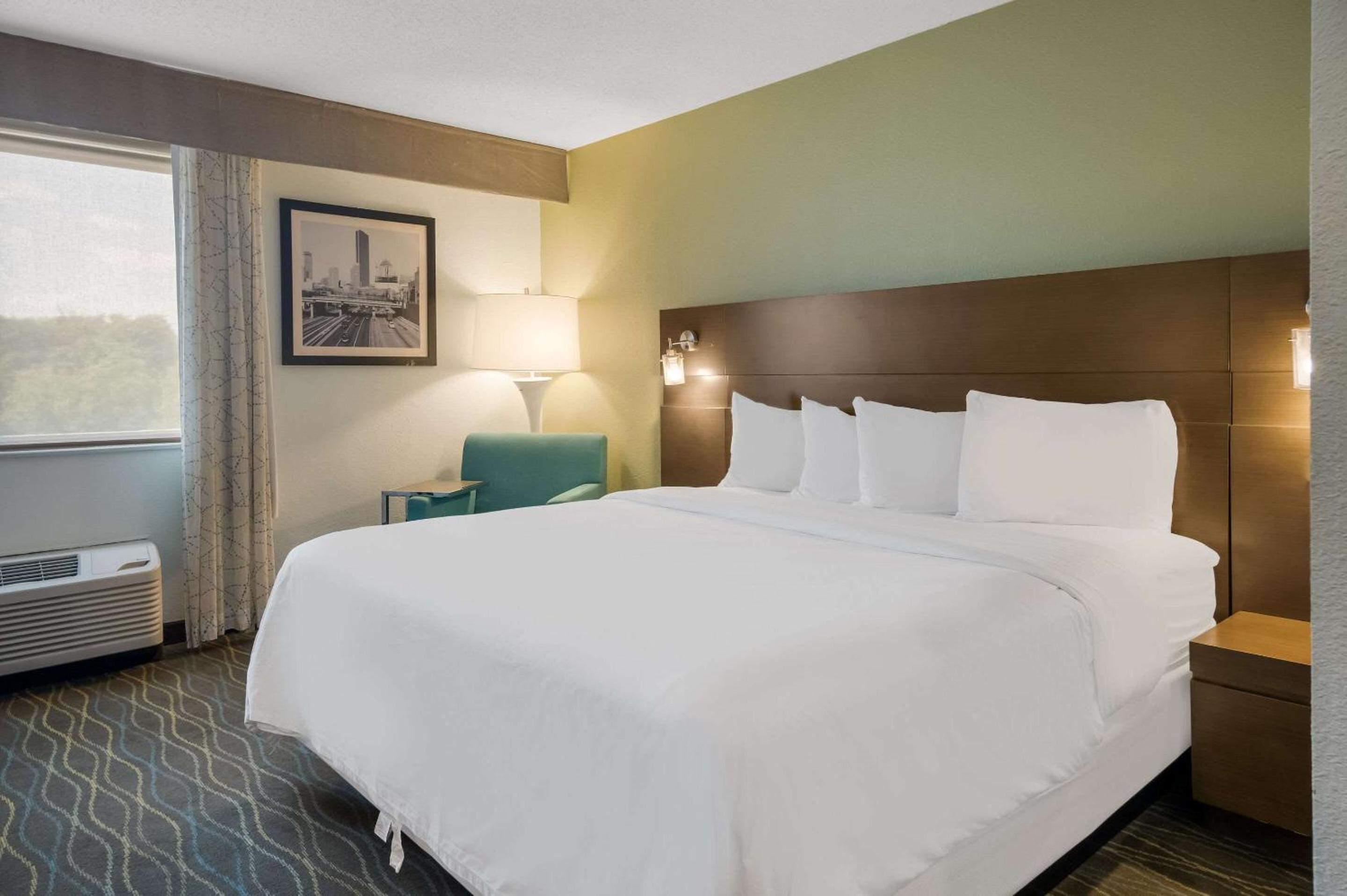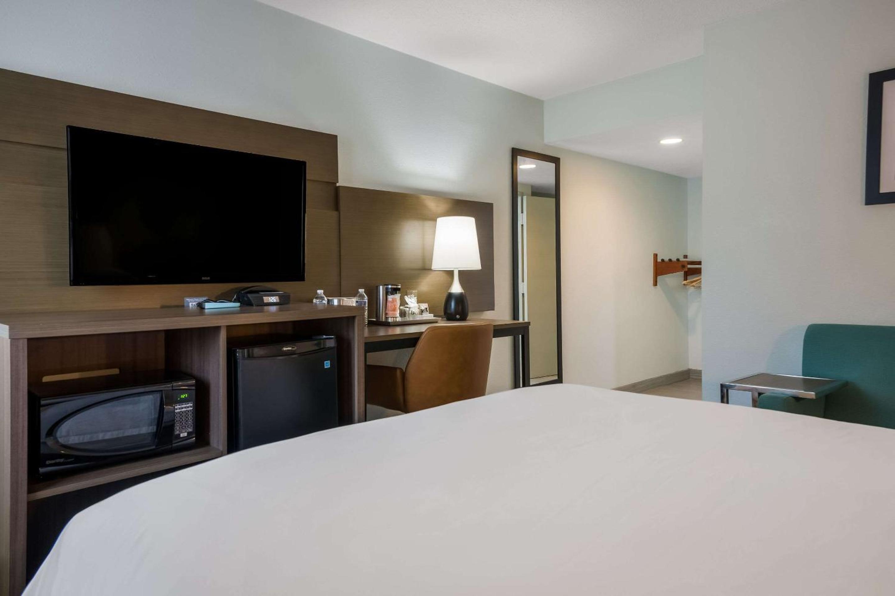 Clean the room better. Crumbs on the floor and counter tops. Hair in the shower. 2 dead bugs. One on the floor in the entryway, and one on the AC unit. Requested a 2 hour early check in which was denied. I showed up 2 hours early to an empty parking lot and waited. There was no TV remote in the room. Pool was closed, elevator wasn't working.