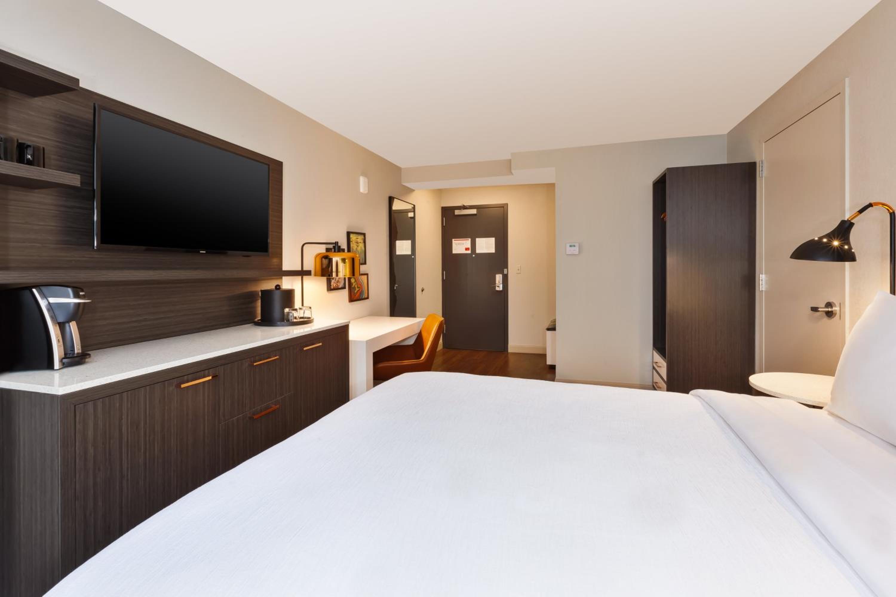 Each room features a 32-inch flat-screen TV, a spacious work desk with an ergonomic chair, a refrigerator, and a coffee maker. In-room dining services are also available for a relaxing meal in the comfort of your room.