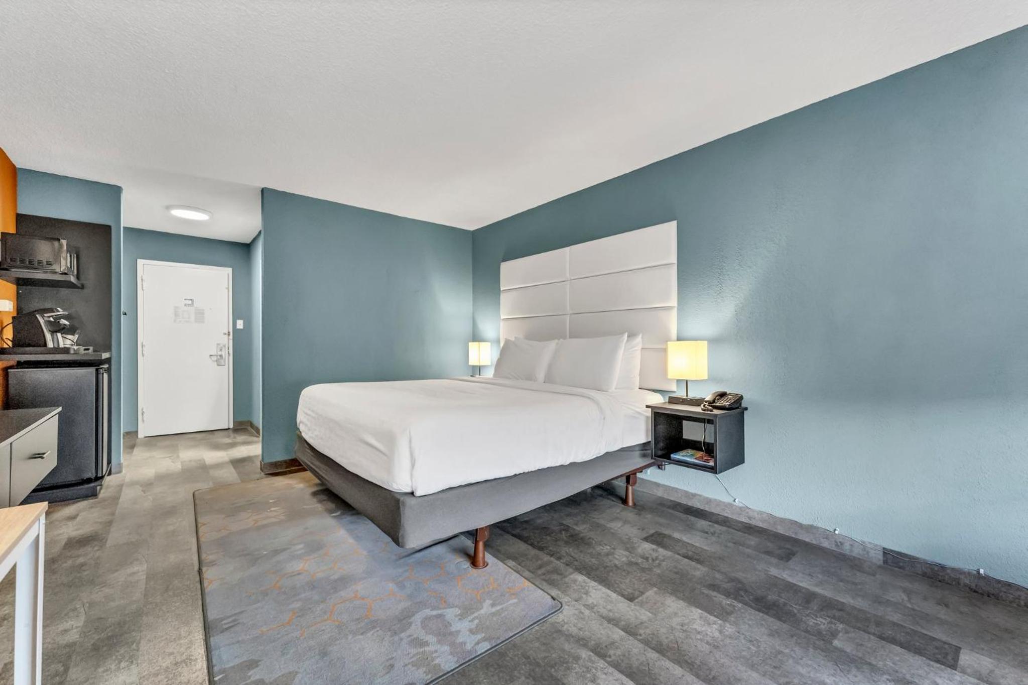 Enjoy spacious rooms with a 43-inch flat-screen TV, free Wi-Fi, and a coffee maker. The contemporary rooms, adorned with green accents, offer a perfect blend of style and comfort.