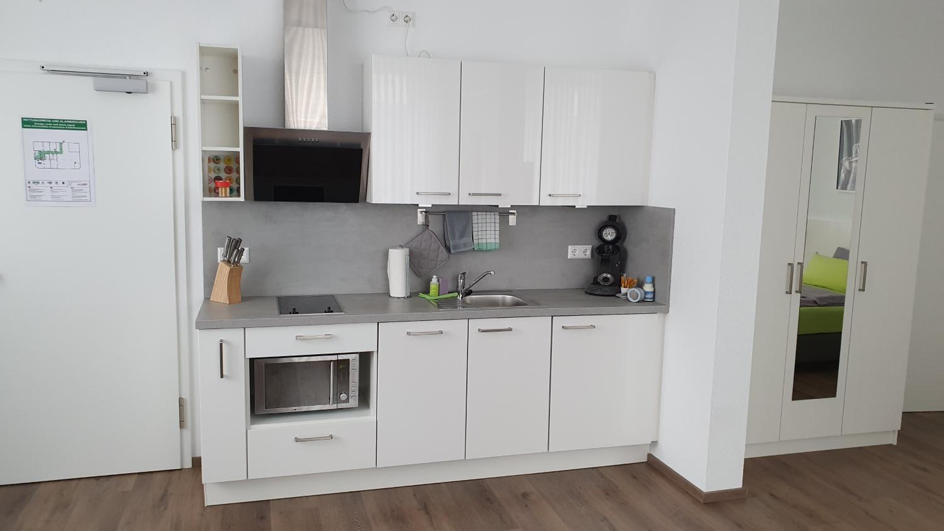 Die Ausstattung ist durchdacht und vollständig. Alles war sauber und es gibt genügend Raum für die eigenen Gegenstände. Ausreichend Steckdosen an den richtigen Stellen sowie, wenn auch klein, aber gut ausgestattete Küche.