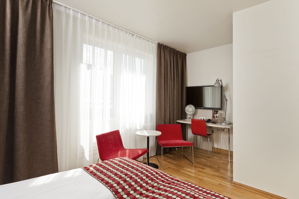 This is a city centre hotel, ten minutes from the Central Station. Very good in many ways but the room was small. A very tight fit around the bed and huge TV. Free coffee and amazing substantial breakfast, a great location for a weekend trip.