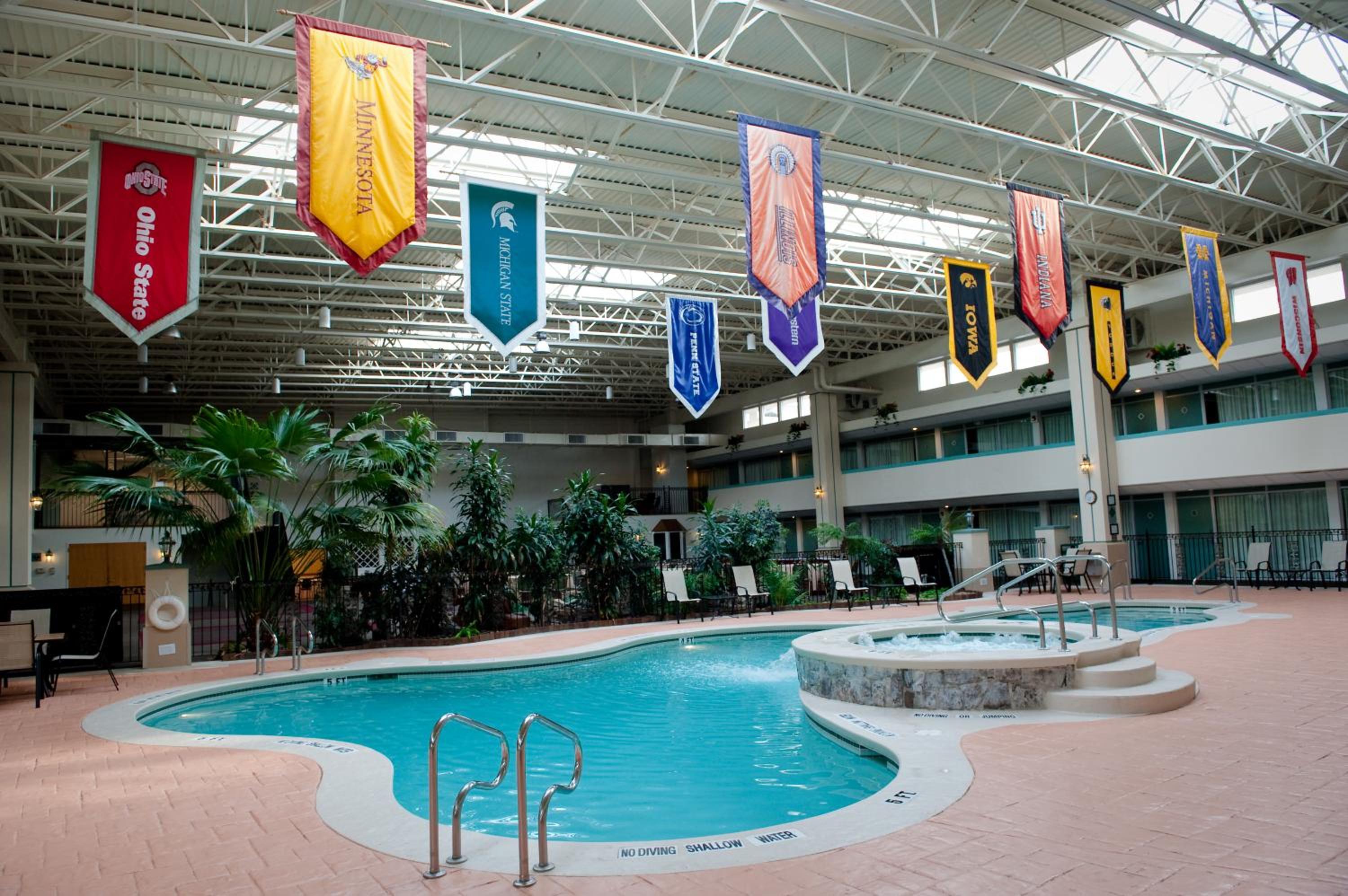 Inside rooms face the indoor pool area. Very loud in the morning with kids swimming. Most of the hotel smells like chlorine from the pool. Our hotel floor was damp from the pool environment and had funny smells from the pool. Low ceilings.