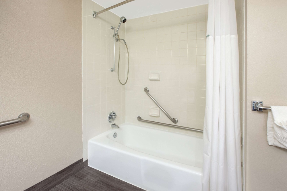 I want to start by saying that our room was very clean & comfortable! The staff we did encounter was friendly! However, the hotel is in a weird area. It’s sort of industrial & rundown with people lurking. Seems there are a lot of long term residents living at this property. The property is clearly older and rundown. Hallway carpets stained, room doors with huge holes & missing handles due to police activity, breakfast was plain bagels, white bread, packets of instant oatmeal & donut holes. Breakfast felt more like a punishment than a way you’d want to start your day. There was never a luggage cart so we resorted to using the wheelchair in the lobby to transport our things to/from the room. This was an inexpensive one night stay for a concert we were attending nearby! Location was convenient to the arena. Someone was being arrested in the parking lot the night we were returning from the concert. The pool area is odd. Appears to have been a nice property back in its day but her age is showing. If you’re in the area for one night, then this isn’t the worst I’ve seen.