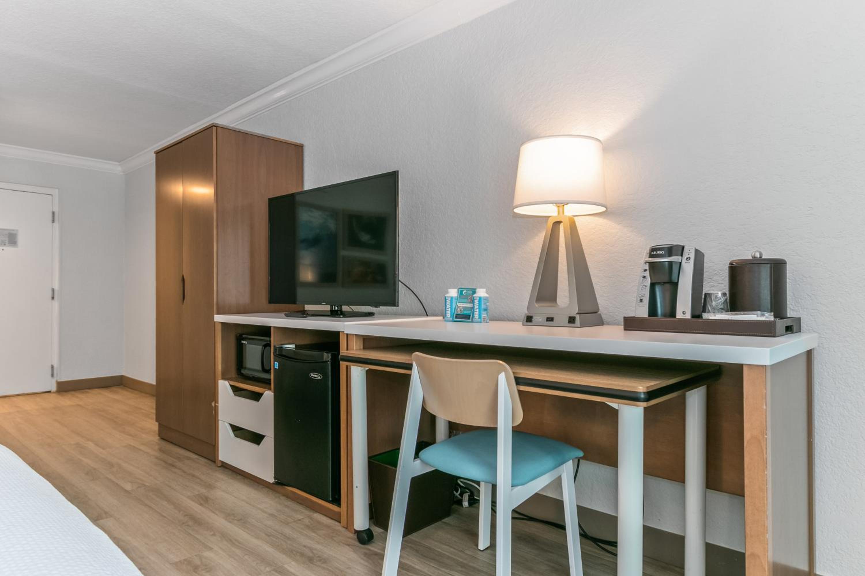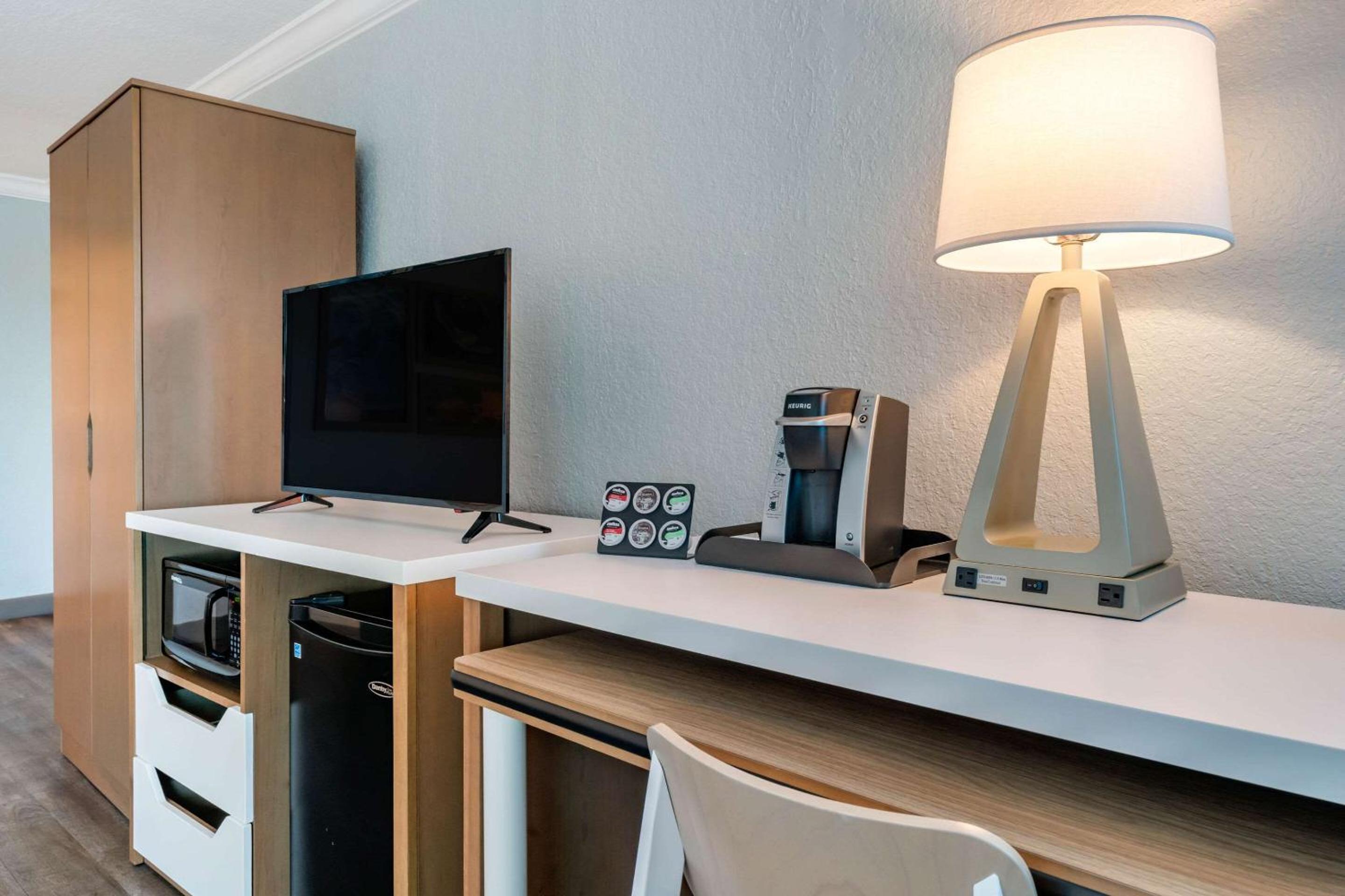 Convenience at Your Fingertips: Enjoy free WiFi, weekday newspapers, and laundry facilities. Each room is equipped with modern comforts like a microwave, refrigerator, and flat-screen TV.