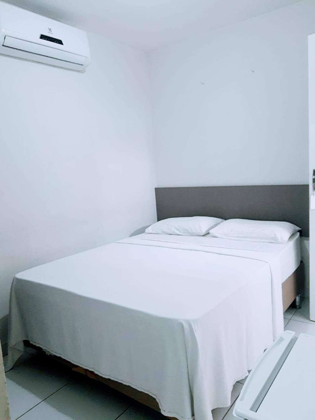 Quarto espaçoso com ar condicionado e frigobar.