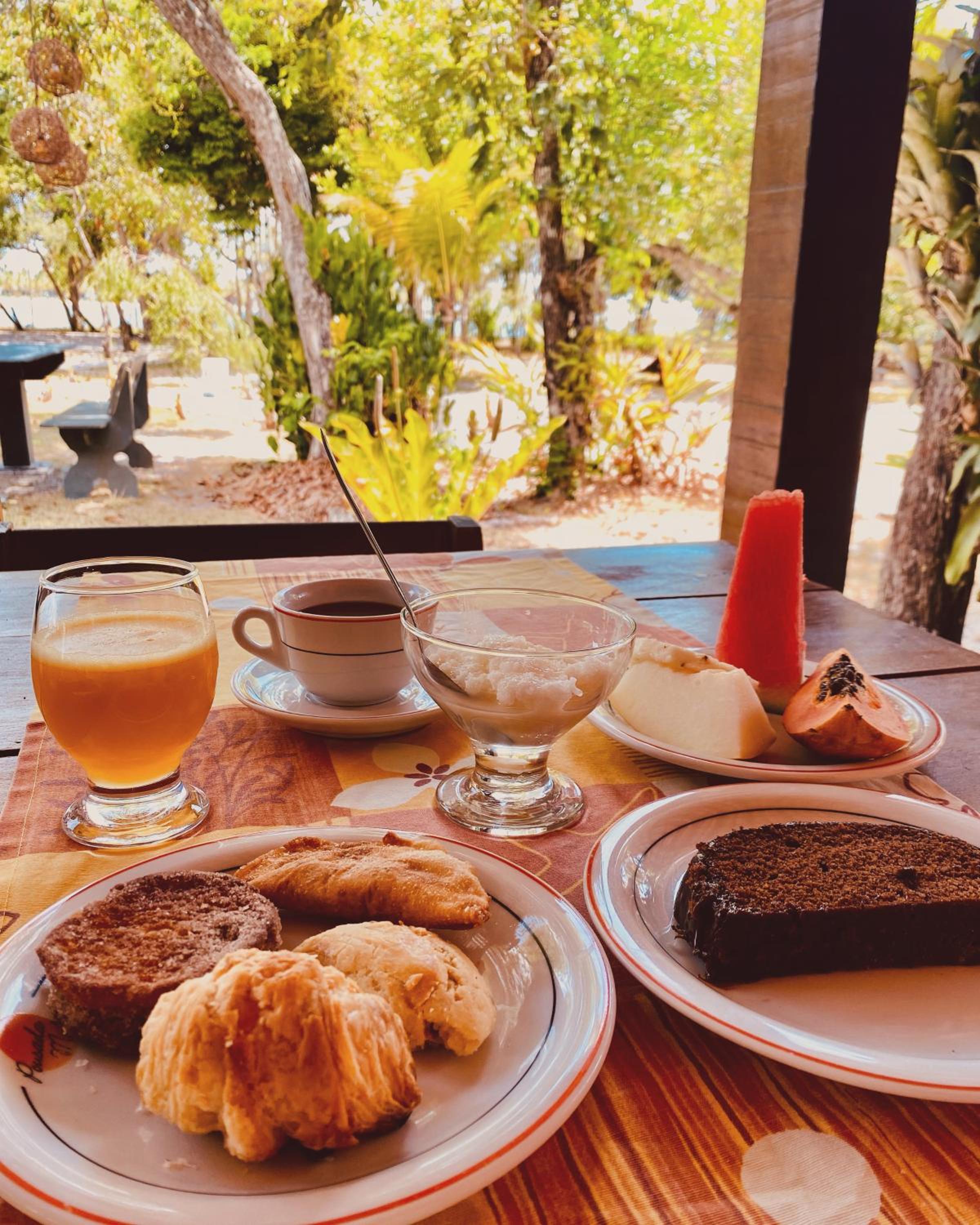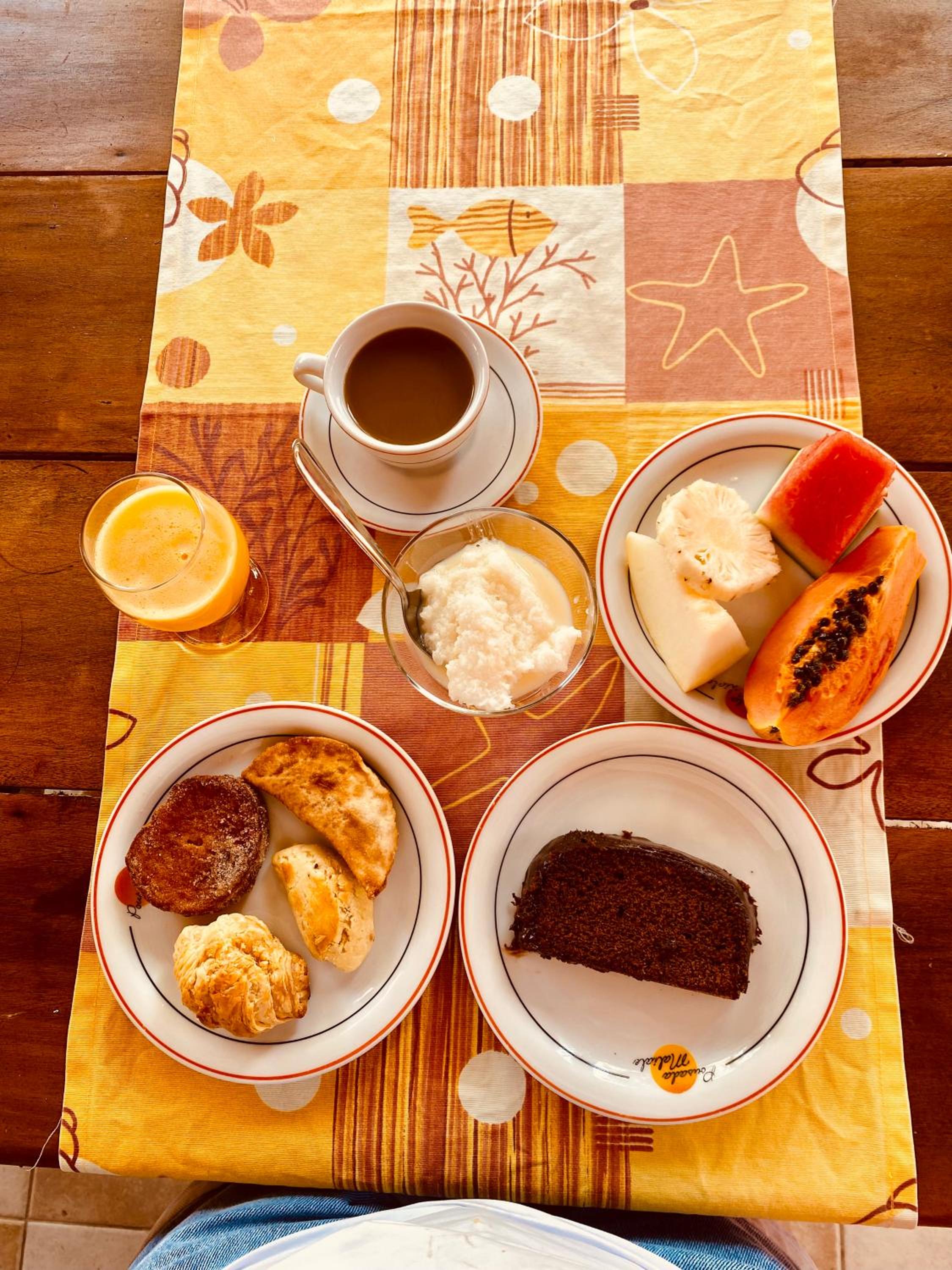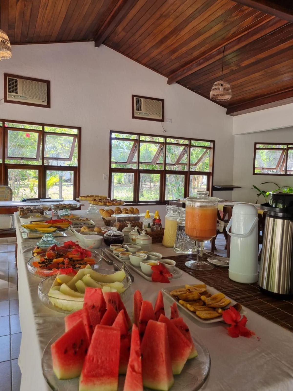 O cafe da manhã, precisa usar telas para proteger os alimentos, aqui tem muita moscas, por ser próximo da mata.