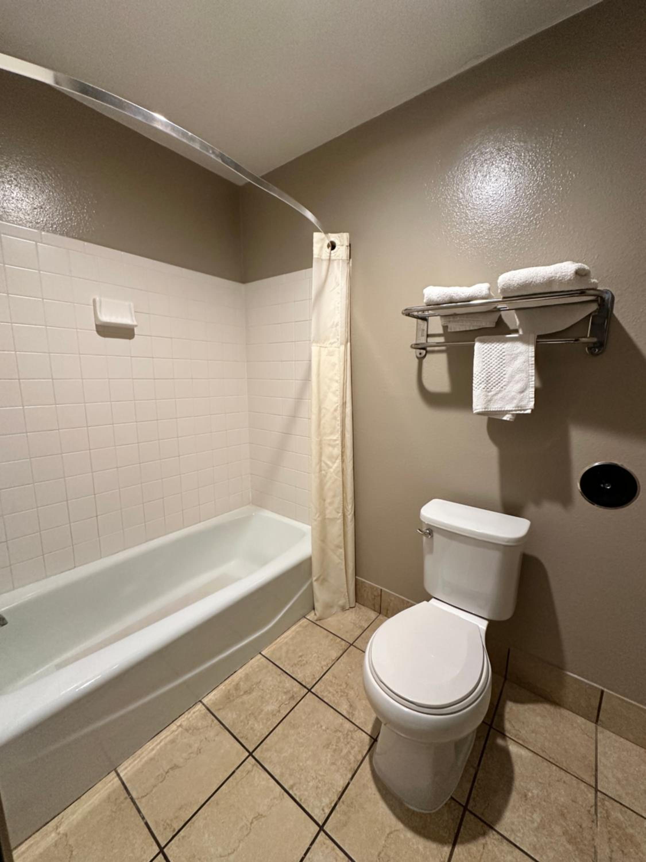 The room smelled like urine. The toilet seat was dirty and coming off the hinges. The tub was rusty.