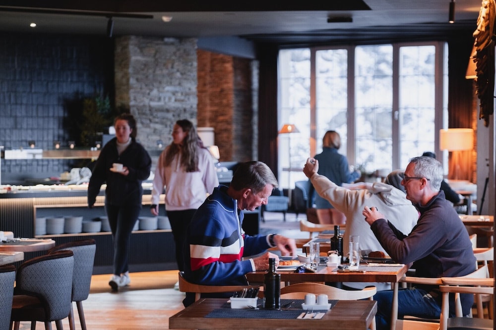 Public areas of the hotel are modern and well kept. The location of the hotel is perfect for skiing and access to restaurants and shops. The breakfast was amazing and well organised. However the bedroom decor was tired and the bedroom was small and felt smaller due to the presence of an extra bed. We were on the -2 level which was directly under the dining room and had the constant sound of chairs being pulled across the floor. Our ‘mountain view’ also included an area piled high with waste as well as the roof of the floor below which had the slate tiles removed ( and stacked on our windowsill). Bar service in the evening was very slow as there seemed to be only one person serving to a packed room. Disappointing for such an expensive hotel!