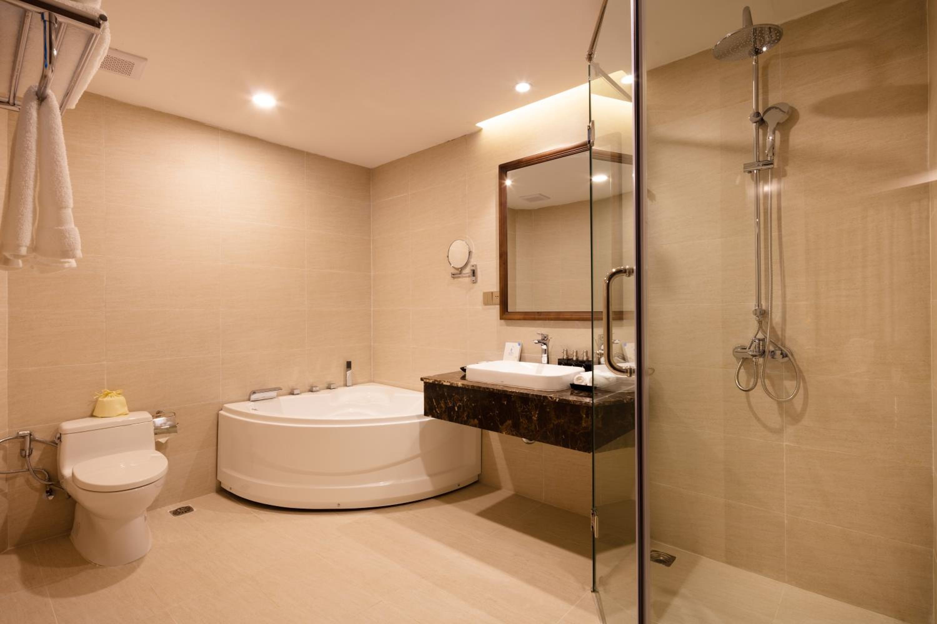 phòng tắm không có chổ đứng tắm... chỉ có bồn tắm... hơi bất tiên khi cần đứng tắm mà không dùng bồn...